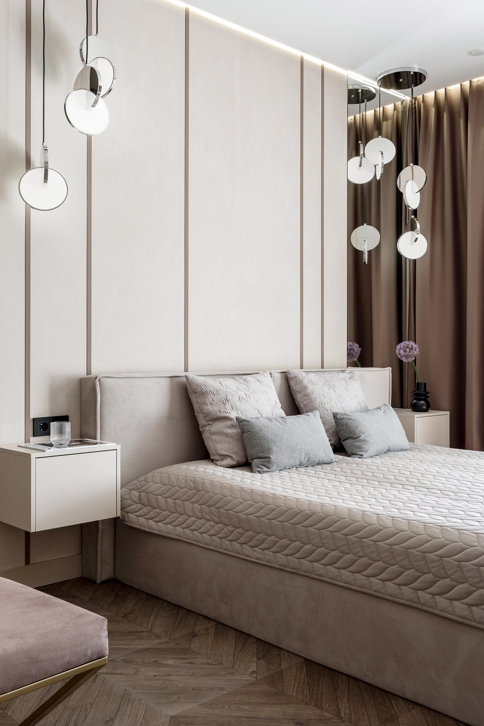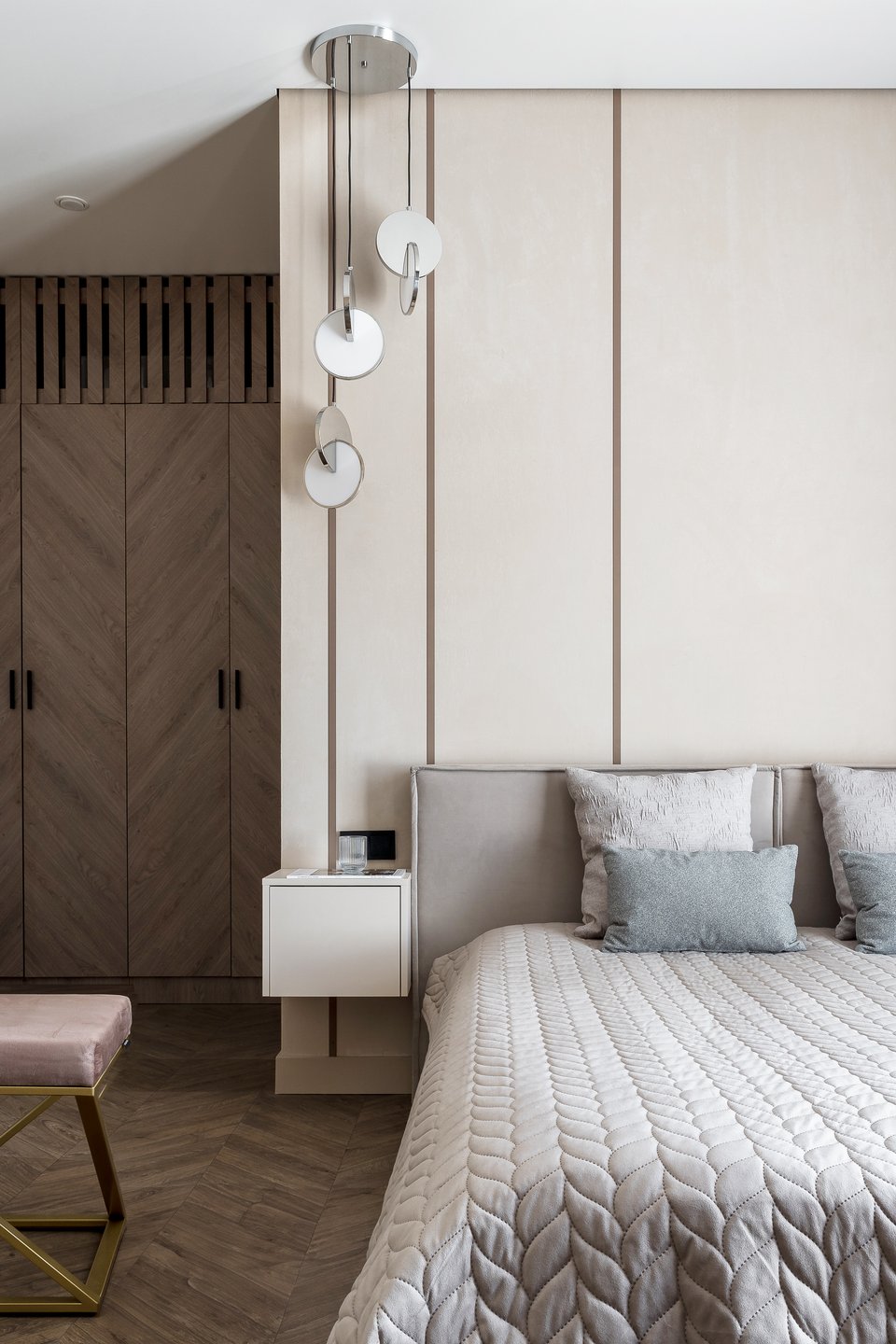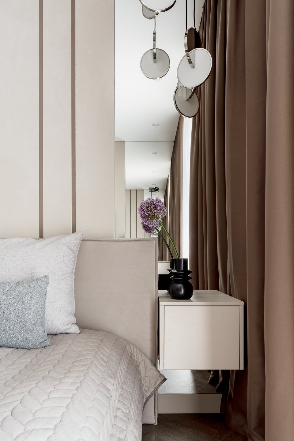 «Основной задачей в организации спальни было создание умиротворенного пространства для отдыха и расслабления после рабочего дня. Шоколадные оттенки в текстиле и фактурная штукатурка на стенах дополняют друг друга, мягкая подсветка и шторы блэкаут превращают комнату в камерное место для уютных вечеров», — рассказывает автор проекта.