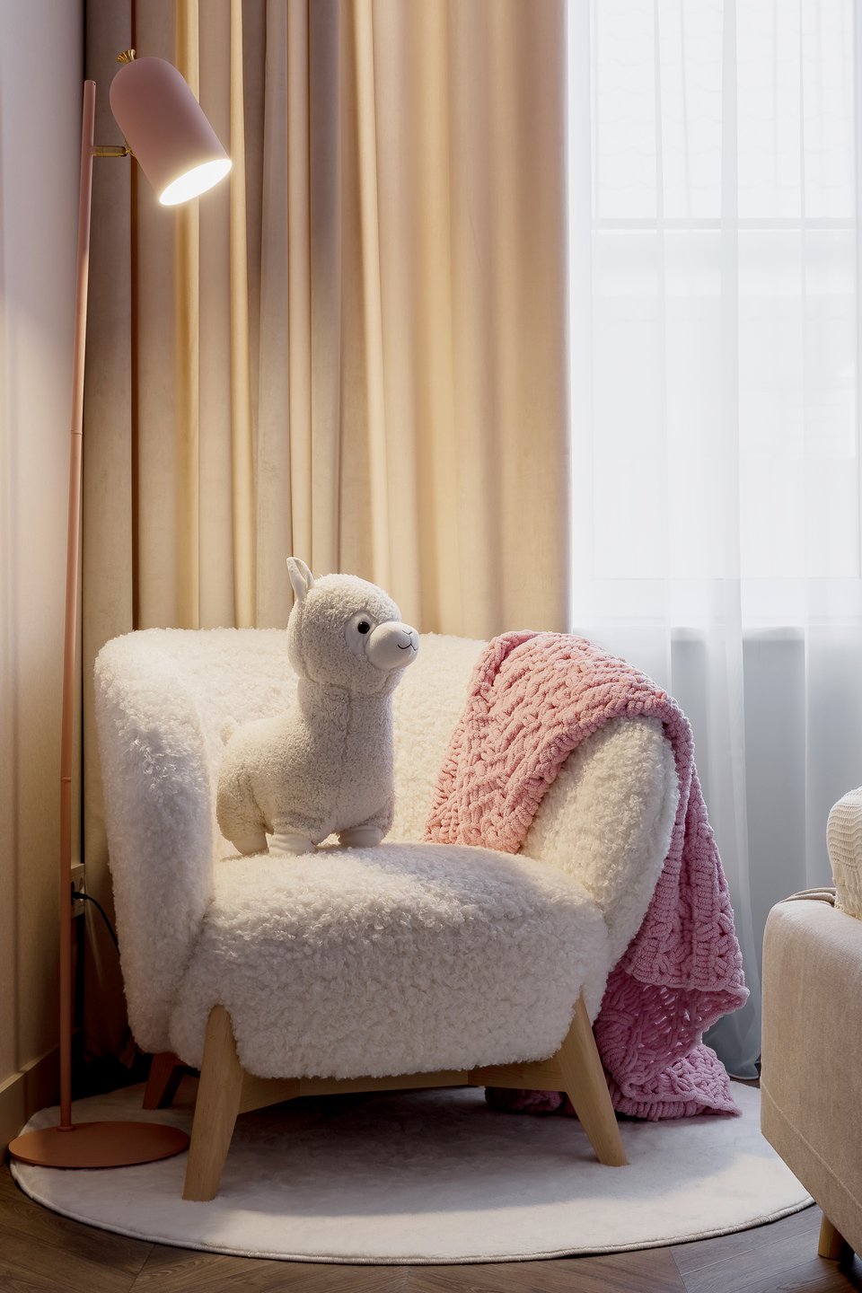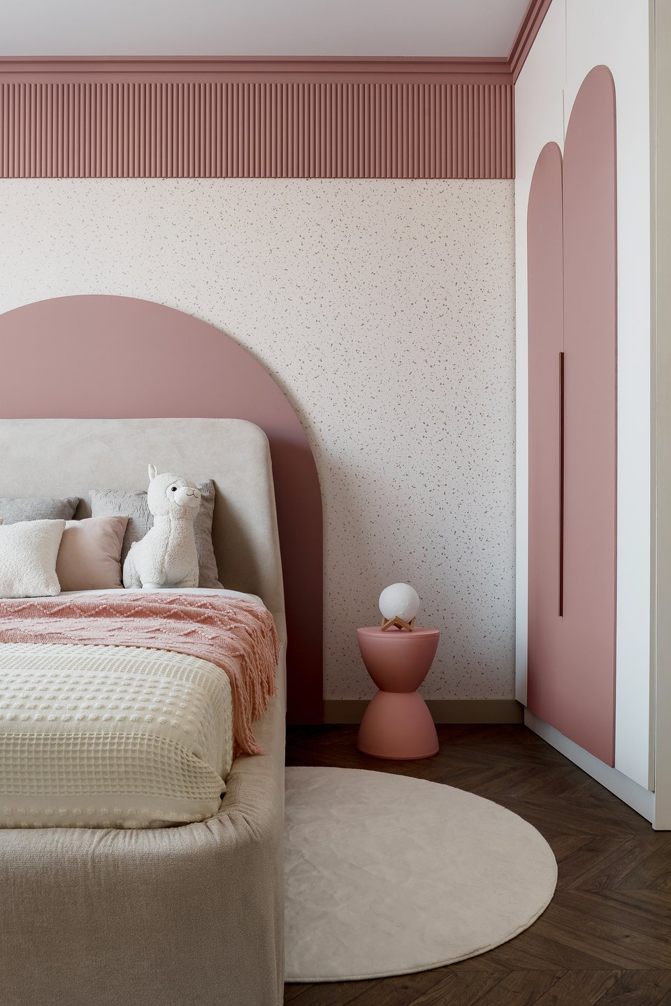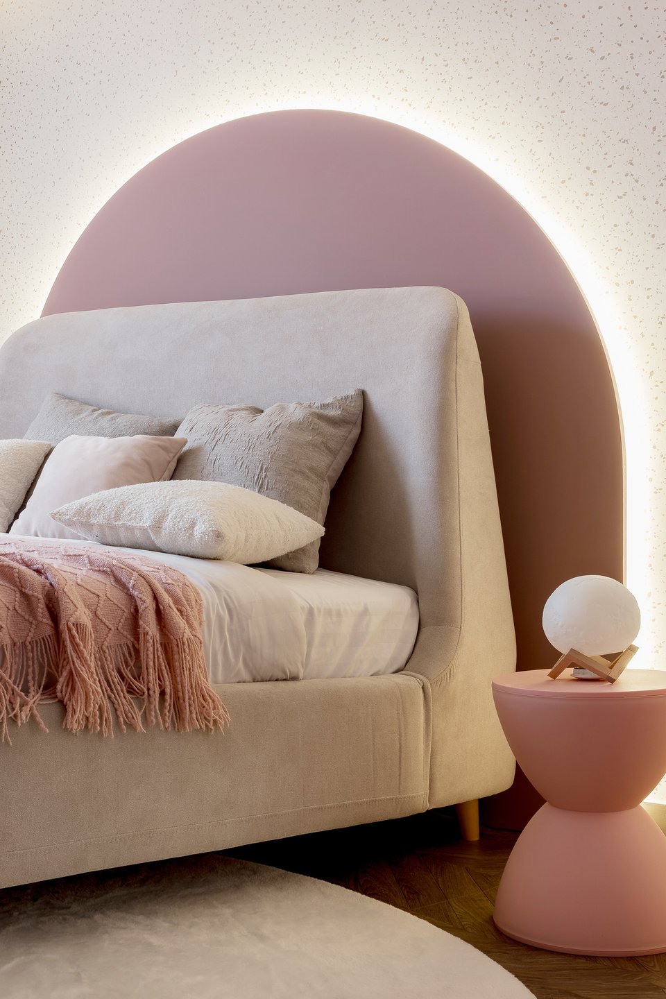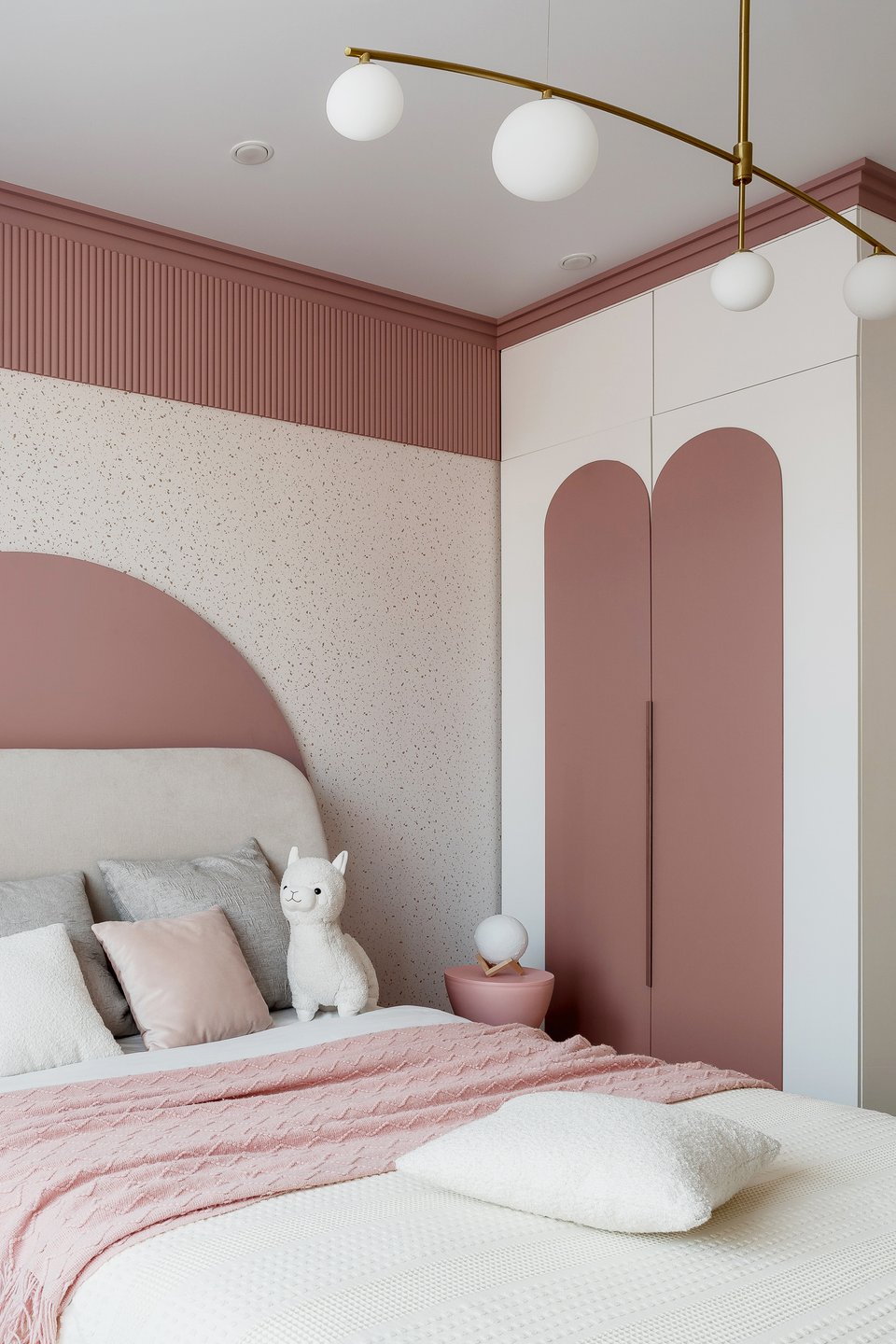 Спальню для девочки превратили в комнату принцессы: на стенах использовали обои с переливом, за изголовьем кровати Молсон от divan.ru установили панель в форме полукруга с подсветкой. Форму полусферы задействовали также в дизайне шкафа и прикроватного столика. Теплый оттенок розового создает в комнате уют и девичью атмосферу.