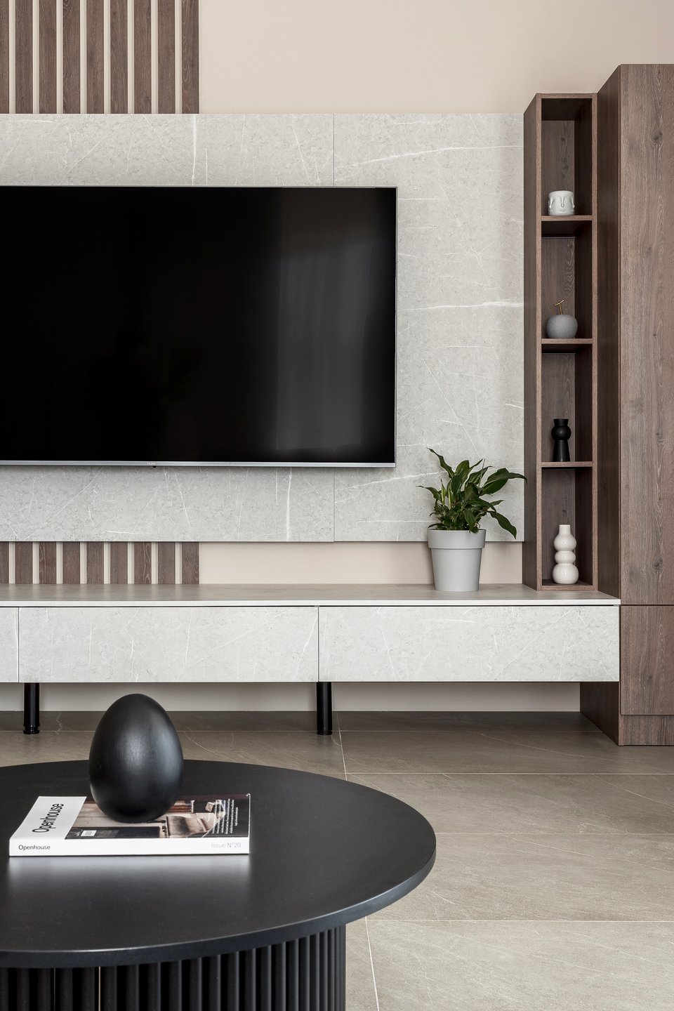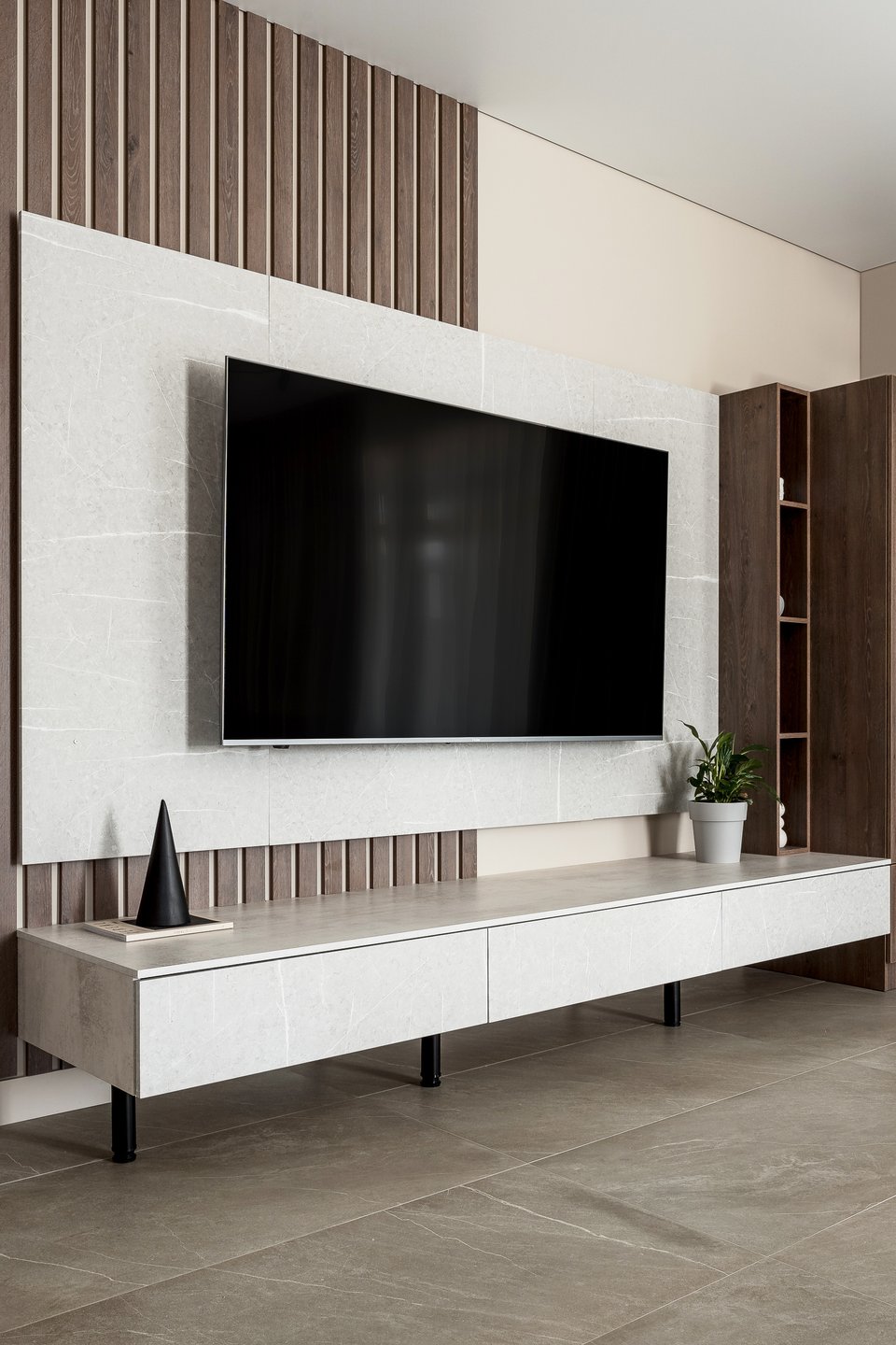 Прием: стену за телевизором в гостиной сделали акцентной — геометрия реек из ЛДСП и цельный мебельный лист под камень задают динамику в этой зоне. Тумбу под ТВ, переходящую в стеллаж и шкаф для хранения, изготовили из тех же вариантов ЛДСП.
