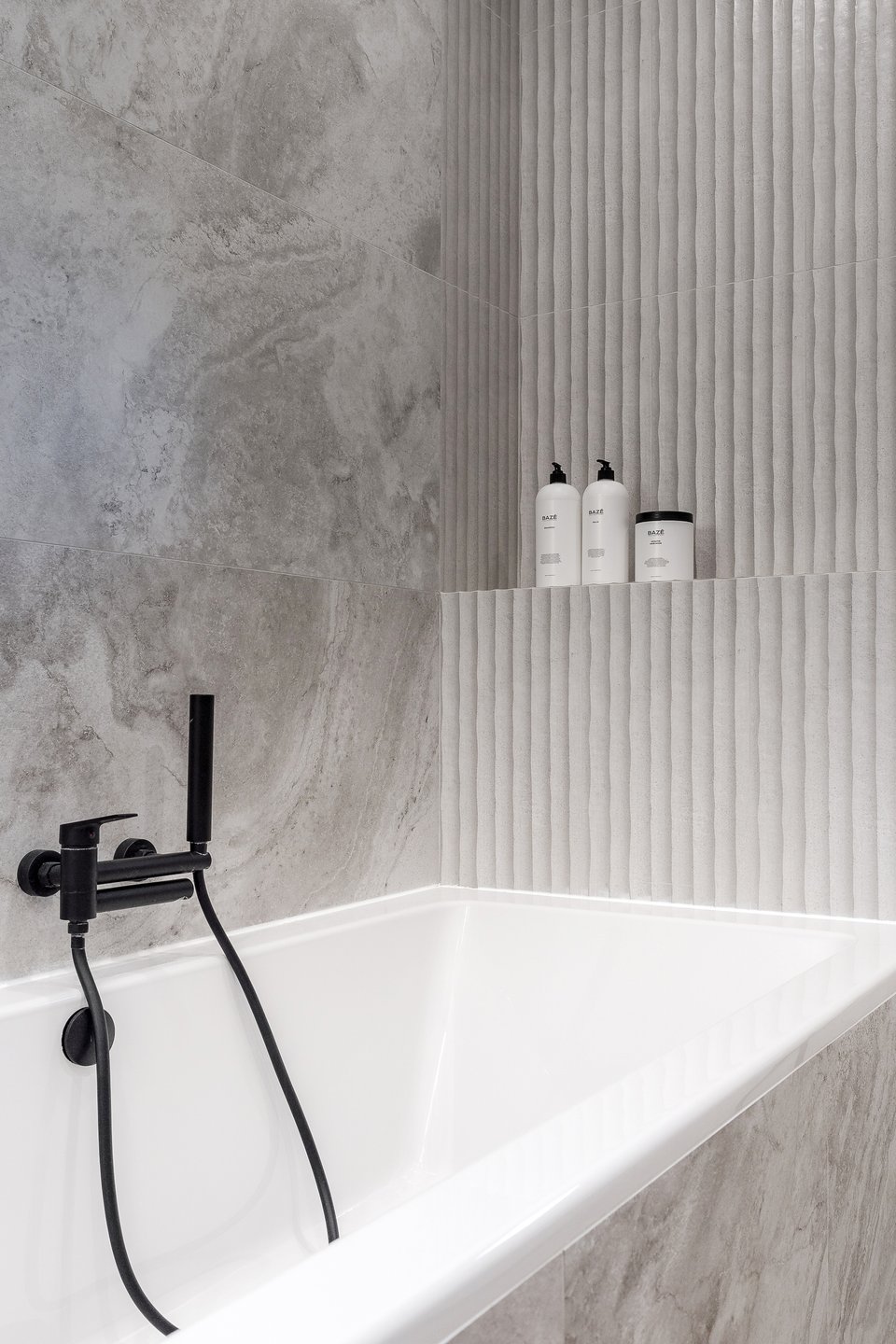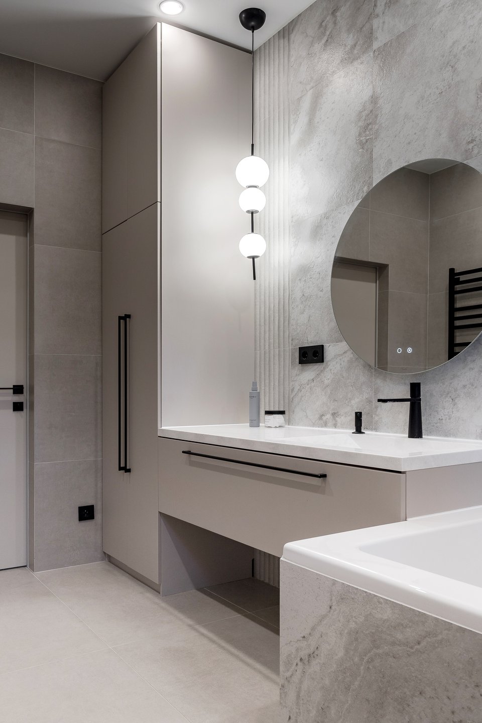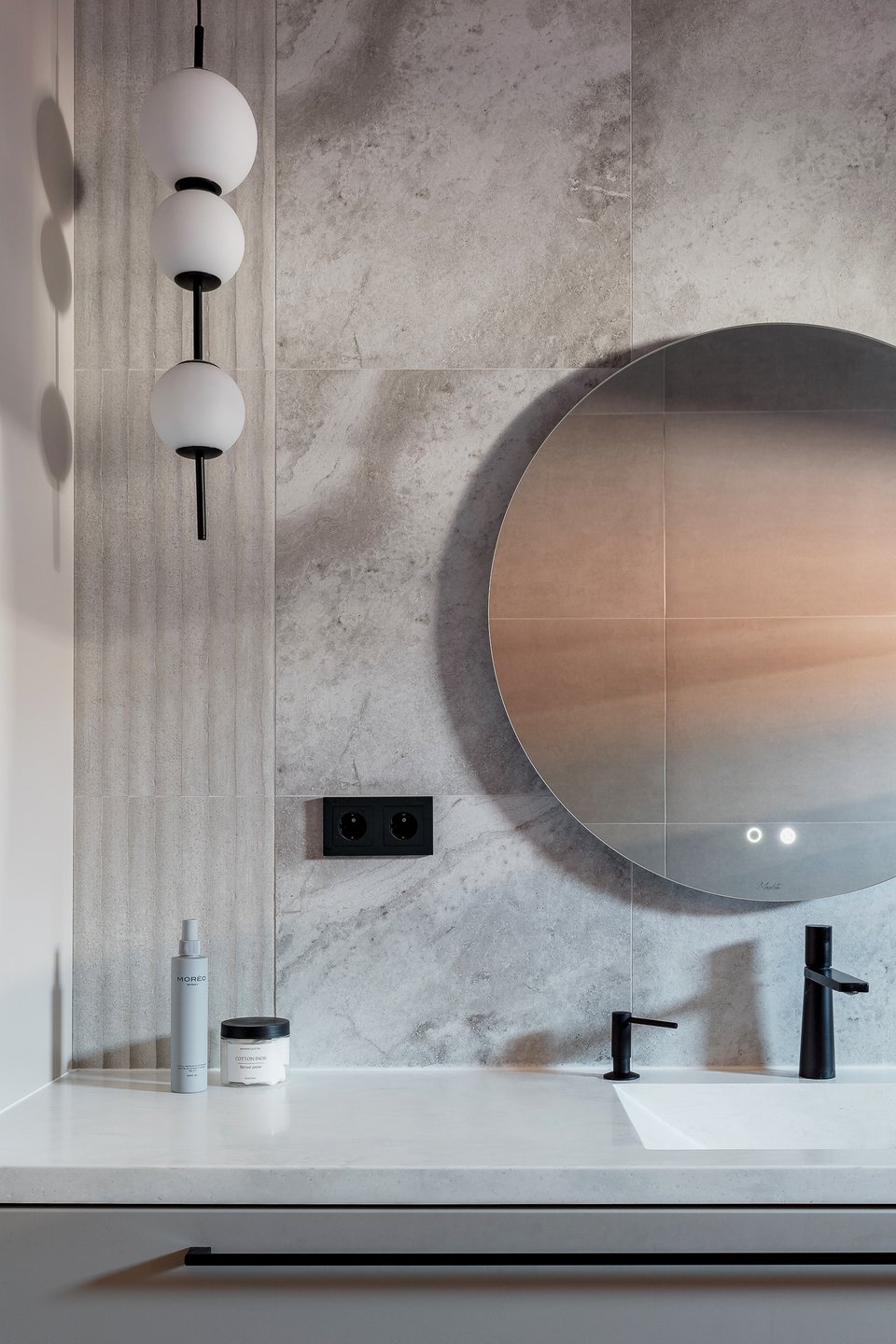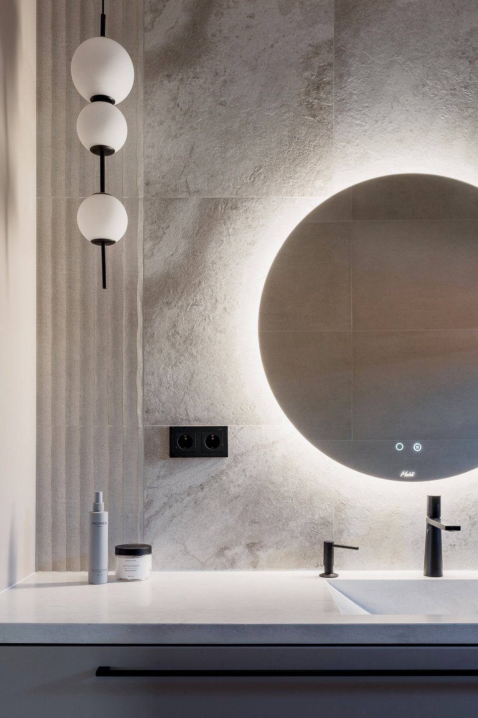 В основном санузле для отделки использовали три типа керамогранита: акцентная гофрированная вставка у зеркала и на полках, керамогранит с фактурой камня и основное бежевое покрытие на полу и стене. Санузел оснащен полноценной ванной, вместительной подвесной тумбой под раковиной, шкафом для хранения банных принадлежностей. Круглое зеркало с подсветкой, подвесной и точечные потолочные светильники отвечают здесь за различные сценарии освещения.