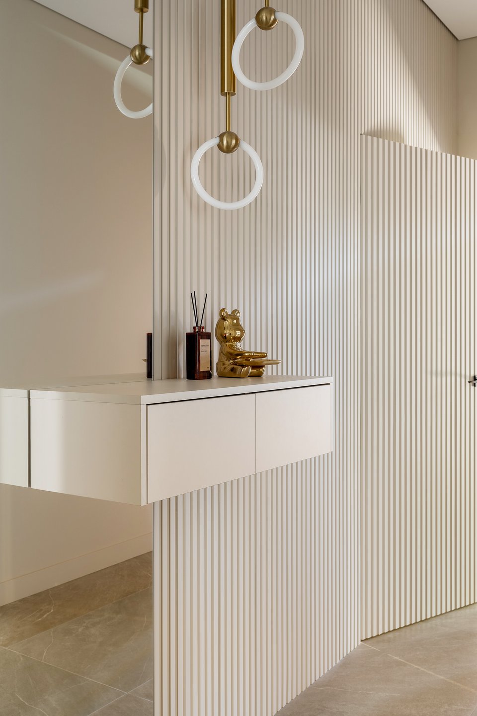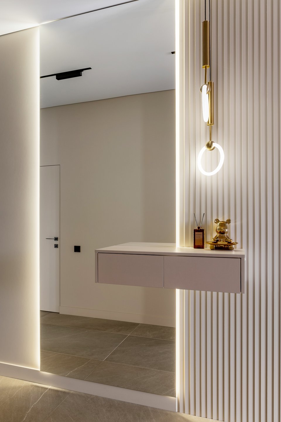 Прихожая встречает своих хозяев светлым интерьером и ярким освещением. Реечная стена отвечает во входной зоне за эффект динамики. Крупноформатный керамогранит на полу оттеняет цвет стен и практичен в использовании.