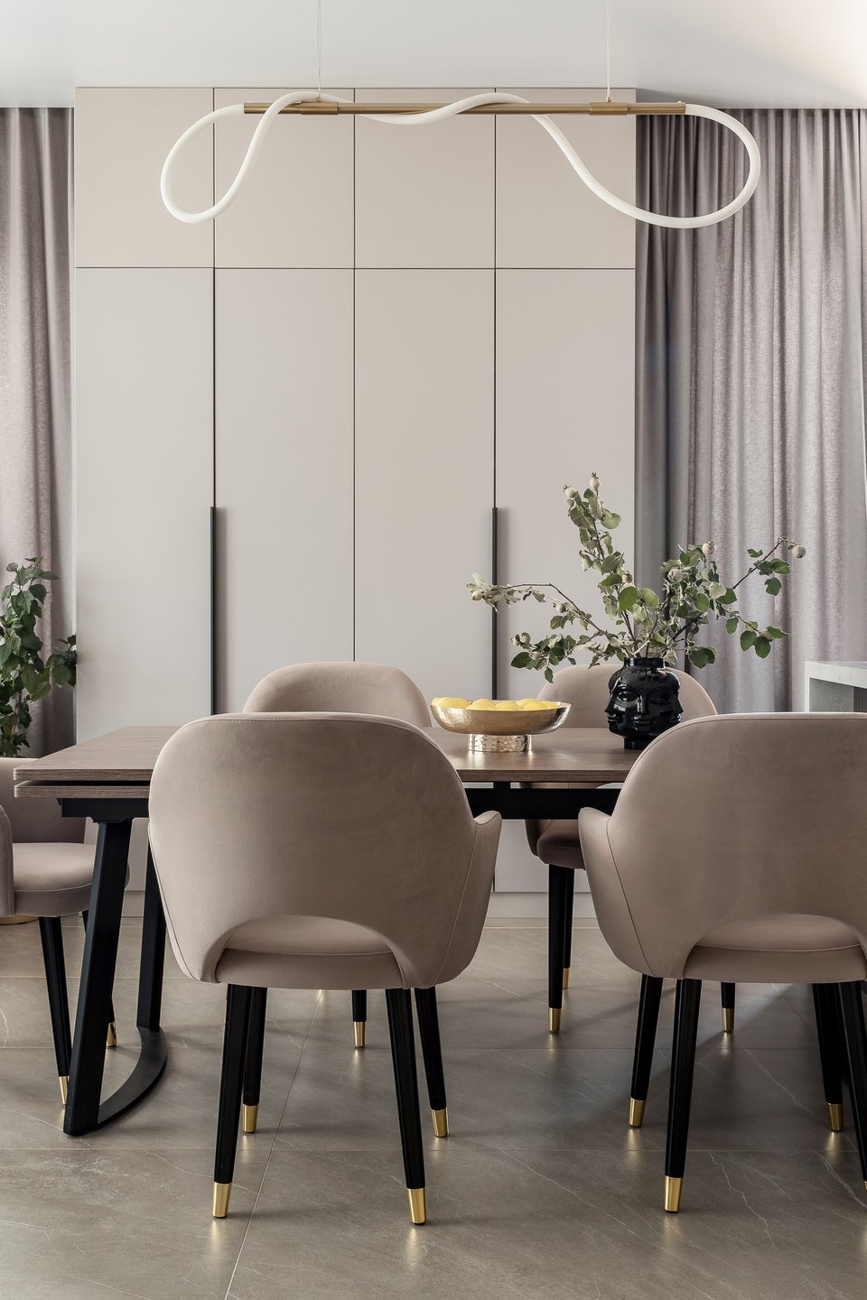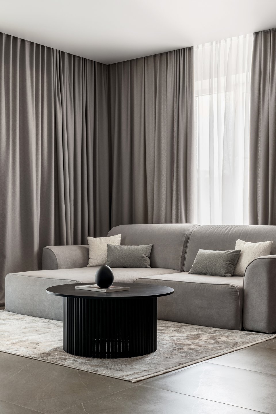 - Современный интерьер, сочетающий оттенки графита и бежевого.