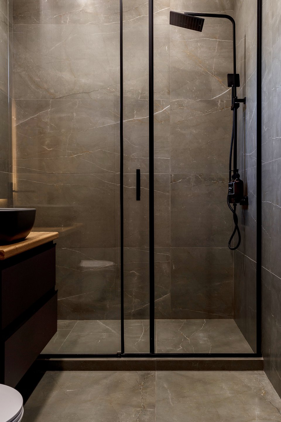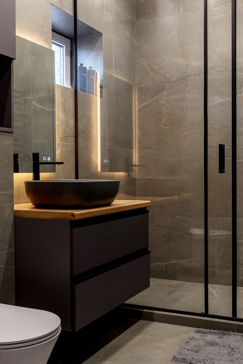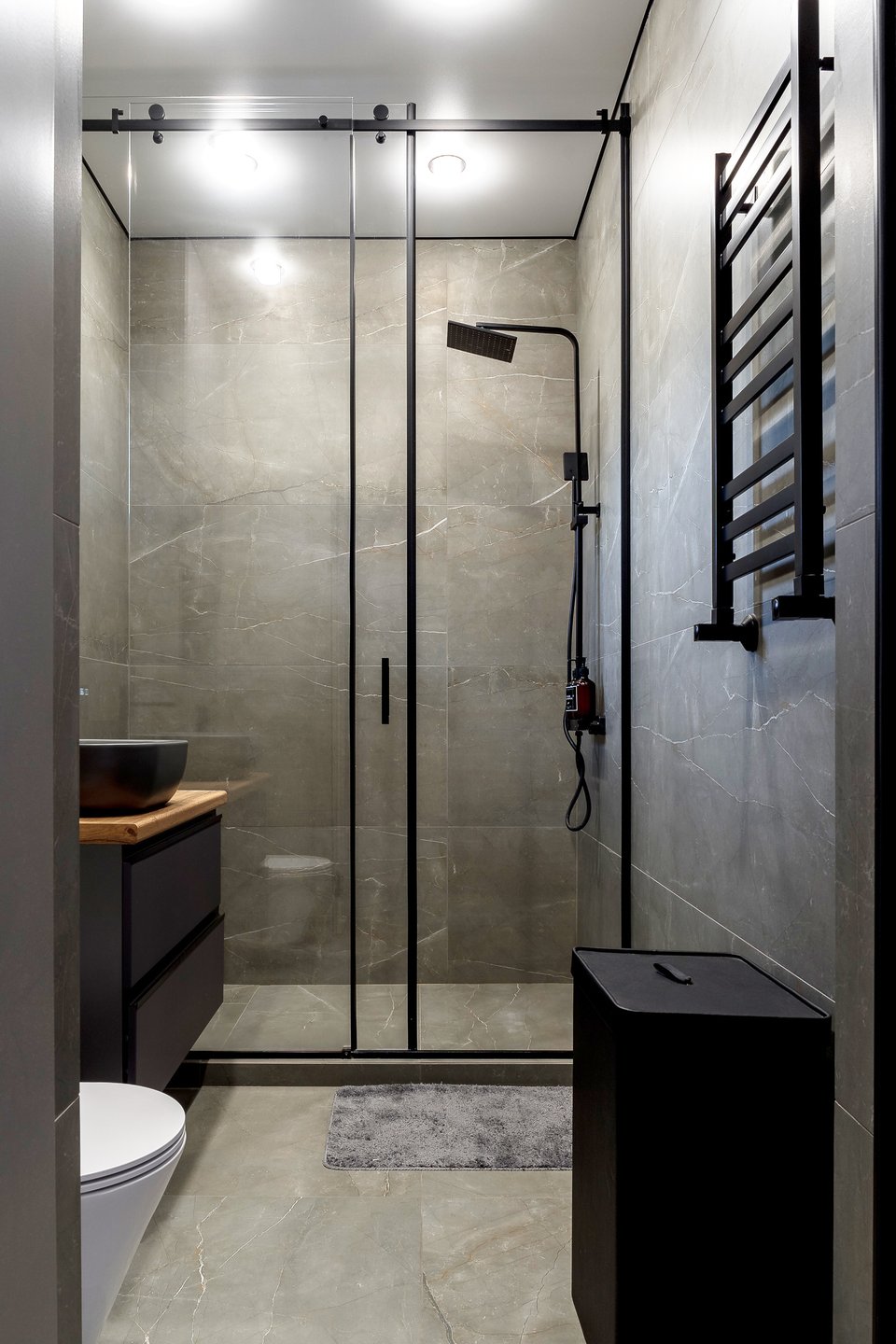 Для отделки санузла при спальне использовали керамогранит в темных серых оттенках. Местом для хранения здесь служит тумба под раковиной с выдвижными ящиками и открытая полка над унитазом. Акценты расставили графитовым оттенком смесителей, профиля душевой и полотенцесушителя.