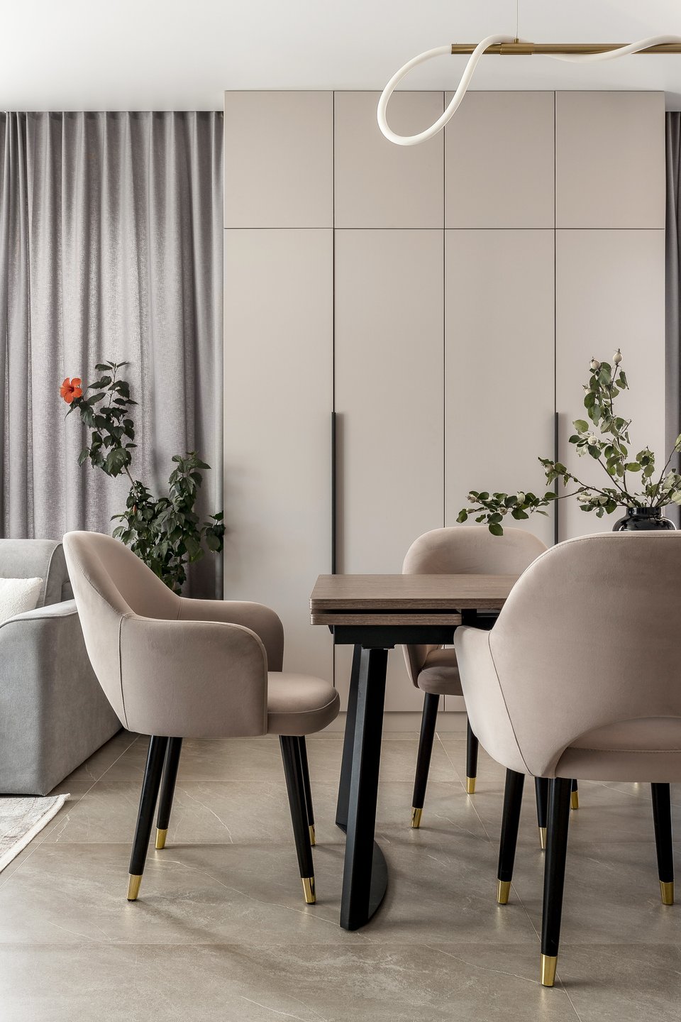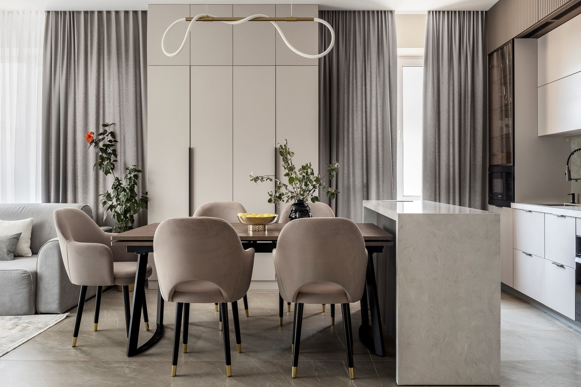 Комната площадью 42 кв.м разделена на две зоны: кухню с островом и обеденным столом, а также гостиную для отдыха и приема гостей. По правую руку от гарнитура находится вход в кладовку-постирочную — благодаря использованию скрытых дверей он «растворяется» в пространстве.