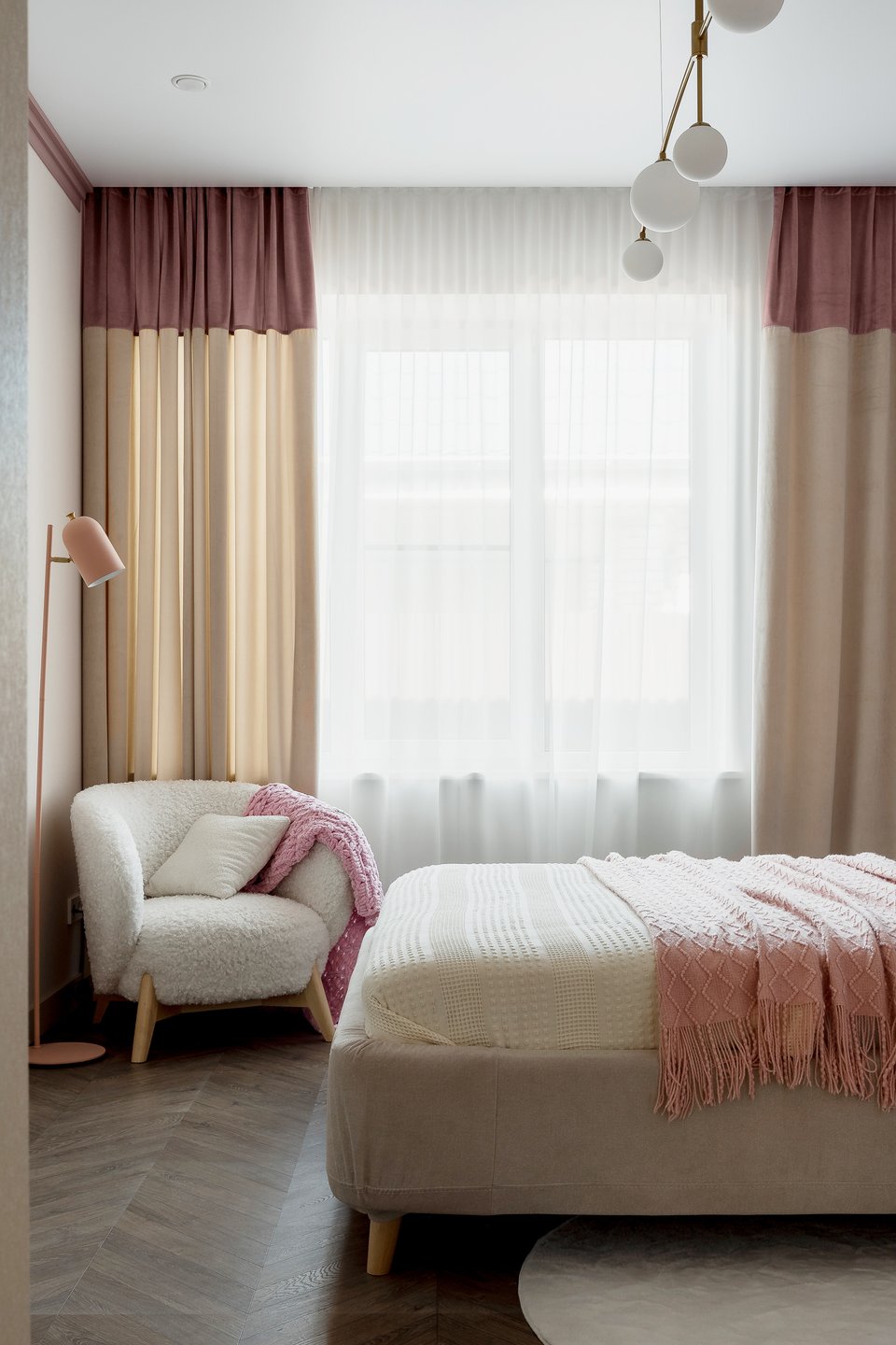 Деталь: кант на портьере «продолжили» на стене в виде окрашенного в тот же тон потолочного карниза. Прием объединил пространство комнаты и подчеркнул высоту потолков.