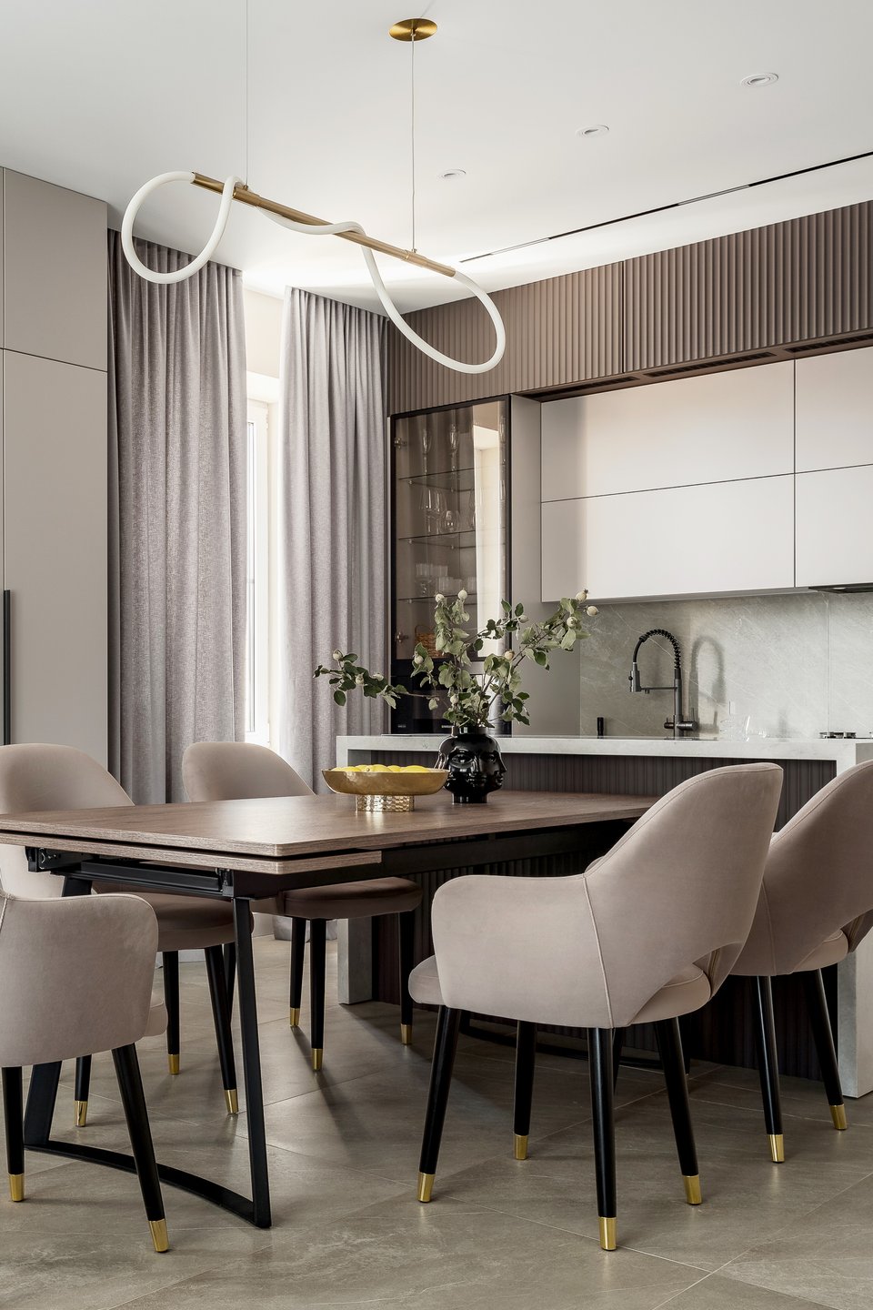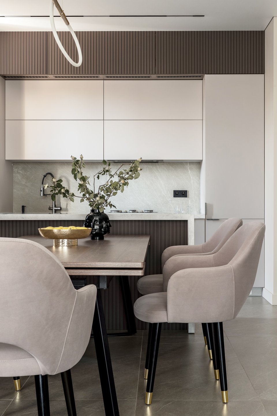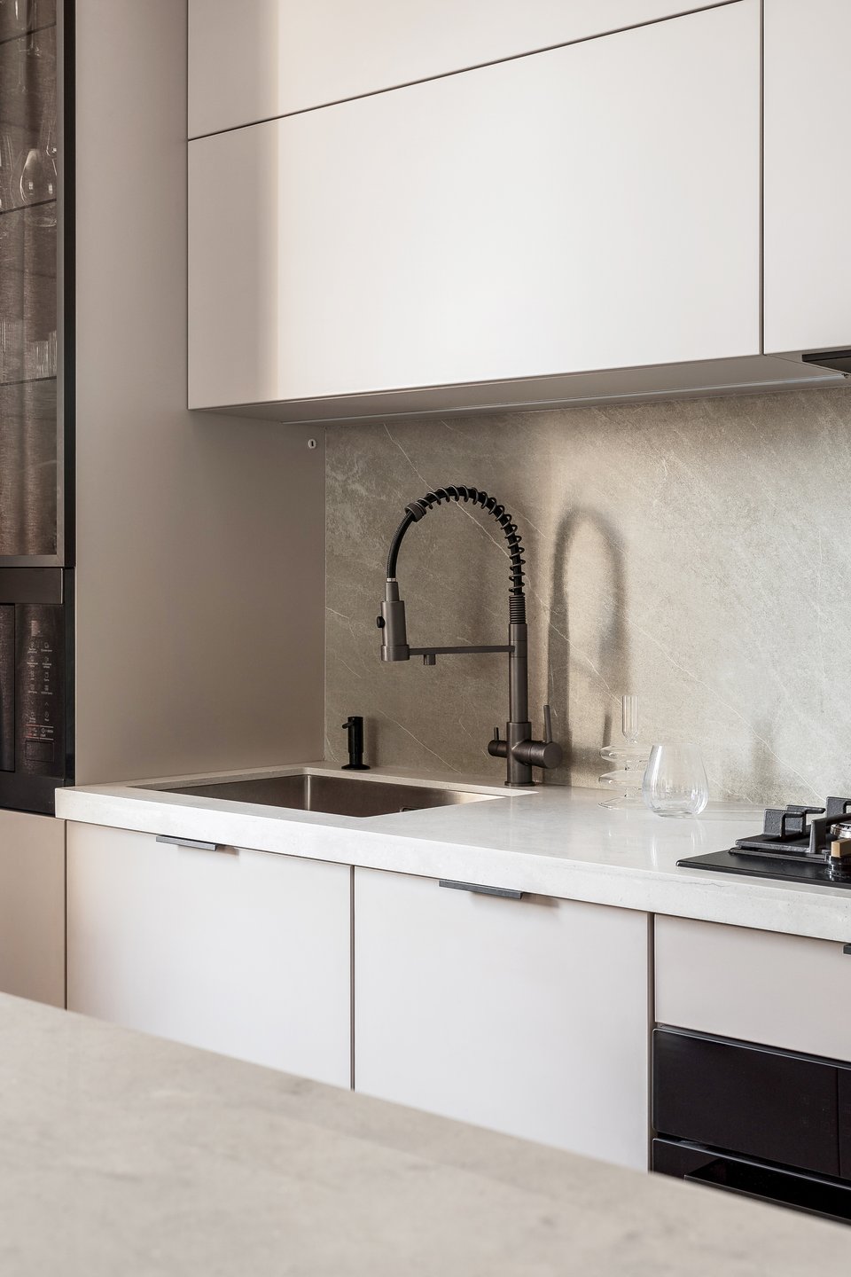 Обратите внимание: фартук гарнитура выложен керамогранитом из той же коллекции, что и основная плитка на полу — таким образом избежали визуального шума в оттенках и фактурах.