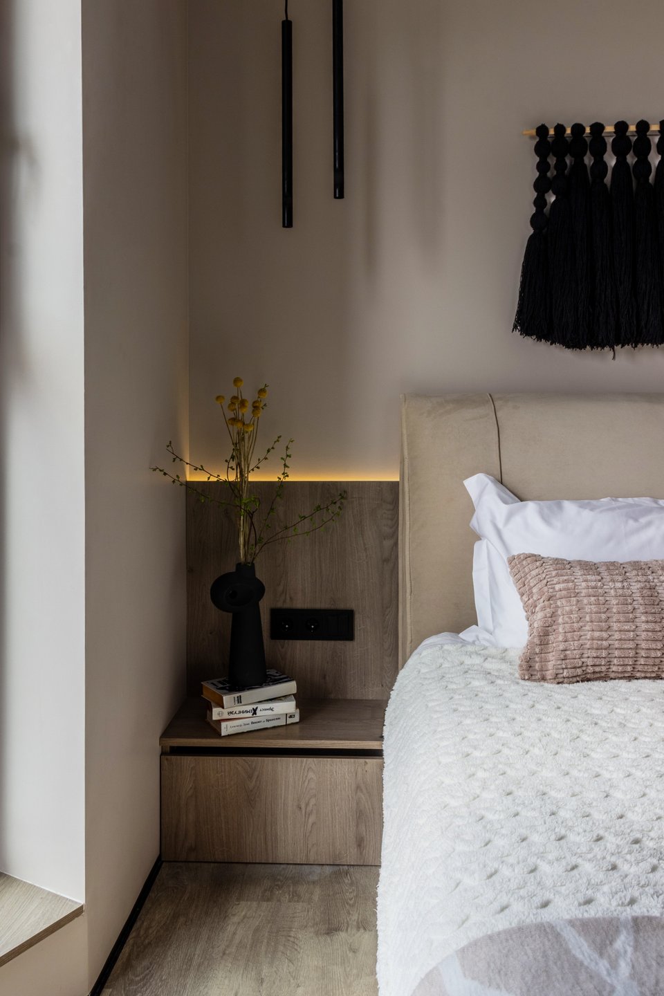 Для спальни заказали кровать Вайлор-Floor от divan.ru с высоким изголовьем и минималистичным дизайном. В заранее подготовленную нишу встроили шкаф. Площадь комнаты небольшая: для визуального расширения пространства фасады сделали стеклянные с зеркальным эффектом. Корпус и внутреннее наполнение шкафа из ЛДСП с древесной фактурой. Панели у изголовья кровати дополнили общую картину.