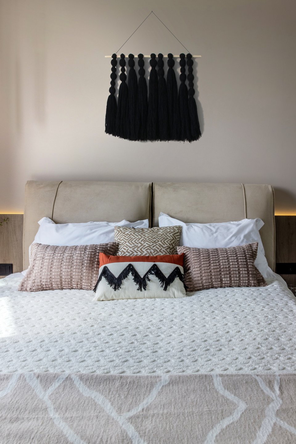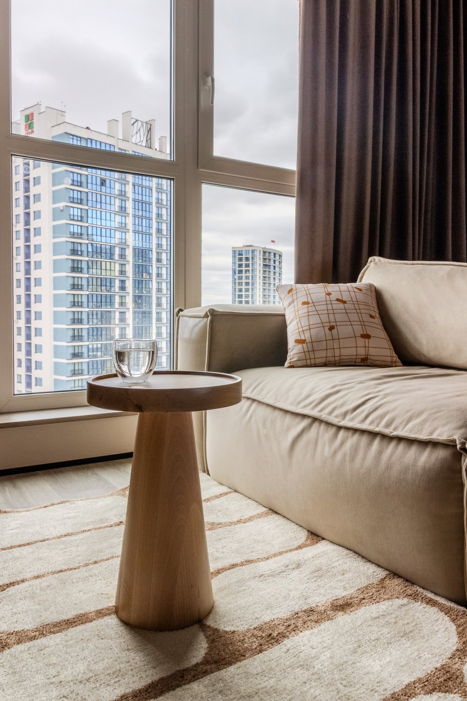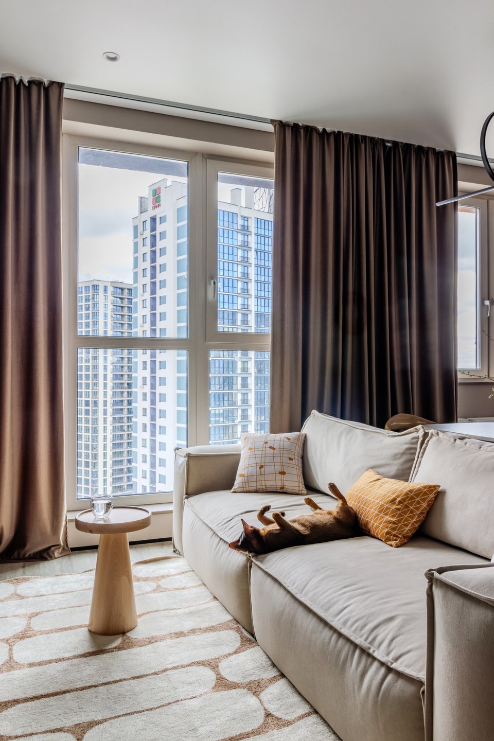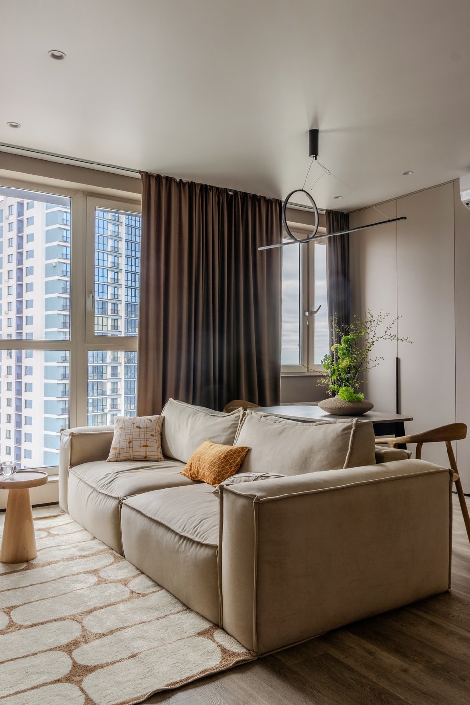 Мягкий, как облачко, диван Эби для зоны гостиной заказали в divan.ru. Журнальный стол Джейми оказался идеальным по размеру — места между диваном и ТВ-зоной немного, поэтому искали что-то компактное, при этом трендовой формы и в цвете дерева. Уютным акцентом, объединяющим зону гостиной, стал двусторонний ковер Monti.