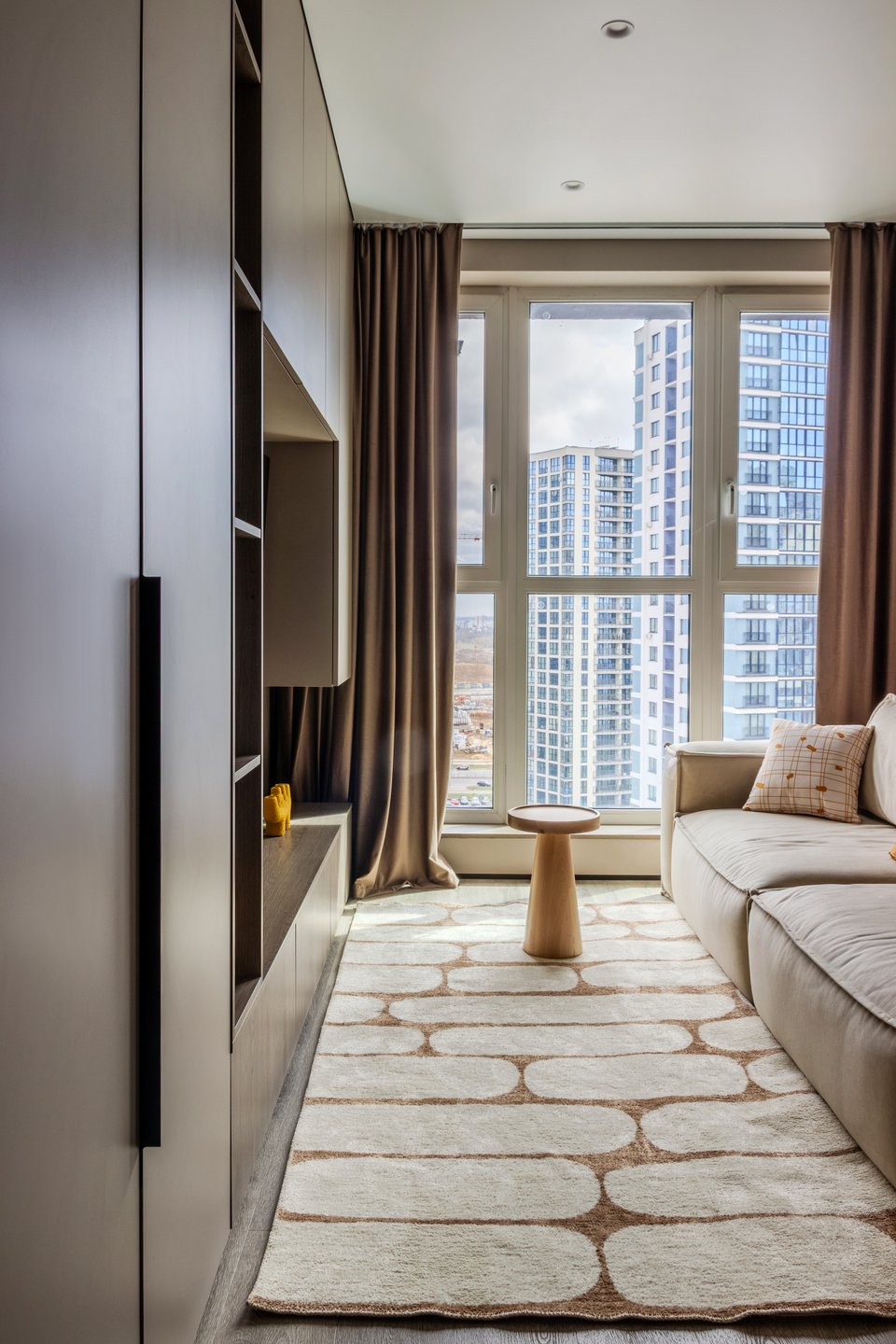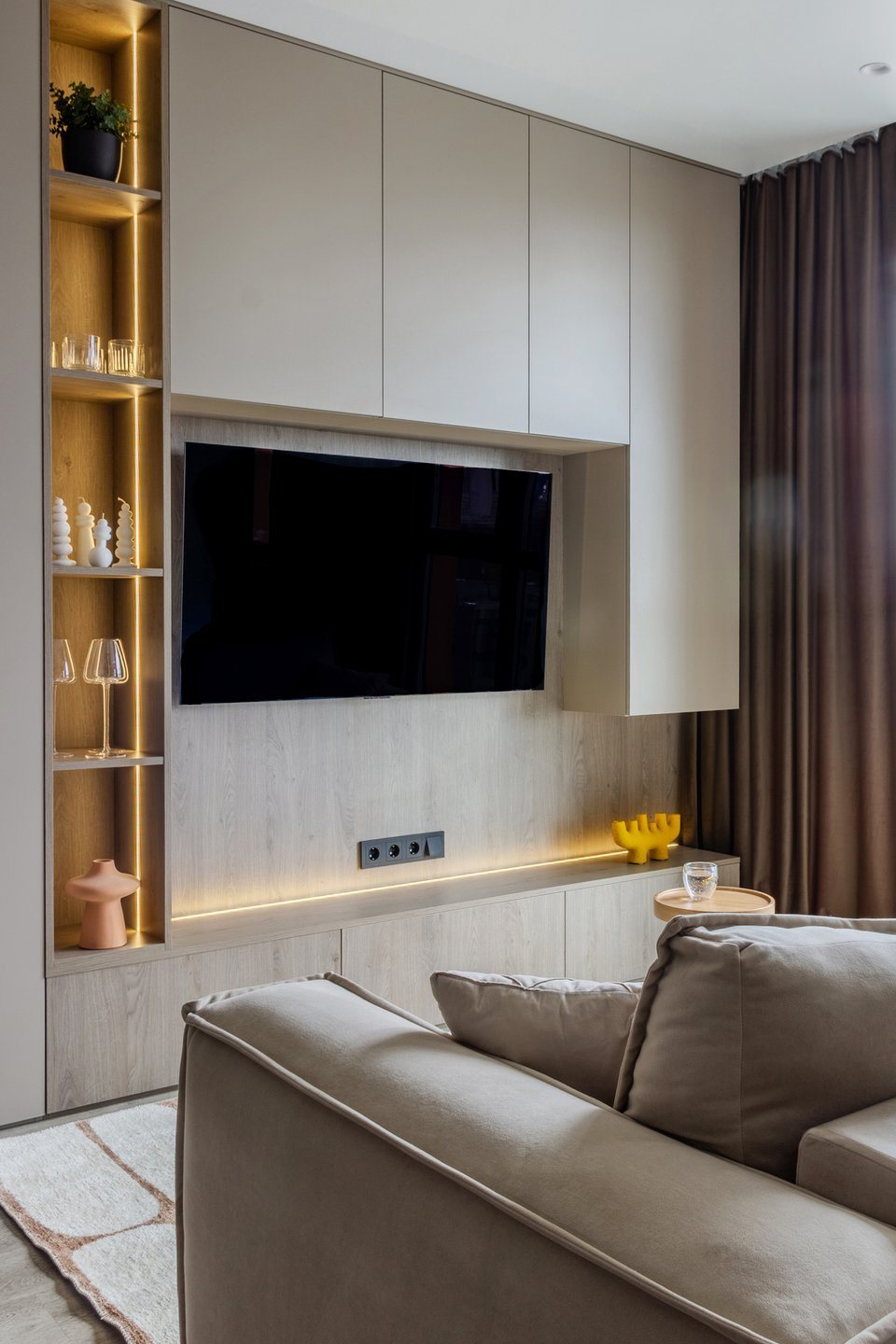 В зоне ТВ выстроили вместительную систему хранения с тумбами, подвесными модулями и неглубоким шкафом для одежды, обуви и хозяйственного инвентаря.