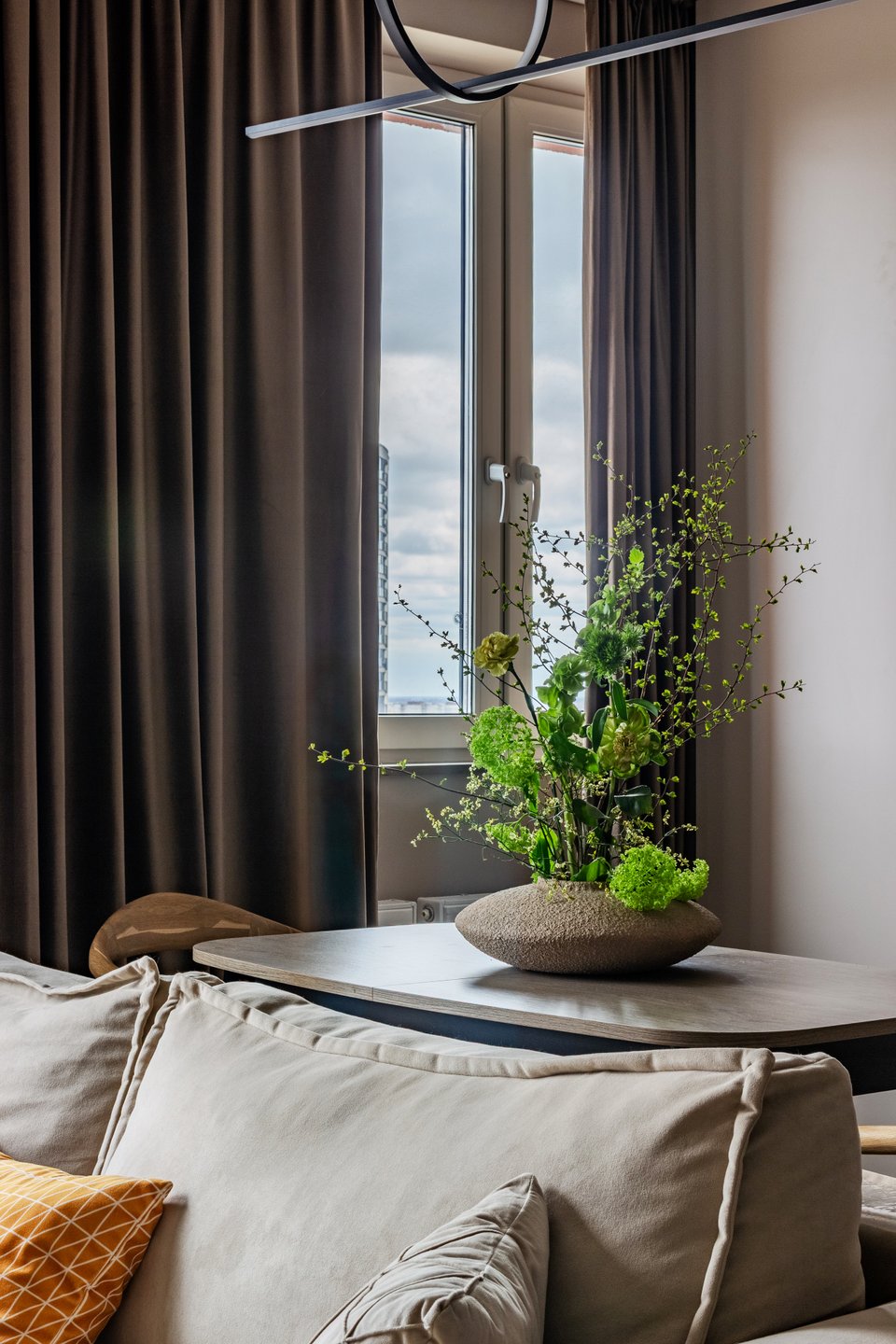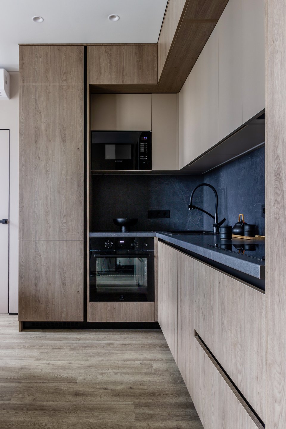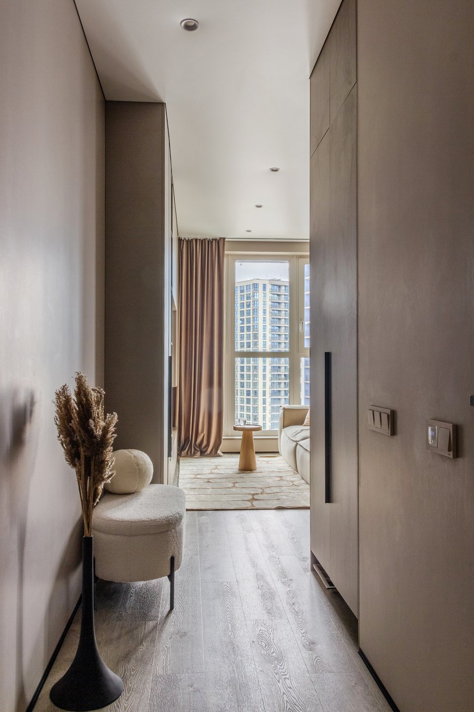 «В качестве основного цвета для интерьера мы выбрали серый кашемир — сложный дорогой оттенок бежевого, — рассказывают дизайнеры. — Выкрасили им стены, использовали в шкафах и мебели, чтобы облегчить визуально массивные предметы. Для теплой атмосферы и акцента выбрали дерево и разбавили монохром серым камнем».