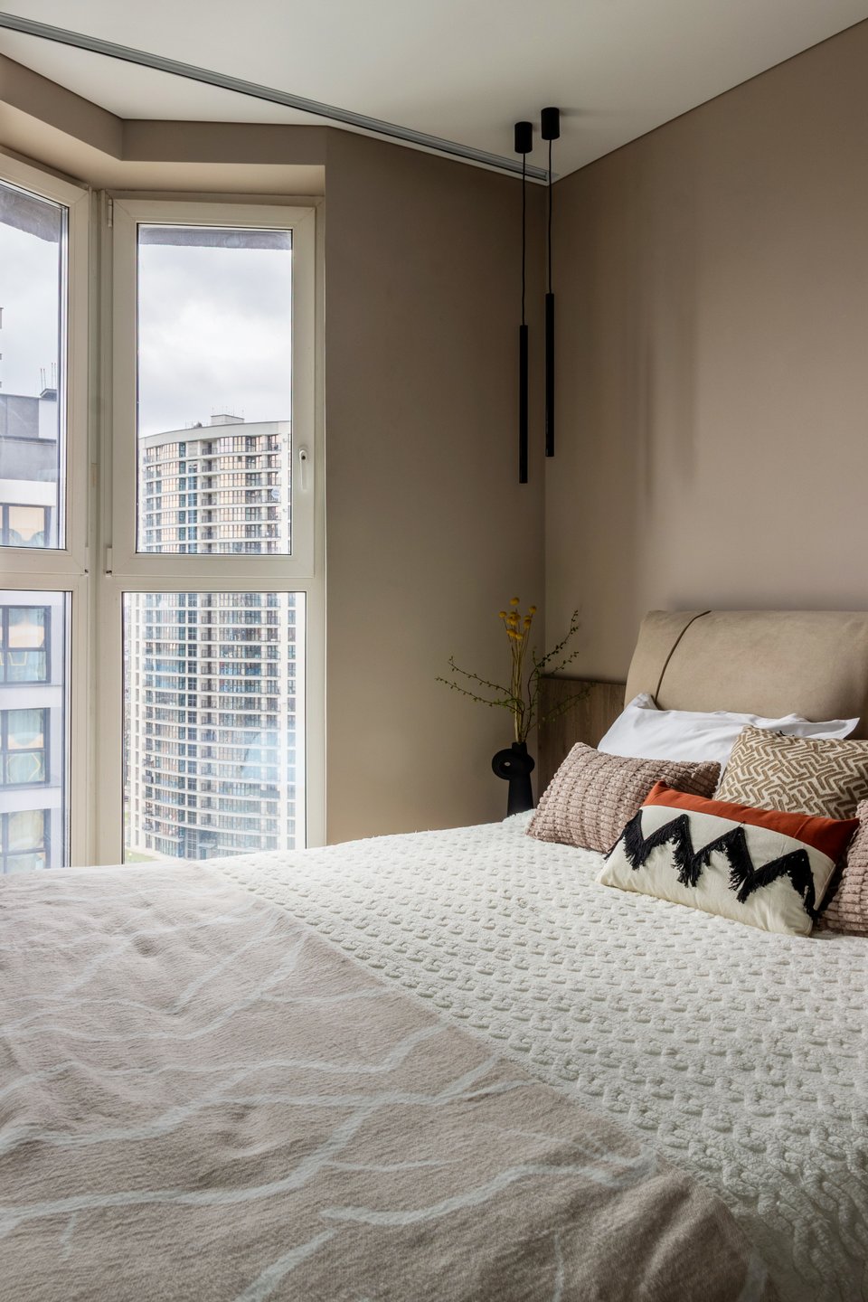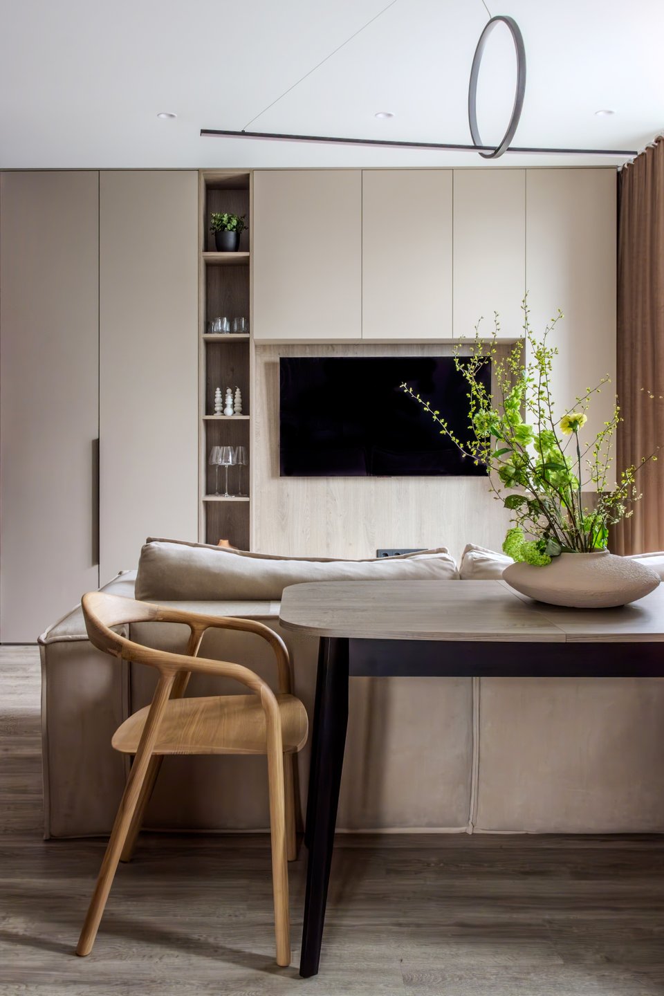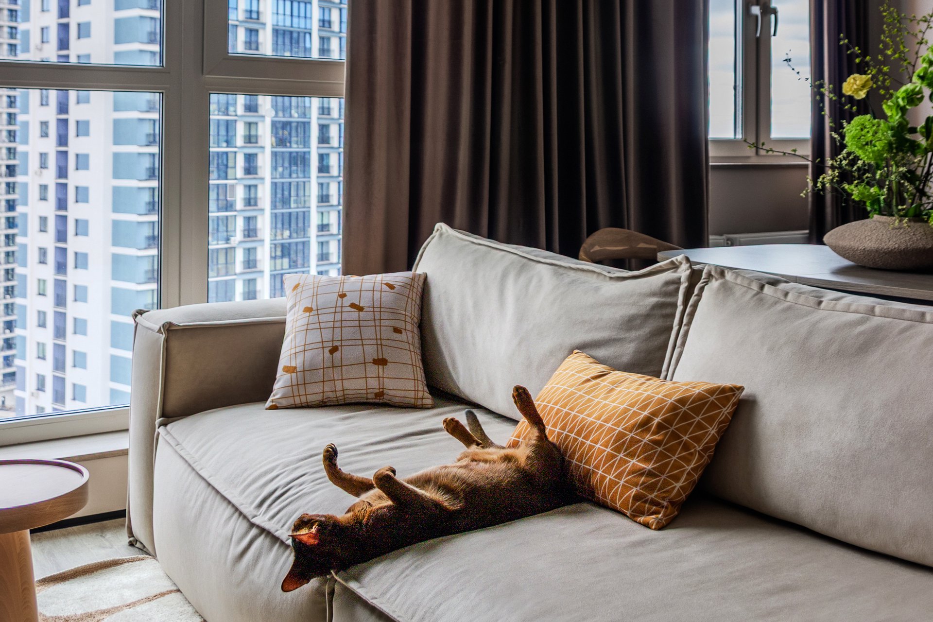 «В качестве основного цвета для интерьера мы выбрали серый кашемир — сложный дорогой оттенок бежевого, — рассказывают дизайнеры. — Выкрасили им стены, использовали в шкафах и мебели, чтобы облегчить визуально массивные предметы. Для теплой атмосферы и акцента выбрали дерево и разбавили монохром серым камнем».