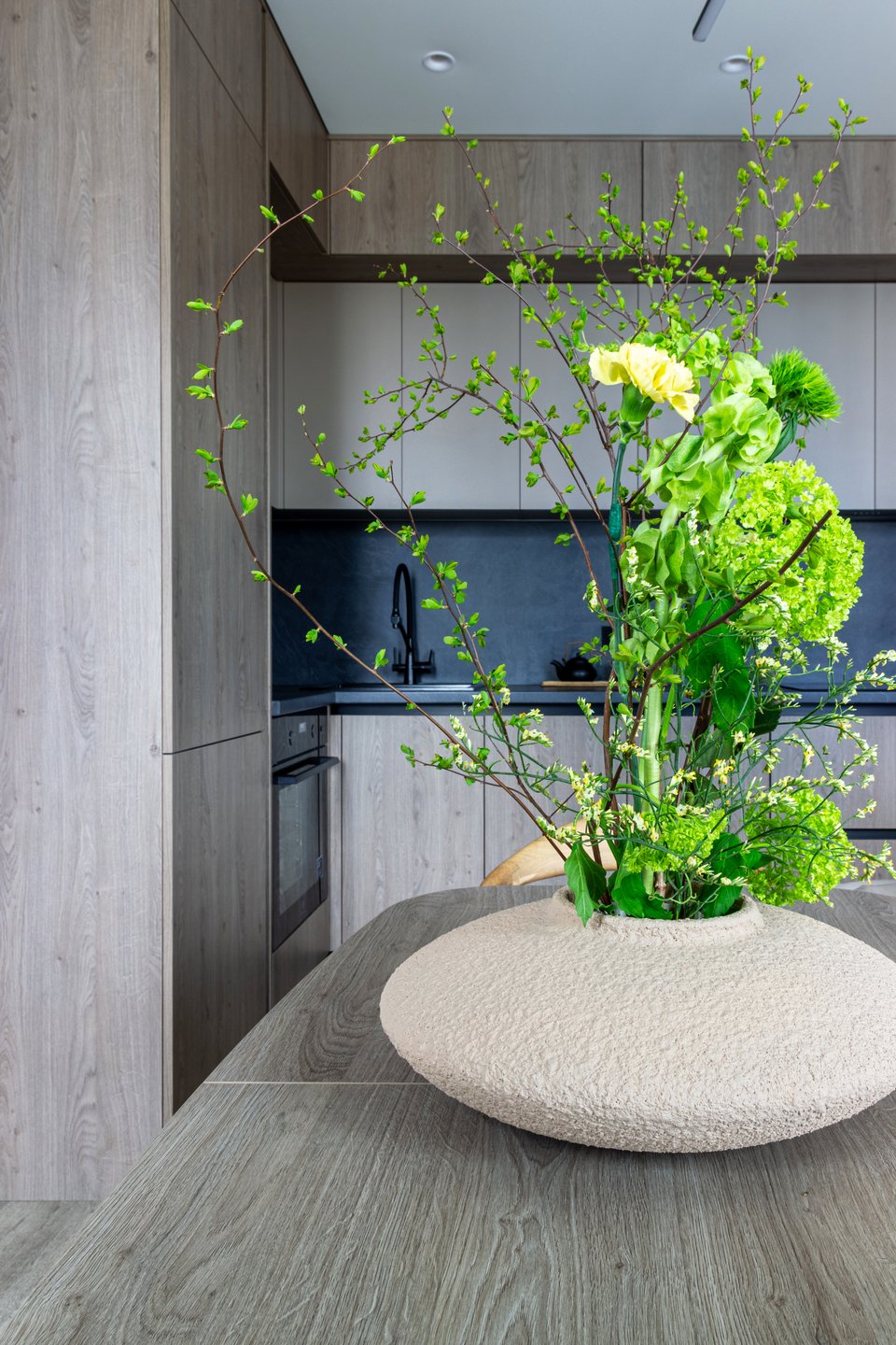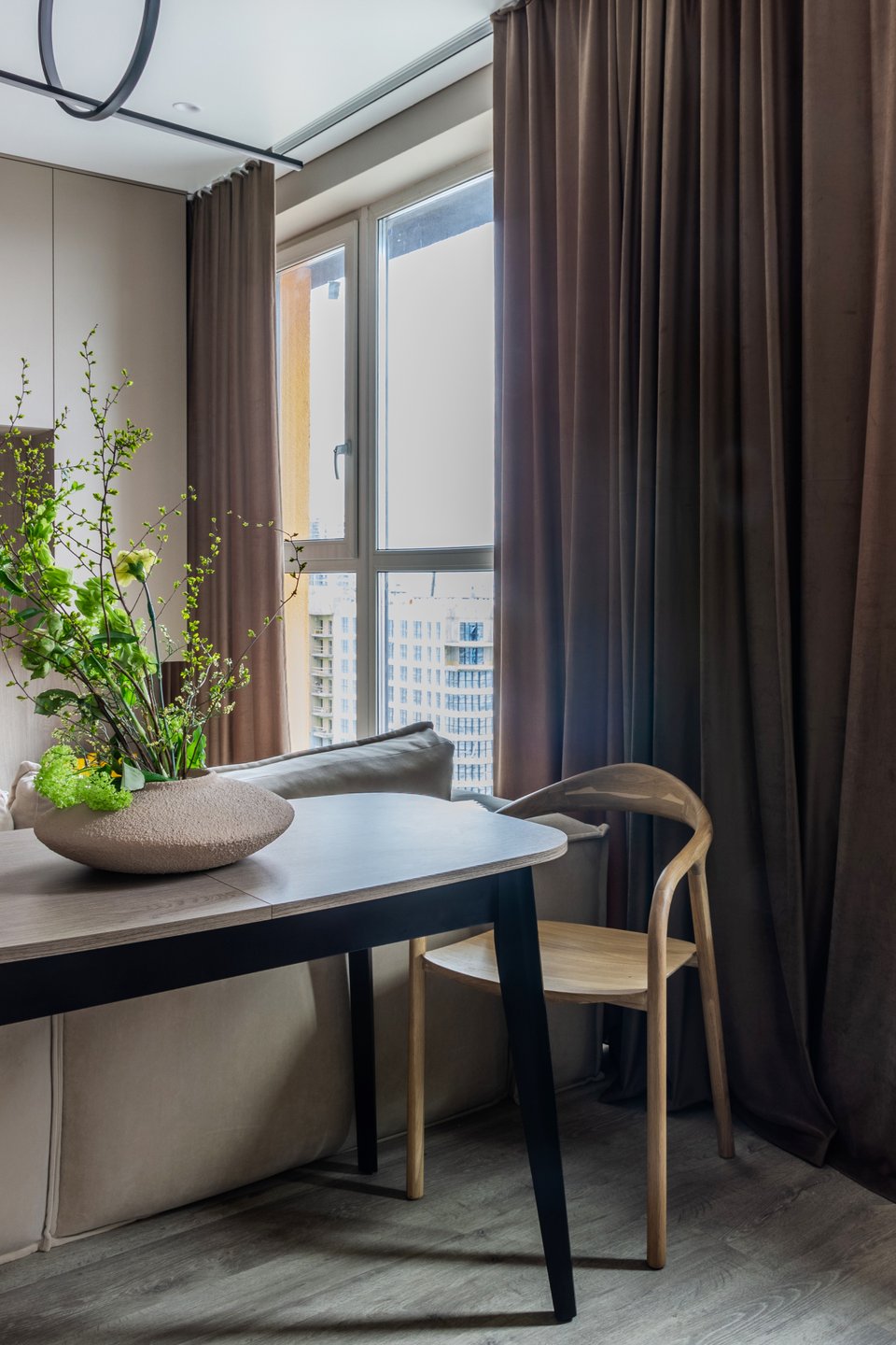 Часть кухни «развернули» в сторону коридора, обыграв перепад вентиляционной шахты. Тем самым организовали шкаф для прихожей — из-за ее небольшой ширины не было возможности поставить что-то, кроме обувницы. Гарнитур изготовили на заказ. Для столешницы выбрали сланец «Скиваро» — он гармонично вписался в природную концепцию интерьера и очень похож на плитку под камень в санузле. Обеденный стол разделяет зоны отдыха и приготовления пищи.
