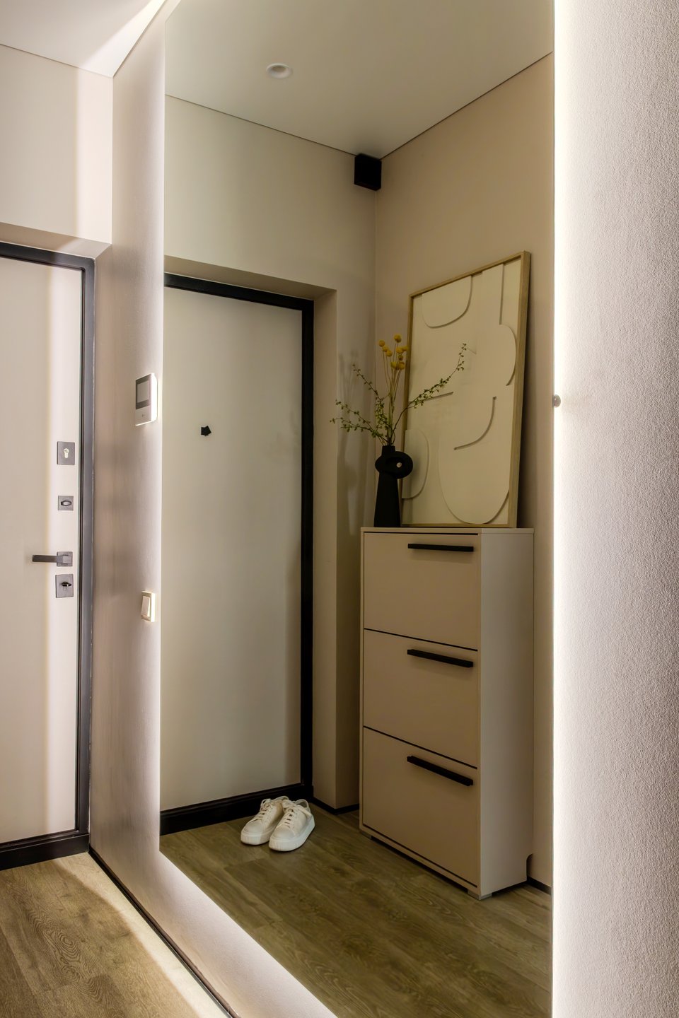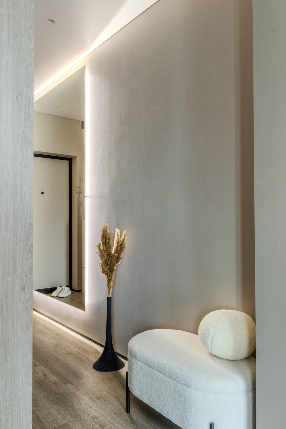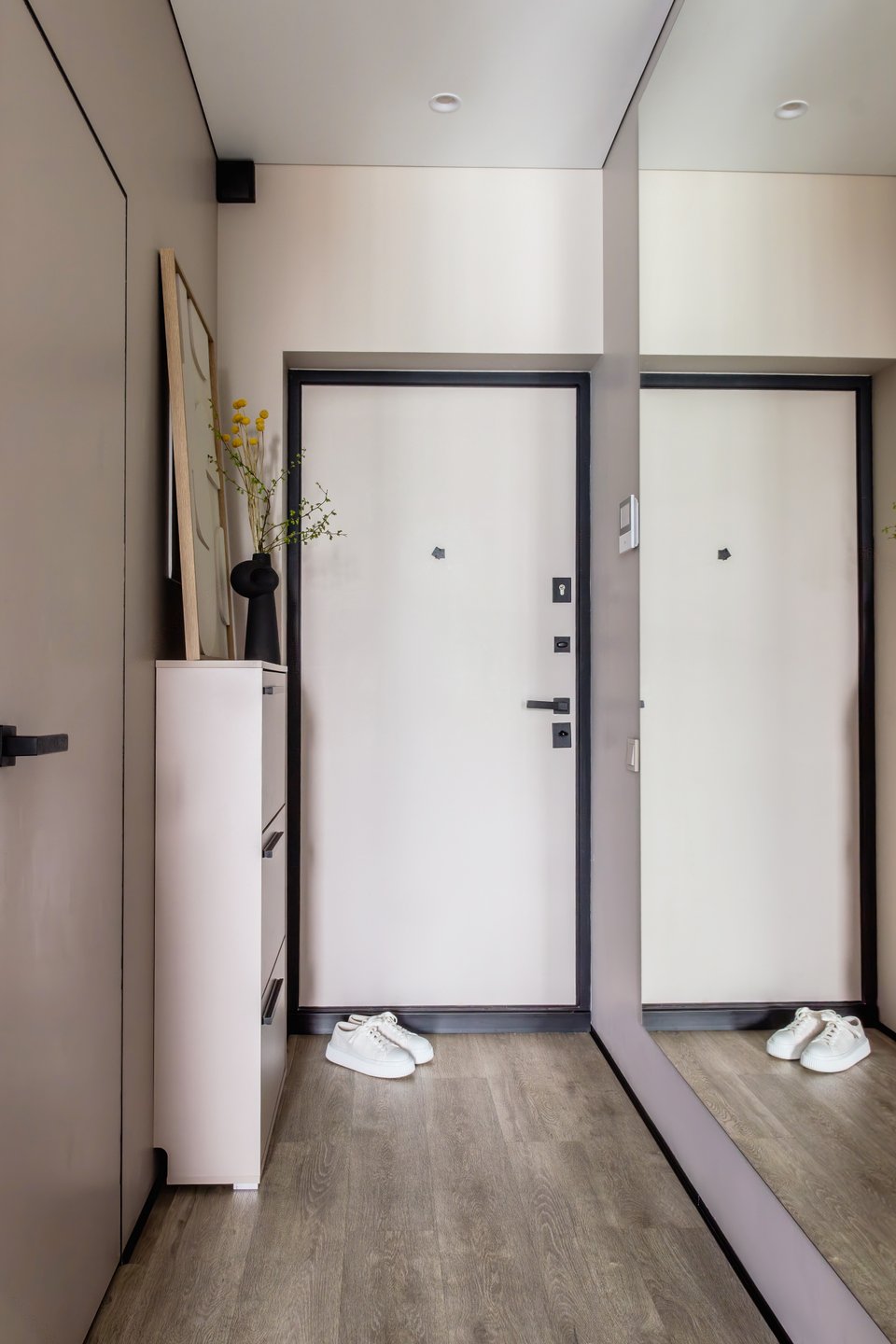 В узкой прихожей не было возможности организовать габаритное хранение, здесь поместилась только тумба для обуви Кимбол. На стене закрепили зеркало, чтобы добавить света. Электрощиток спрятали за картиной Рельеф от бренда divan.ru. Чтобы не создавать визуальный шум, межкомнатные двери сделали скрытыми, в цвет стен.