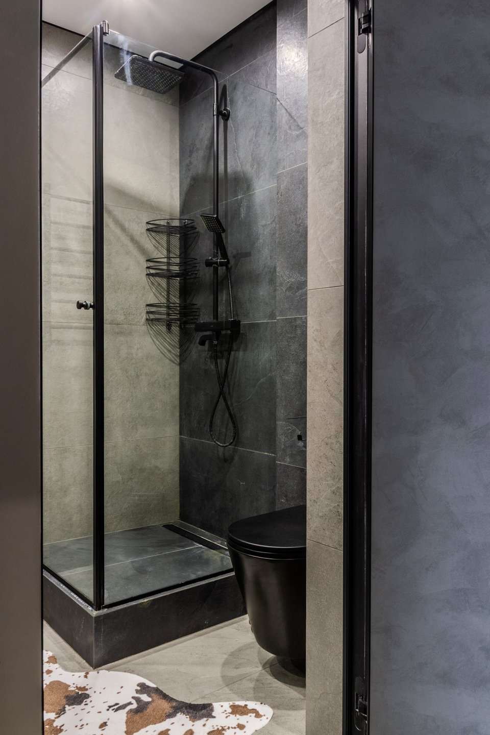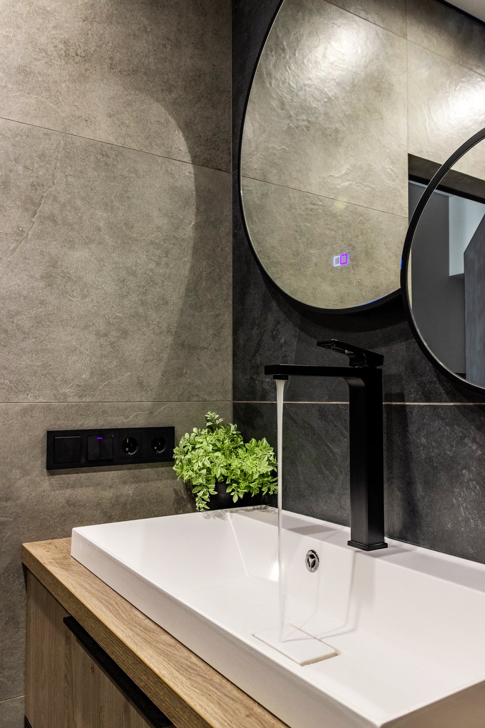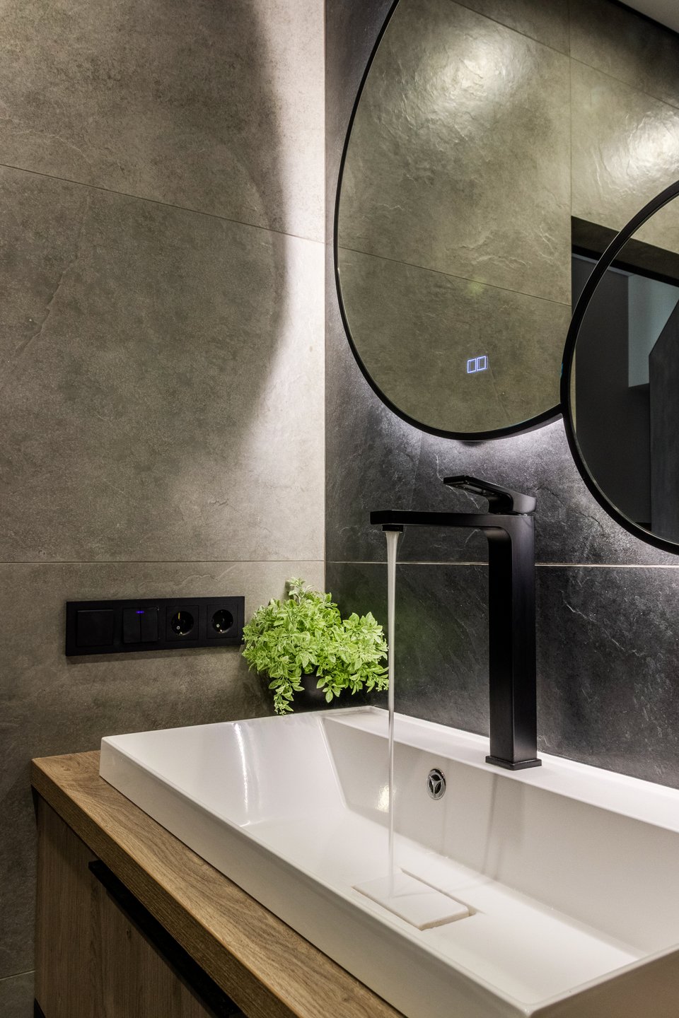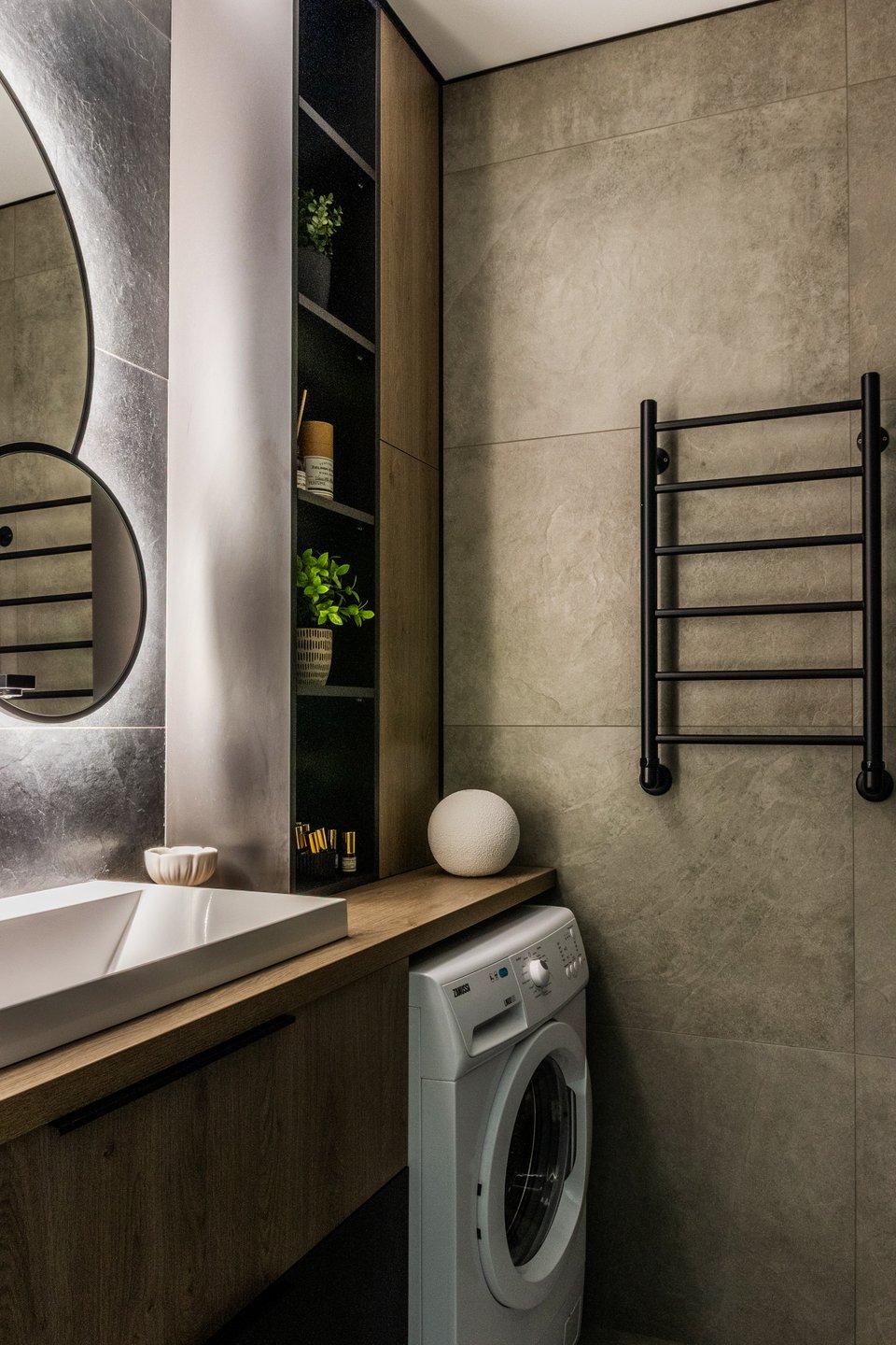 Стены и пол в санузле облицевали керамической плиткой. Одним из пожеланий заказчицы было сделать темную ванную с расслабляющей атмосферой и множеством подсветок. Поэтому выбрали фактурную плитку, которую подчеркнули направленным освещением.