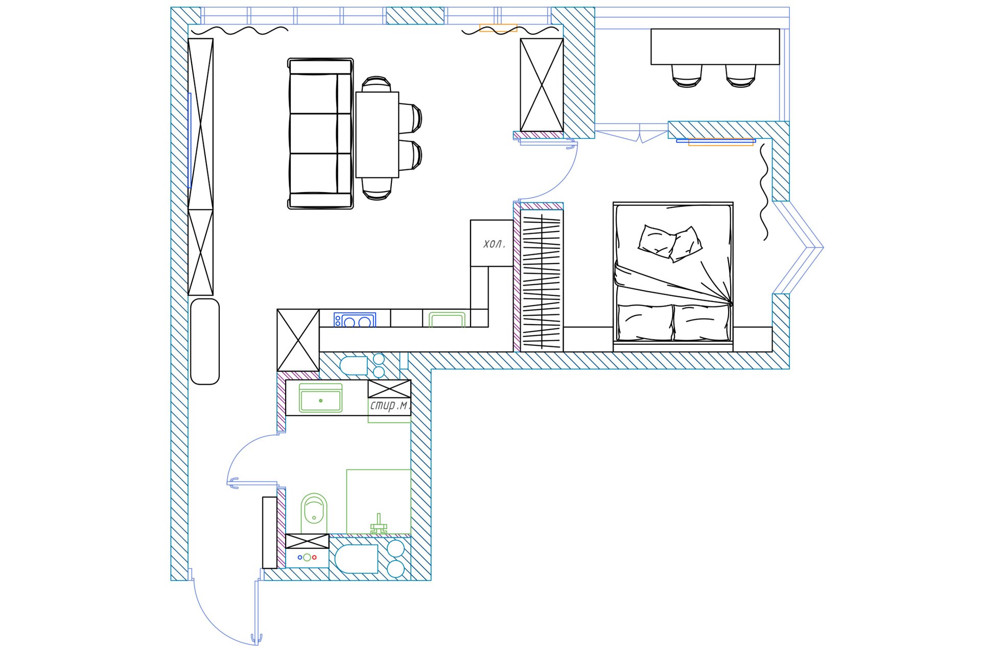 Застройщик сдавал квартиру без отделки, со свободной планировкой. Вытянутая форма помещения позволила организовать кухню-гостиную с зонами готовки, приема пищи и отдыха. Минус планировки — узкий и длинный коридор.