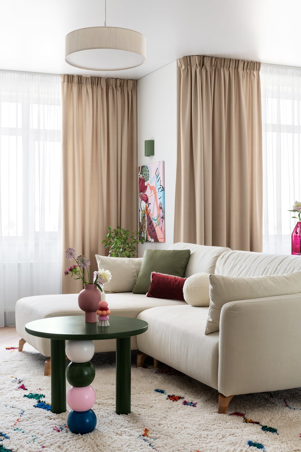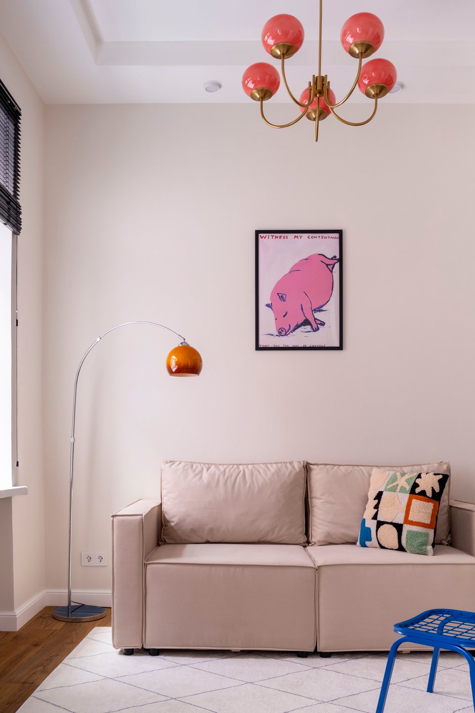 Пространство, напоминающее современную галерею искусств — с таким видением будущего интерьера пришла к дизайнеру молодая пара. Интерьер получился эклектичный: база светлая, характерная сканди, но здесь же яркие акценты и современные формы, характерные стилю мемфис. Пара увлекается путешествиями и собирает уникальный декор из разных уголков мира: обилие пестрых ваз, керамики и картин «поддержали» необычной мебелью и принтованным текстилем.