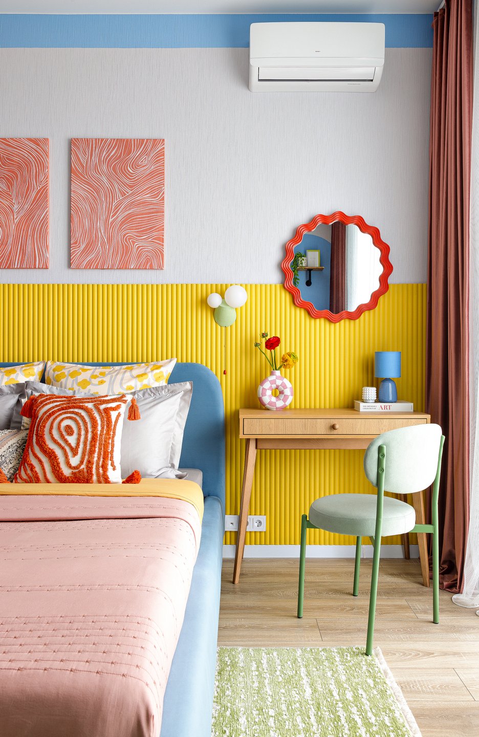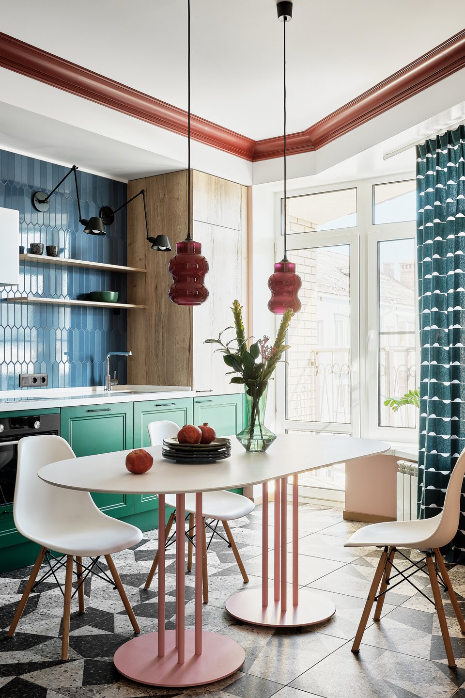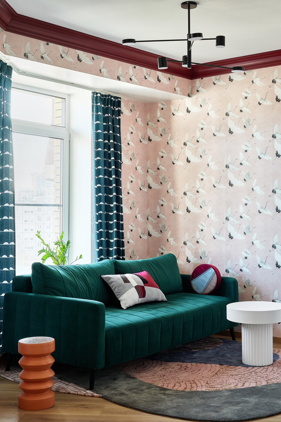 Владельцы этой квартиры — молодые супруги с двумя маленькими дочками — в своем интерьере хотели экспериментов с цветом, ярких сочетаний оттенков и принтов. Оба работают в сфере графического дизайна и интересуются изобразительным искусством — смелых идей было хоть отбавляй. «Укротить» буйство красок помогли сложные припыленные тона, характерные для интерьеров середины 20 века и стилистики mid-century.