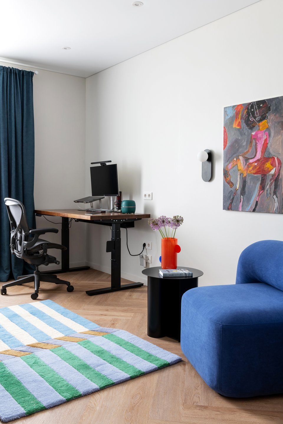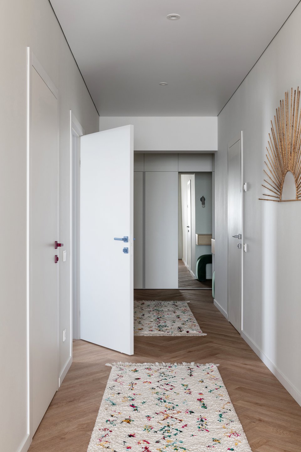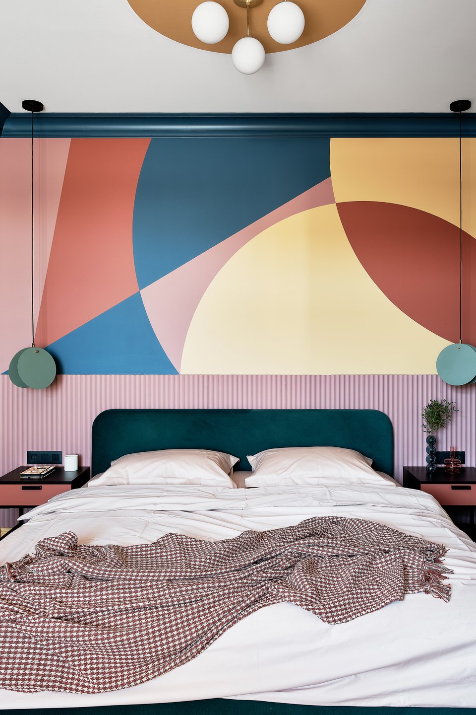 Владельцы этой квартиры — молодые супруги с двумя маленькими дочками — в своем интерьере хотели экспериментов с цветом, ярких сочетаний оттенков и принтов. Оба работают в сфере графического дизайна и интересуются изобразительным искусством — смелых идей было хоть отбавляй. «Укротить» буйство красок помогли сложные припыленные тона, характерные для интерьеров середины 20 века и стилистики mid-century.