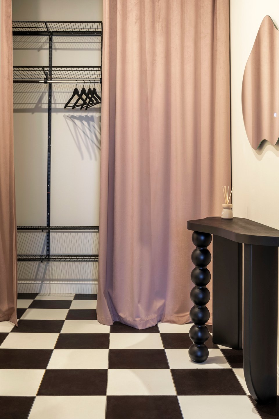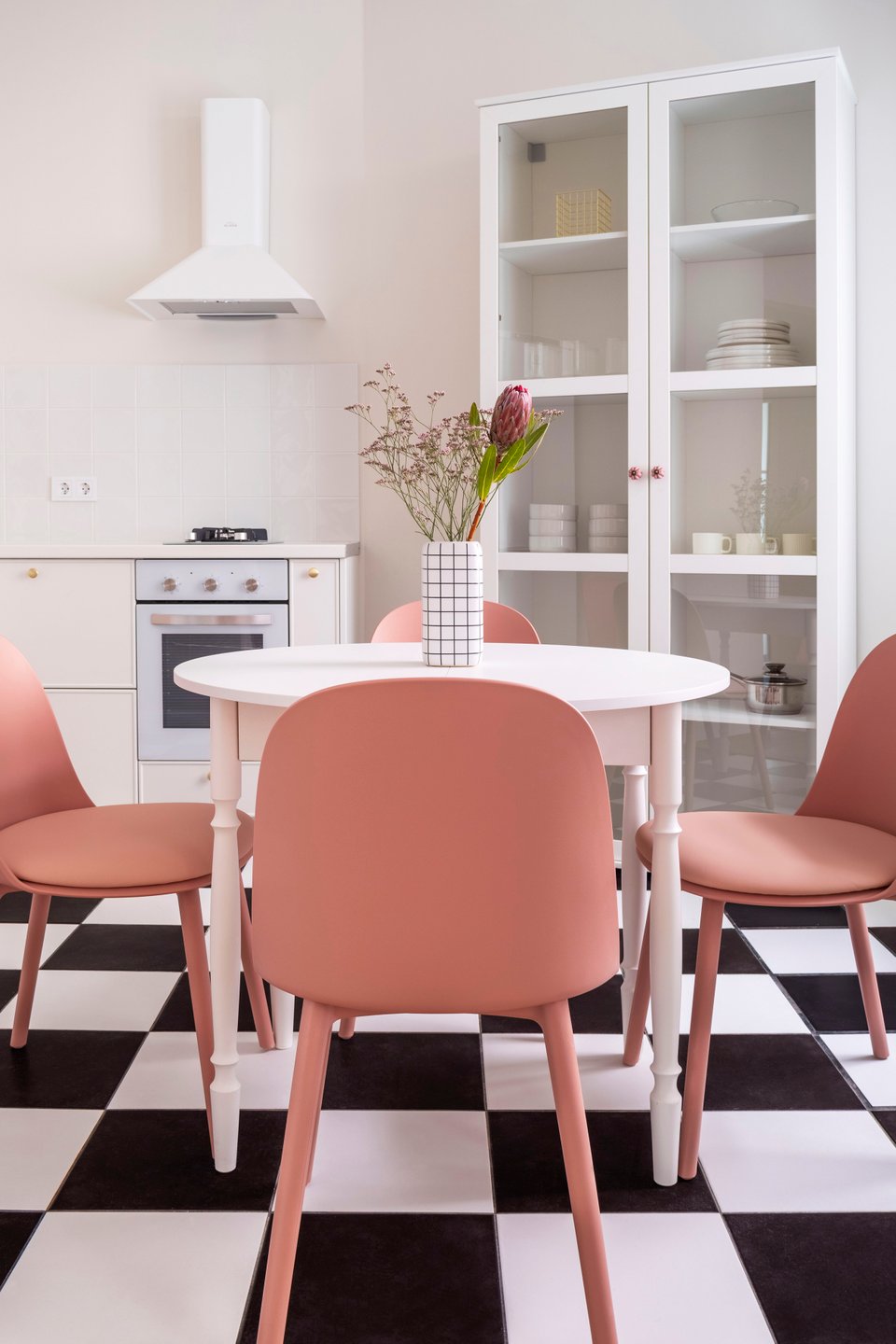 Хозяева этой квартиры просили дизайнеров сохранить черно-белое напольное покрытие в виде шахматной доски — именно оно вдохновило добавить в интерьер мотивы из «Алисы в Стране чудес». Так здесь появились зайцы, коты, розовый велюр и акценты в стиле поп-арт. За дофаминовое настроение отвечают забавные постеры, насыщенные розовые и глубокие синие оттенки, ковры с принтами и цветные плафоны.