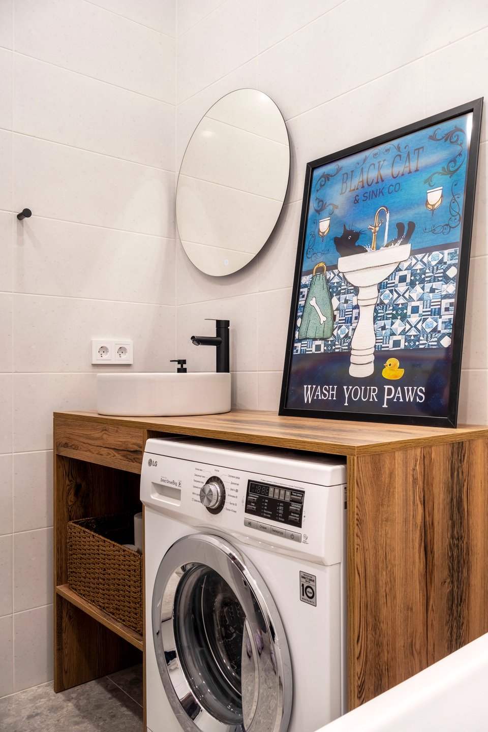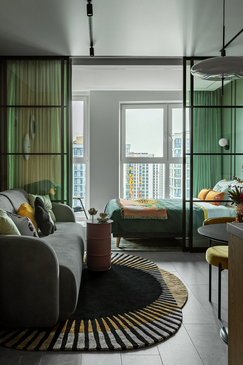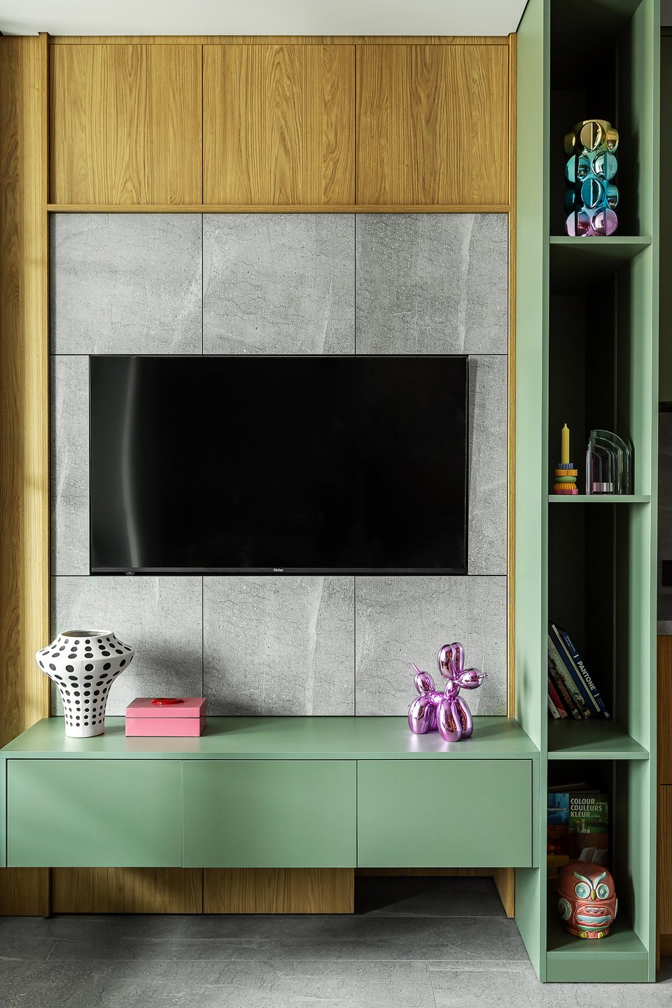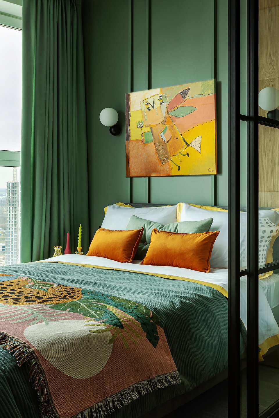 В качестве базы для этого интерьера взяли приятный глазу оттенок эвкалипта, добавили «теплого» дерева и нетривиального камня. А потом «раскрасили» при помощи декора и картин. Здесь живет молодая девушка, которая считает однотонные светлые интерьеры скучными и слишком простыми. Поэтому главным оружием проекта стал цвет.