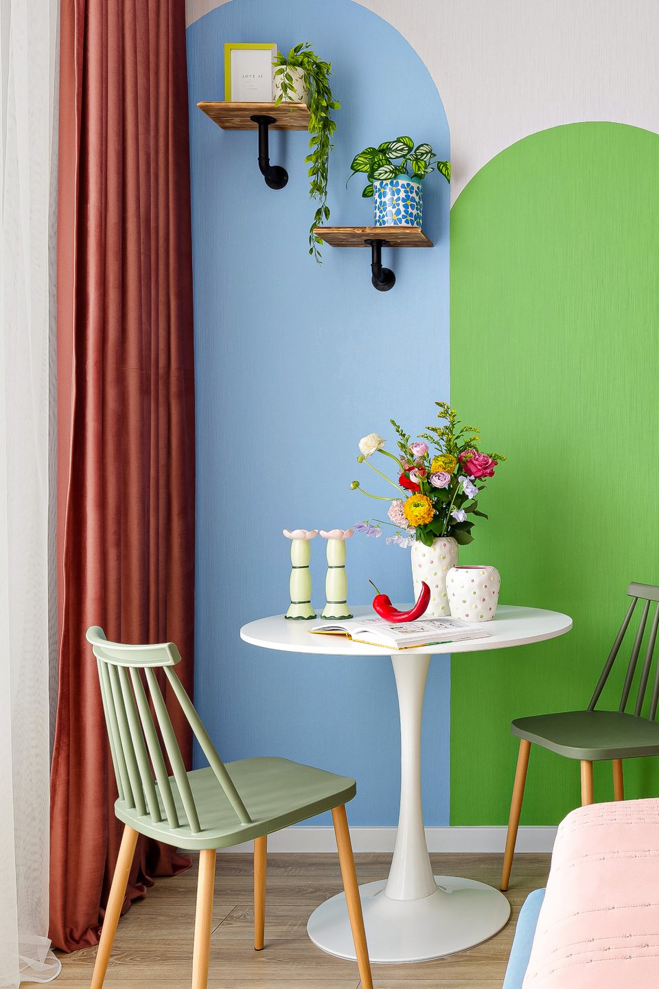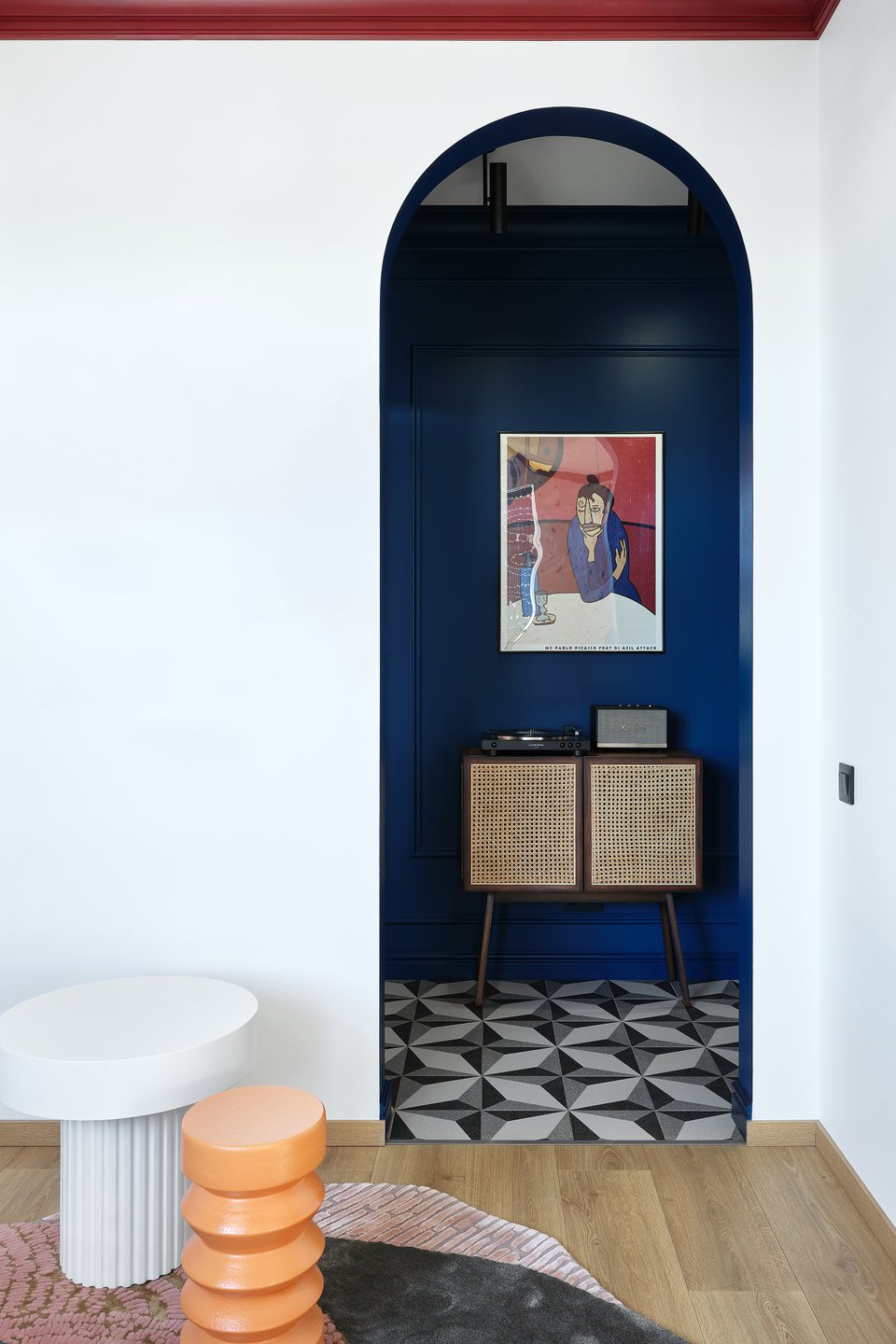 Для оформления выбрали стиль мемфис — своего рода манифест против скуки и шаблонов: ироничный, игривый и немного дерзкий. Визуальный язык проекта — круги, арки, зигзаги, ступени, формы, которые ломают прямолинейность. Мебель и декор — гротескные, наивные, словно из детской фантазии.