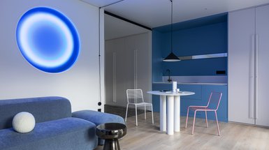 В этой однушке естественный свет в изолированную спальню проникает через круглое окно.