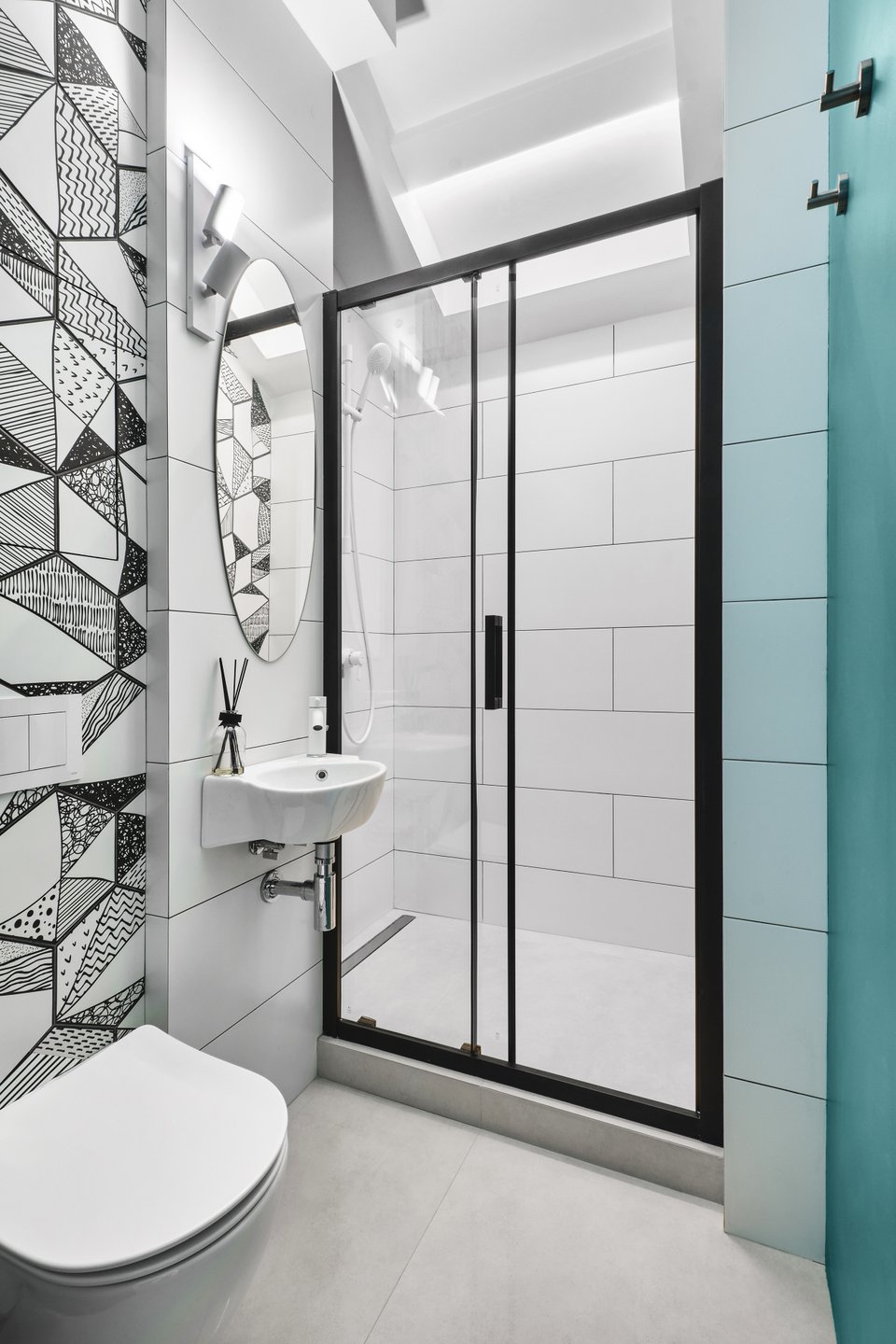 На чем сэкономили: плитку для санузла выбрали из бюджетной коллекции — ее порезали на разной ширины полоски, затерли контрастной графитовой затиркой.