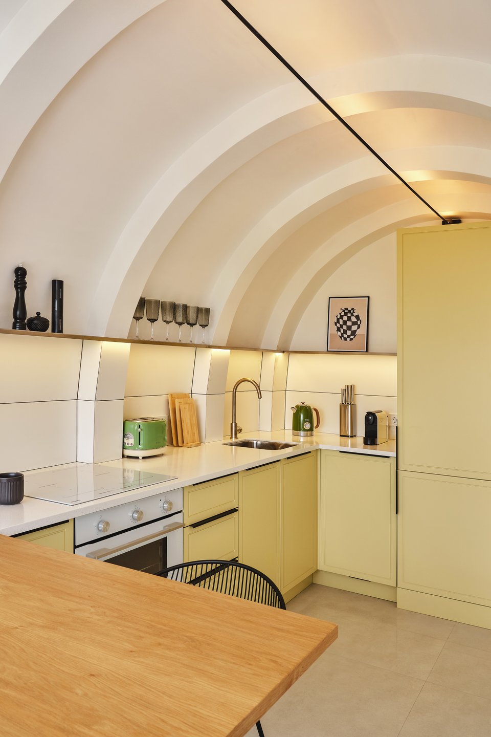 Проблема и решение: установка вытяжки над плитой оказалась невозможной из-за свода, поэтому пришлось пробить крышу и вывести вентилятор в верхней части потолка.