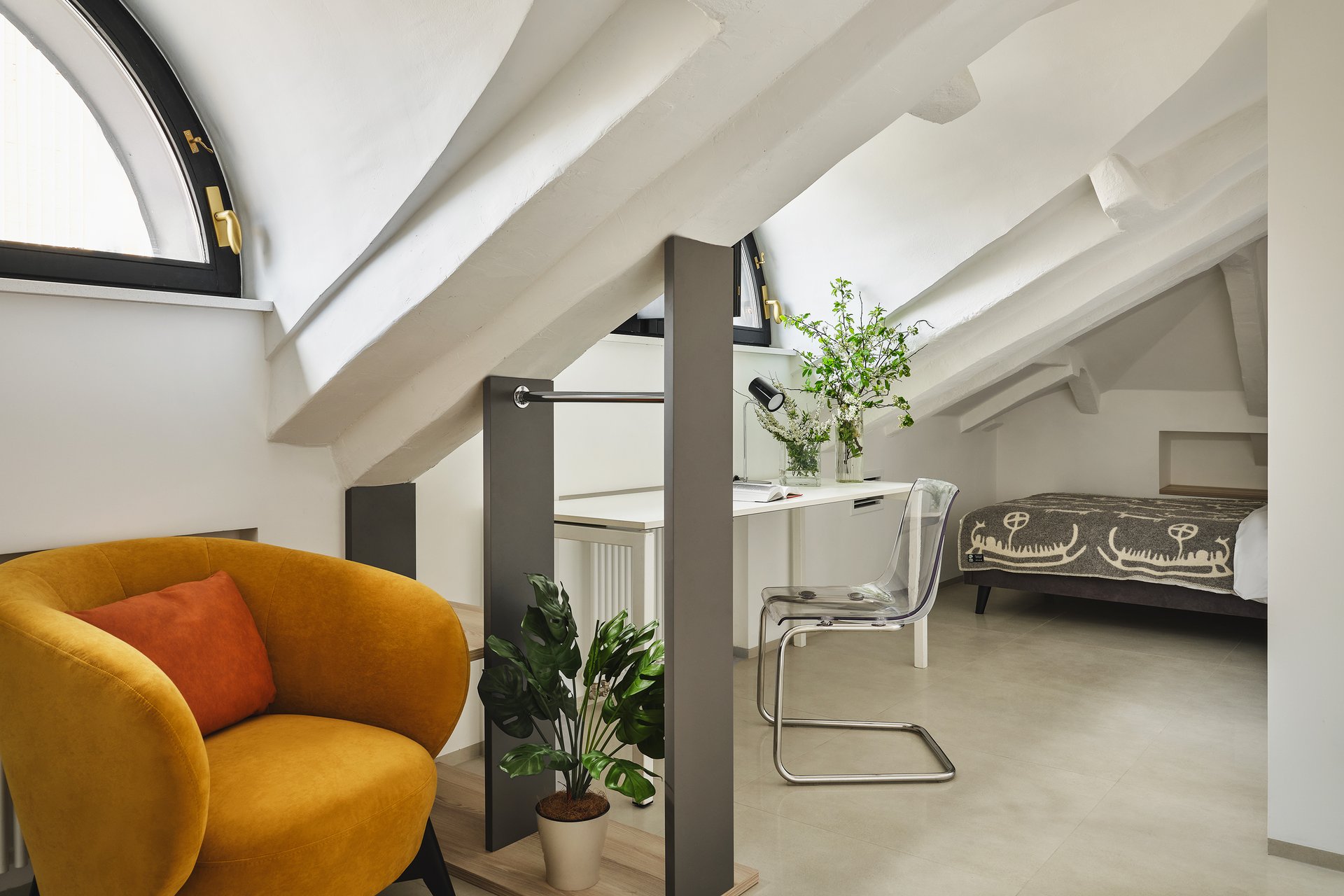 Стол из дубового шпона, установленный на уровне рабочей поверхности, создает эффект парения благодаря стеклянной ноге. Под столом предусмотрены места для хранения. Полубарные стулья Уфо заказали на divan.ru — они легкие, мобильные и занимают немного места. Подоконник стал лаундж-зоной — на нем приятно сидеть с чашкой кофе, наслаждаясь видом из арочного окна на панораму города и церкви.