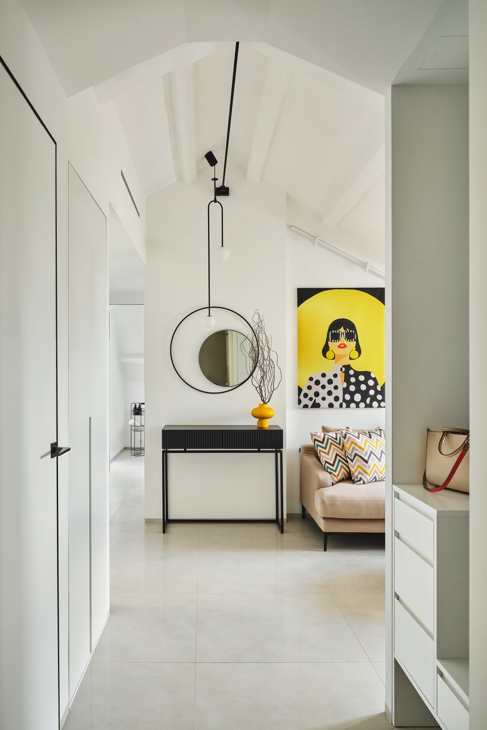 «Я долго думала, стоит ли отсекать зону прихожей от гостиной — с одной стороны, жалко было делить пространство, с другой — все-таки функциональность важна, — рассказывает дизайнер. — В итоге сделала зону прихожей с подвесными ящиками, зеркалом и крючками для одежды».