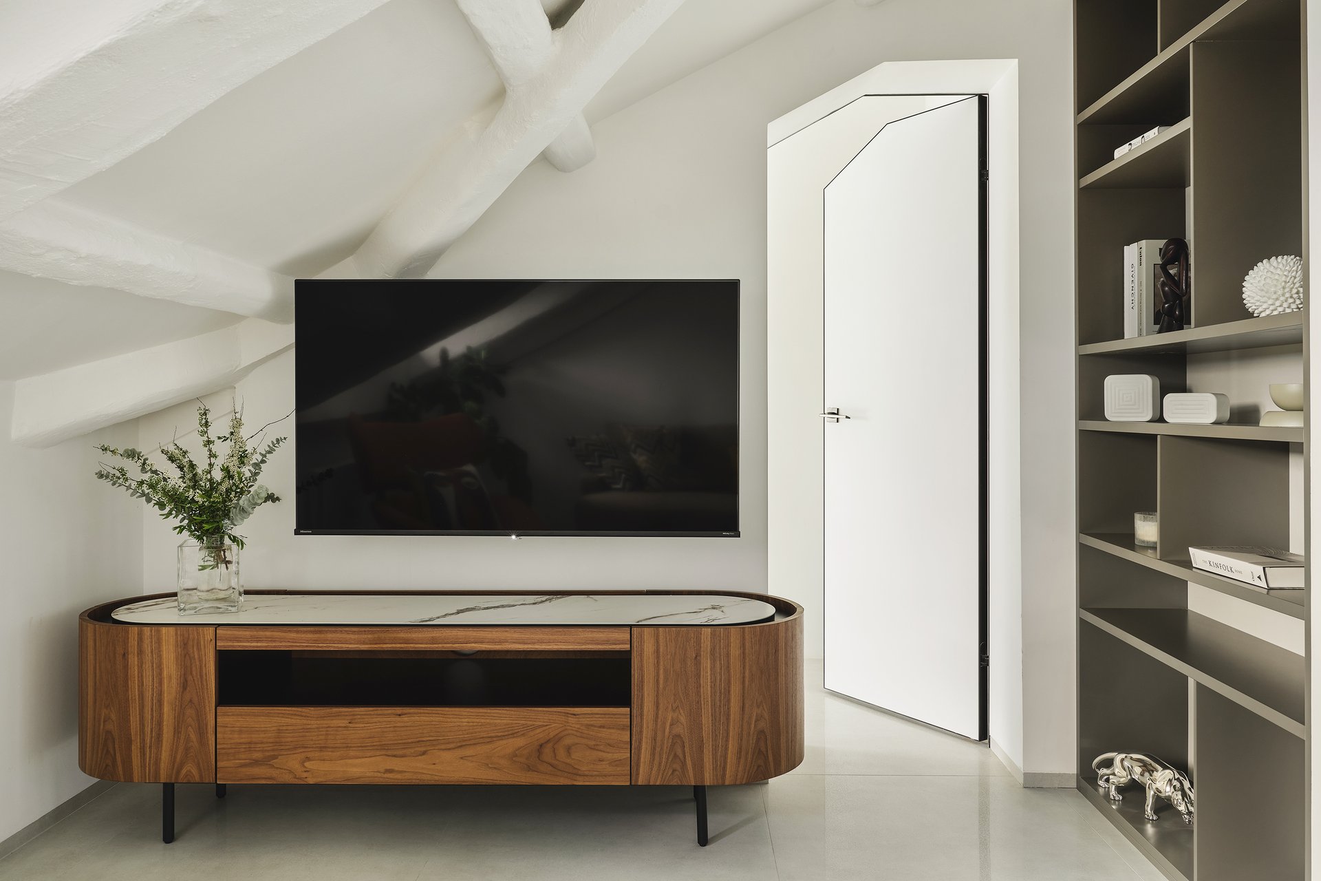 Тумба под телевизором в гостиной — с удобными закругленными краями. При этом боковые секции можно использовать, дверцы открываются.