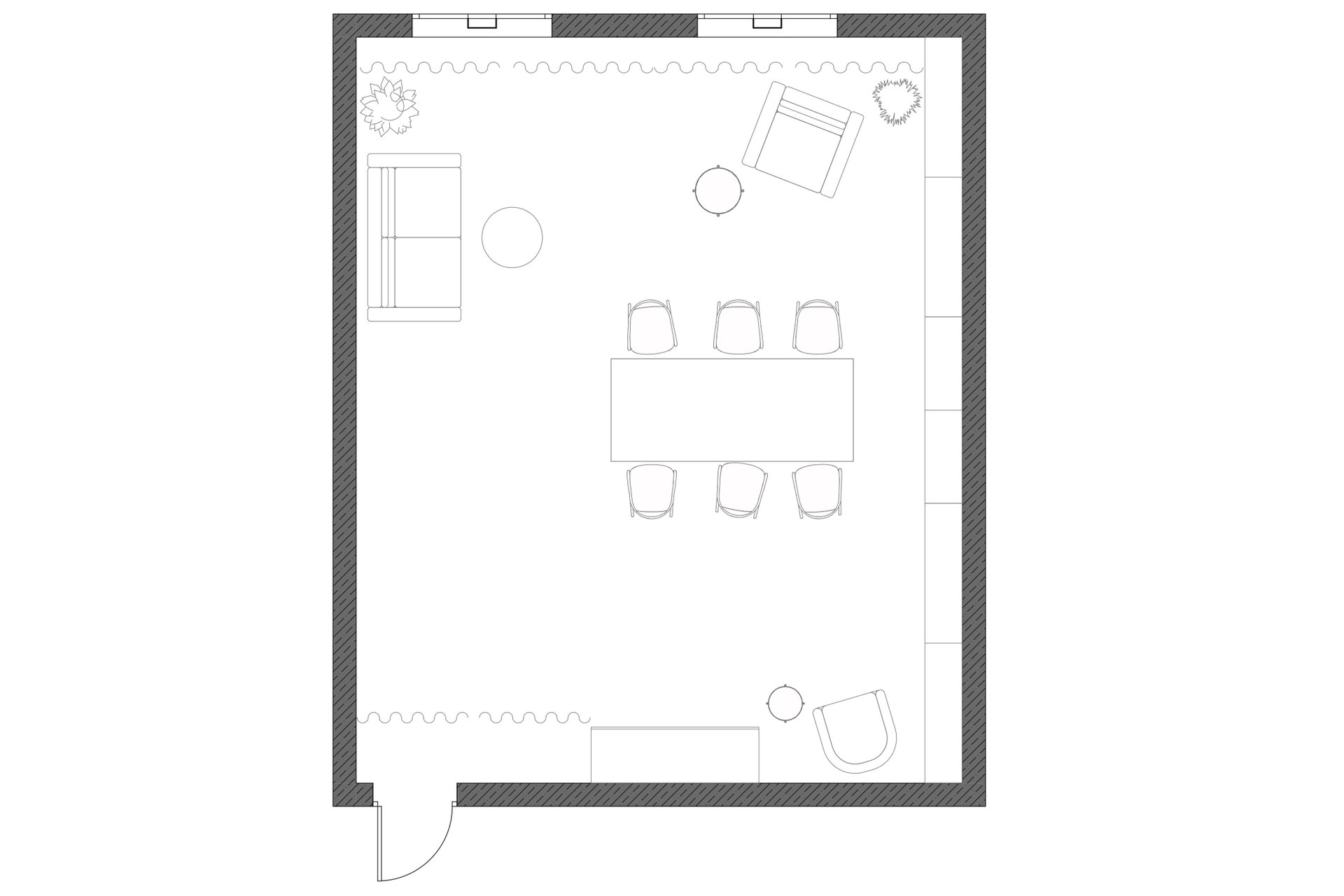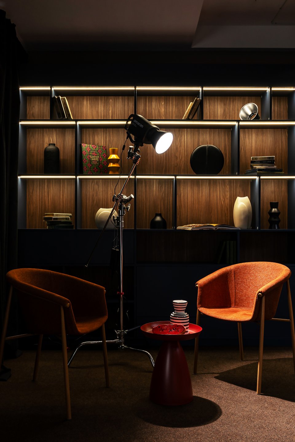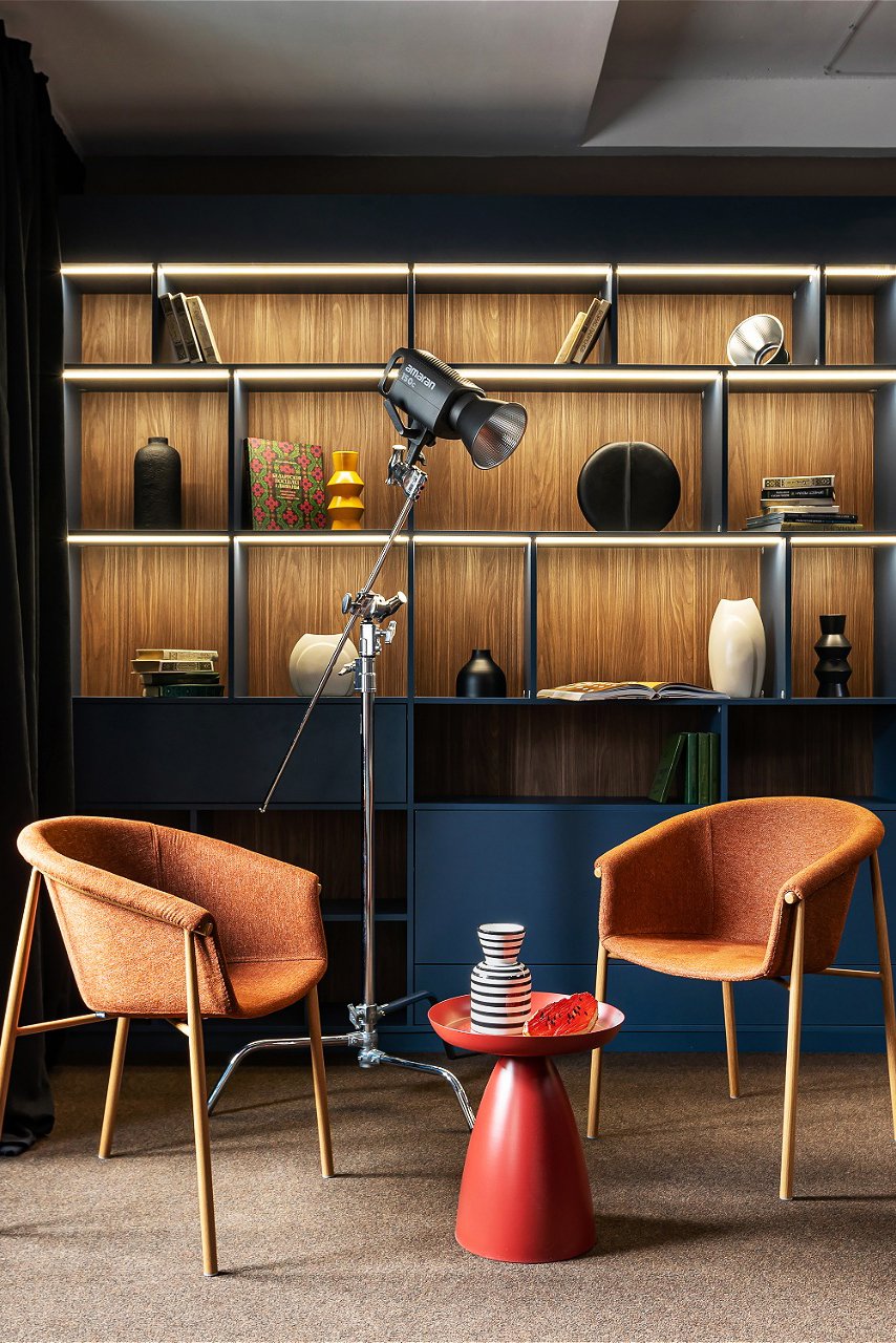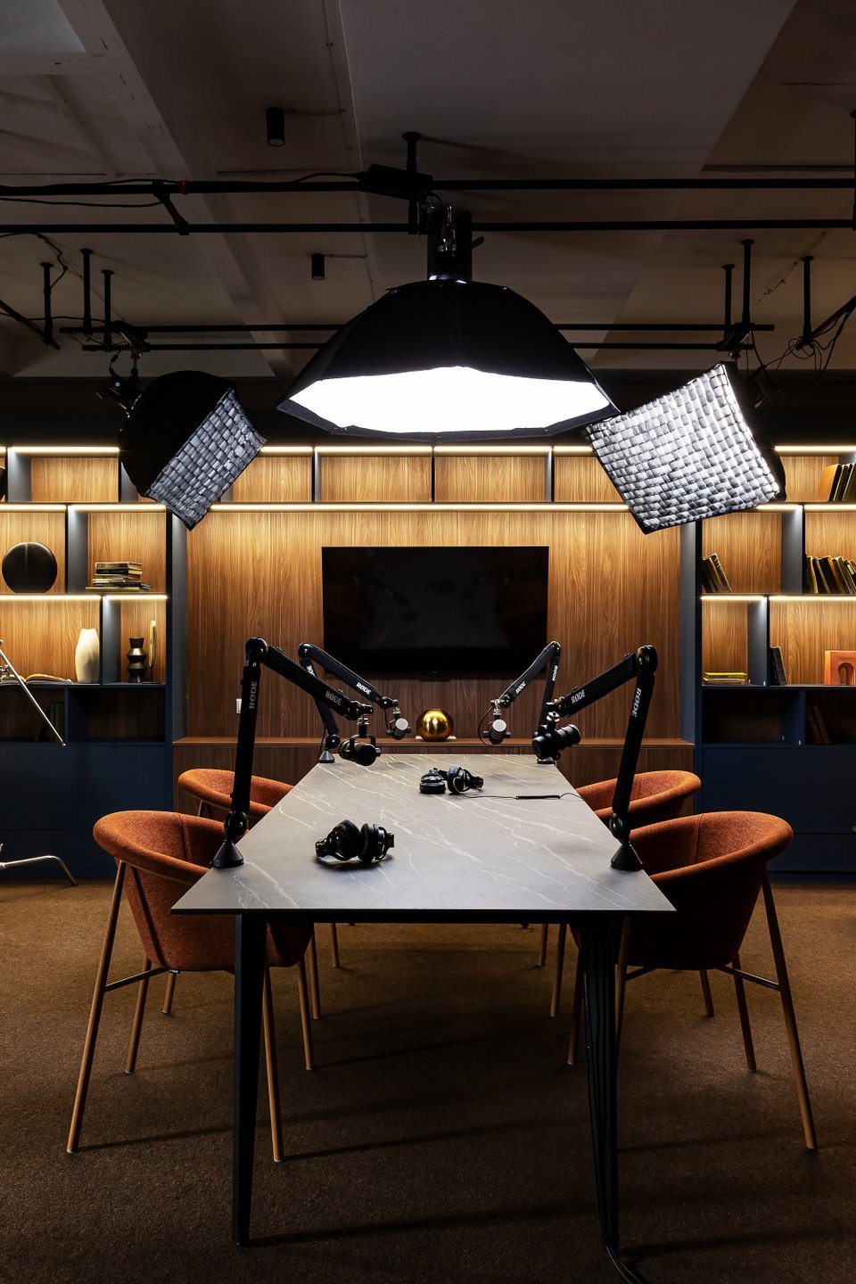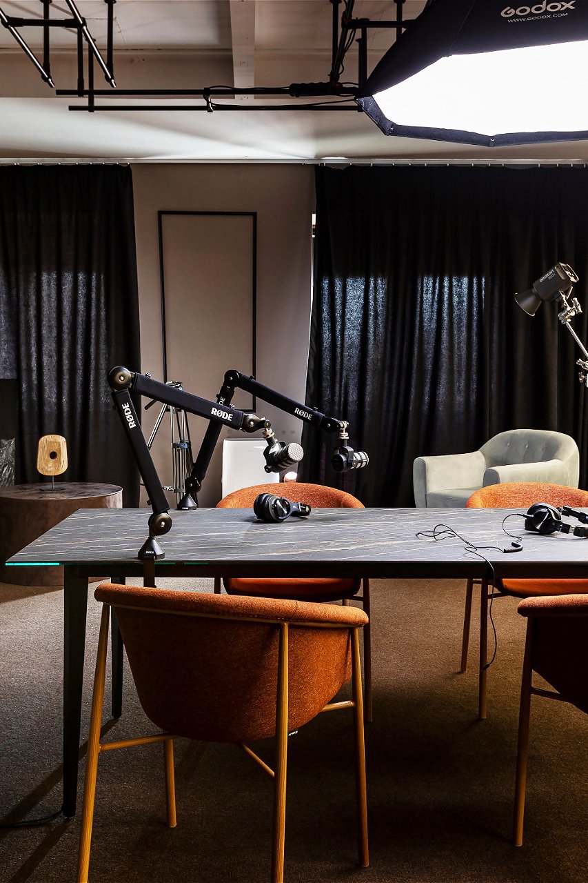 Зонирование строилось вокруг главной функции — записи подкастов и экспертных видеороликов. Центральная зона стала «якорем» интерьера, а терракотовые стулья Никсон от divan.ru — ее акцентом. Дополнительно создали модульные зоны: их можно использовать как фон для видеосъемок или переговорные места.