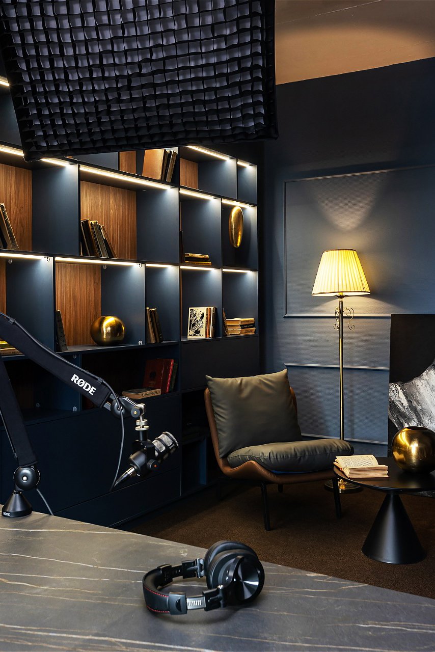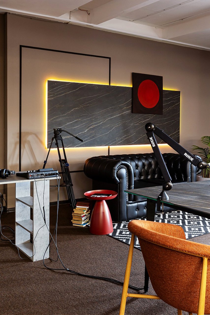 Чтобы создать ощущение глубины и атмосферы, использовали контраст материалов (гладкие и фактурные поверхности), игру света и цвета. Ставку сделали на сочетание практичных, устойчивых к эксплуатации материалов (легко очищающихся и долговечных) и акцентных решений, которые в кадре смотрятся эффектно. На полу — ковролин, уложенный поверх ламината, который был изначально. Для студии подкастов важно, чтобы поверхность пола поглощала звук. На потолке — металлический каркас, на который навешивается светотехническое оборудование. Сам потолок ничем не закрывали — он не попадает в кадр при записи.
