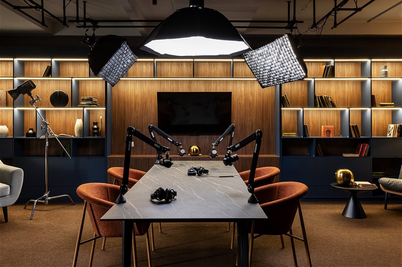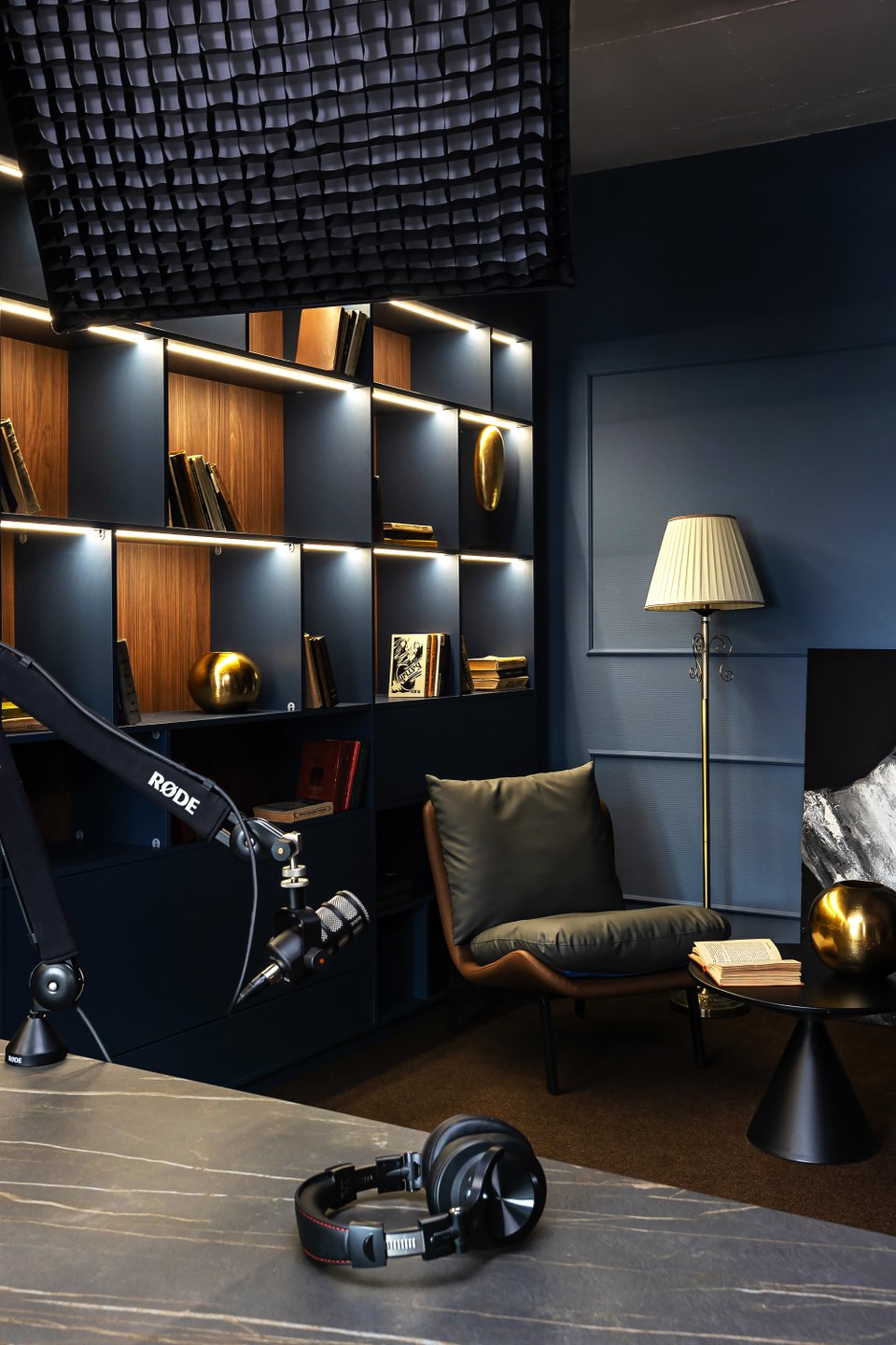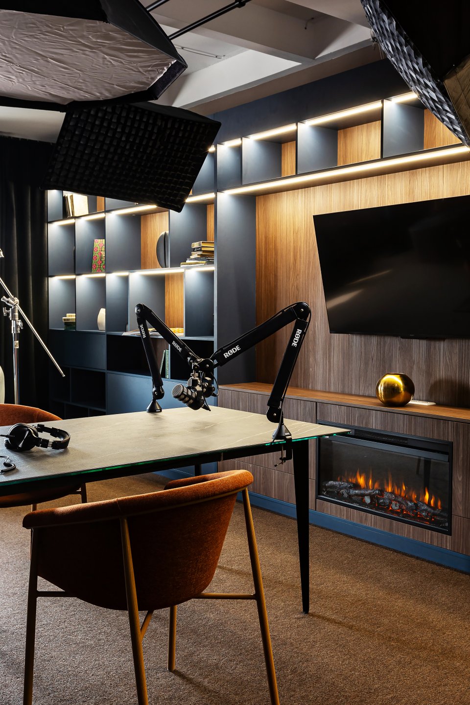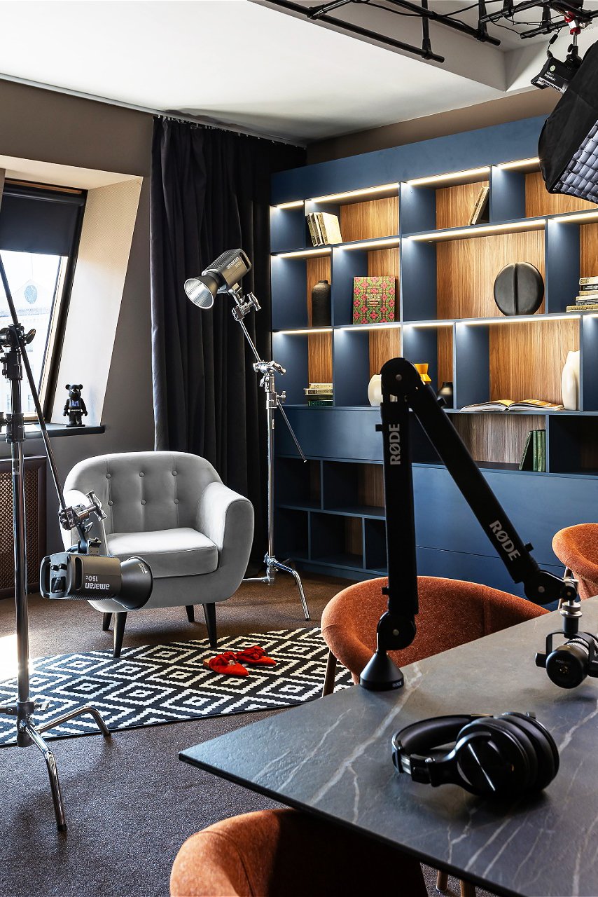 «К нам обратился популярный блогер и ведущий с необычной задачей — создать трансформируемый интерьер студии для записи подкастов, — рассказывают дизайнеры. — Заказчик давно работает в медийной сфере, поэтому важно было спроектировать пространство, которое не только привлекало бы клиентов и соответствовало их запросам, но и становилось выразительным, запоминающимся фоном для экспертных видео. Подобных решений в Беларуси еще не было».