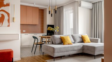 - На фото 4: минималистичная однушка 40 кв.м, ЖК «Крылья». В кадре диван угловой Онте от divan.ru. Дизайнер: Кристина Личик; стилист: Наталья Балашова; фотограф: Анастасия Кутырина