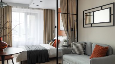 Типовую планировку квартиры от застройщика не меняли. Для разделения кухни-гостиной и спальни была установлена стеклянная раздвижная перегородка, которая сохраняет визуальную прозрачность и позволяет естественному свету свободно проникать в обе зоны.