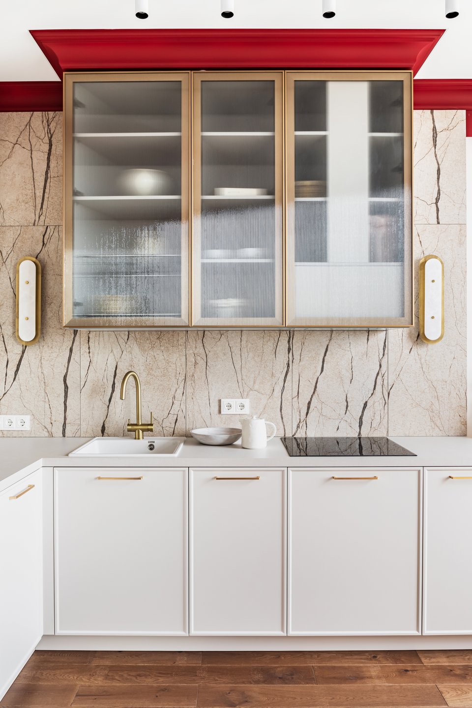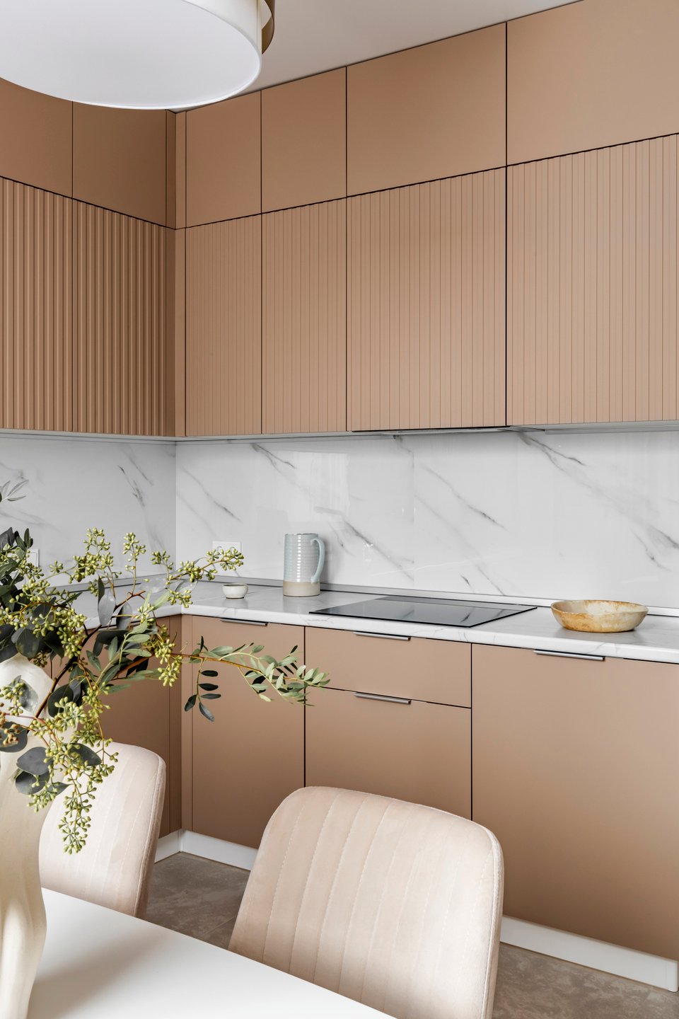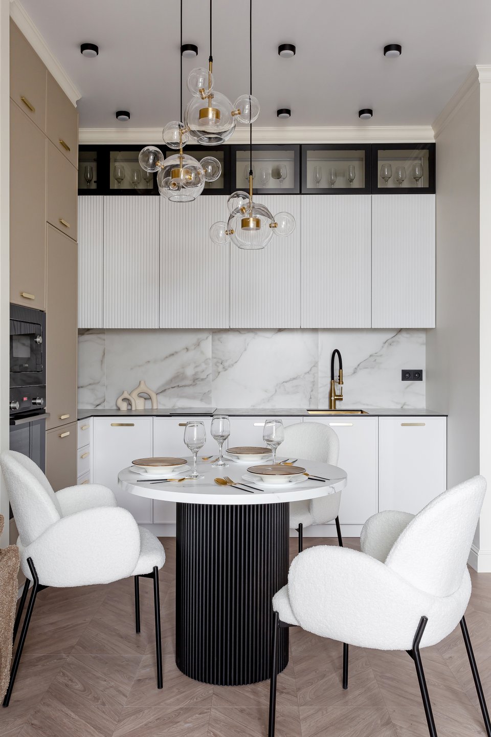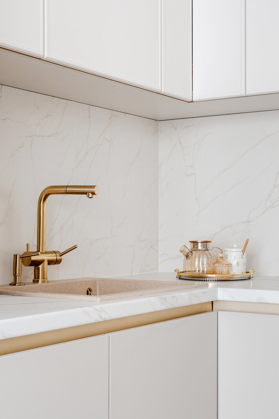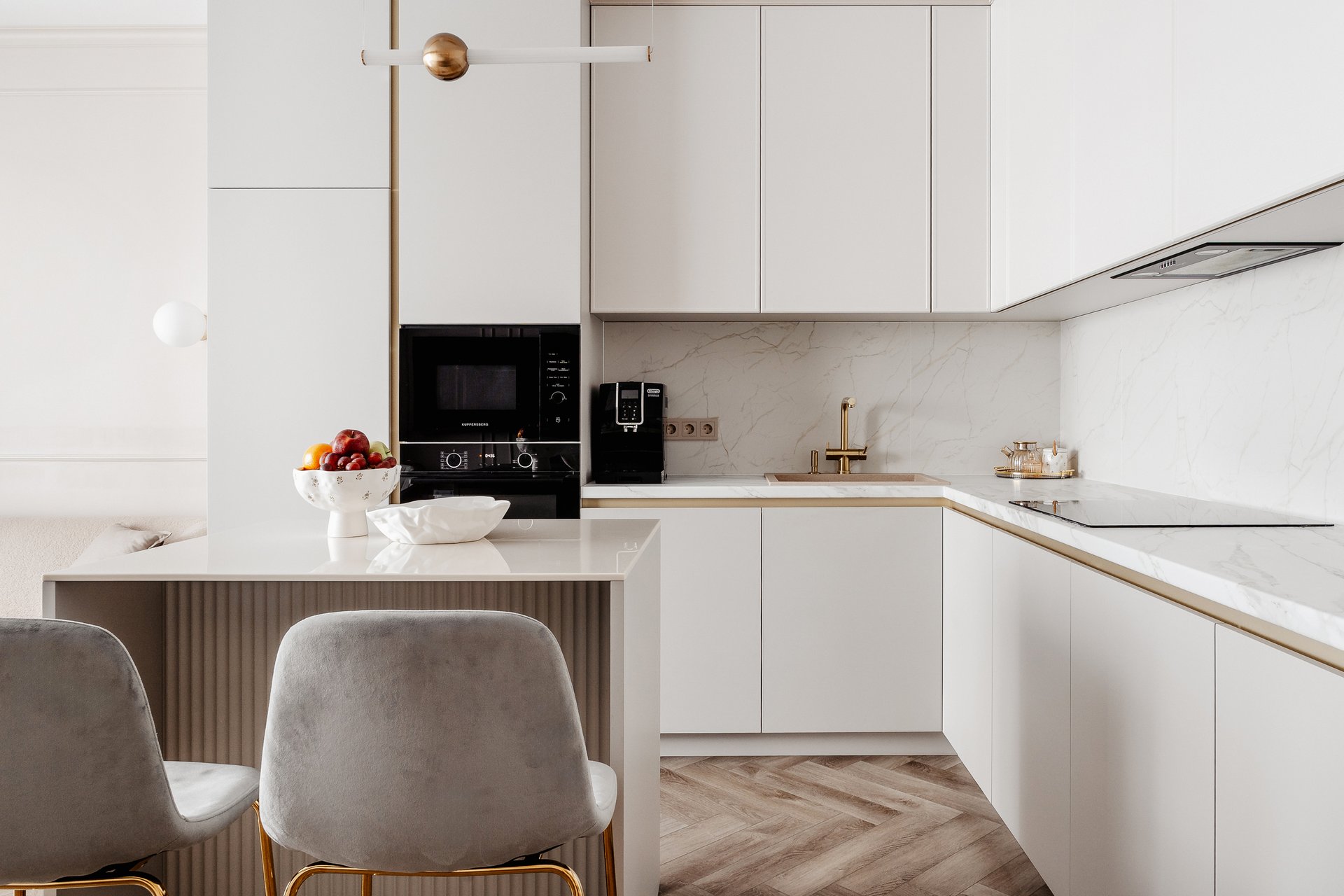 На практике это может выглядеть так: стены, окрашенные в цвет шампань, молочный матовый гарнитур с филенкой и столешницей из серого мрамора. В более современных вариантах оттенки белого комбинируют с золотом и яркими акцентами — получается стильно и необычно.