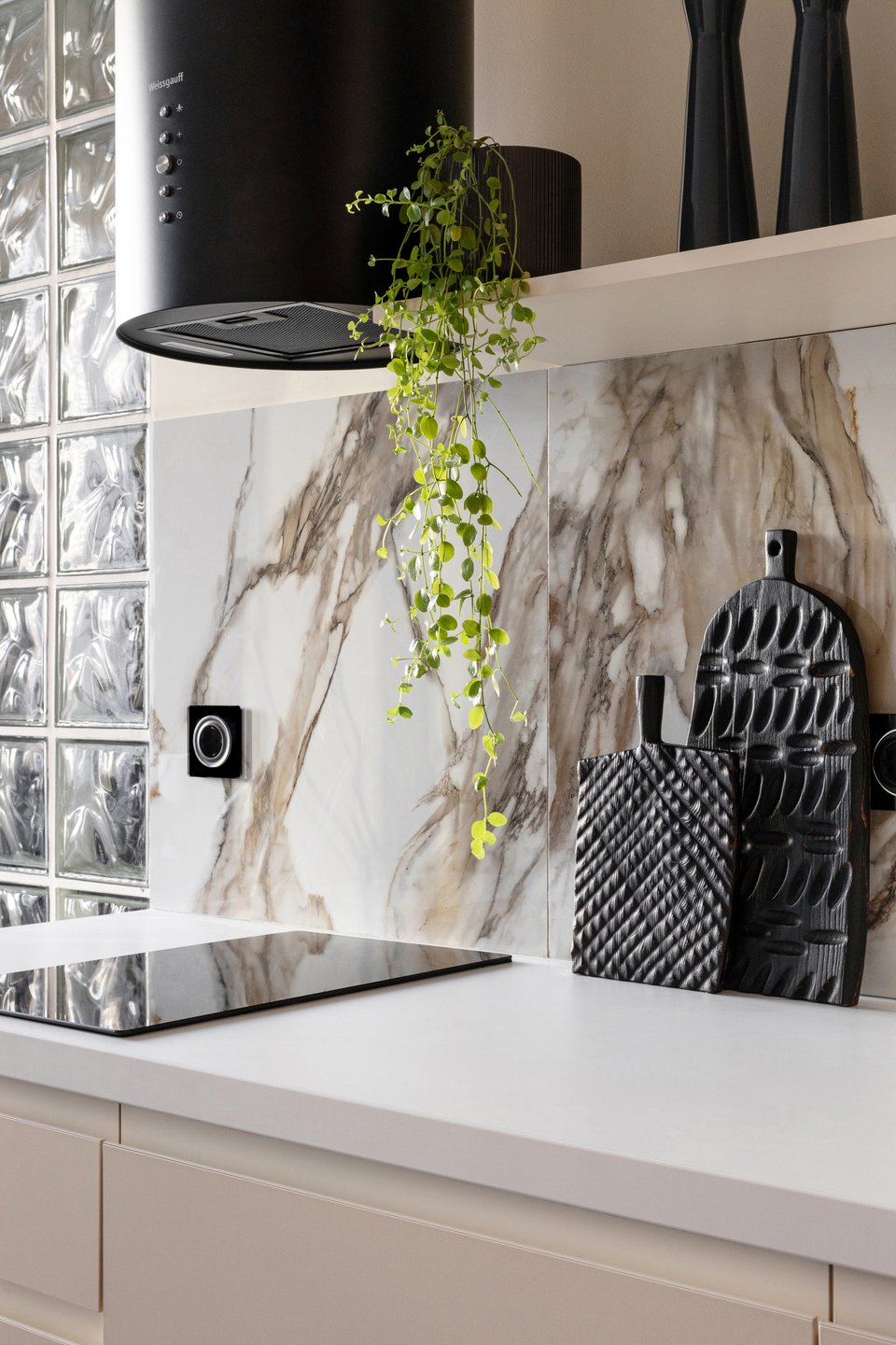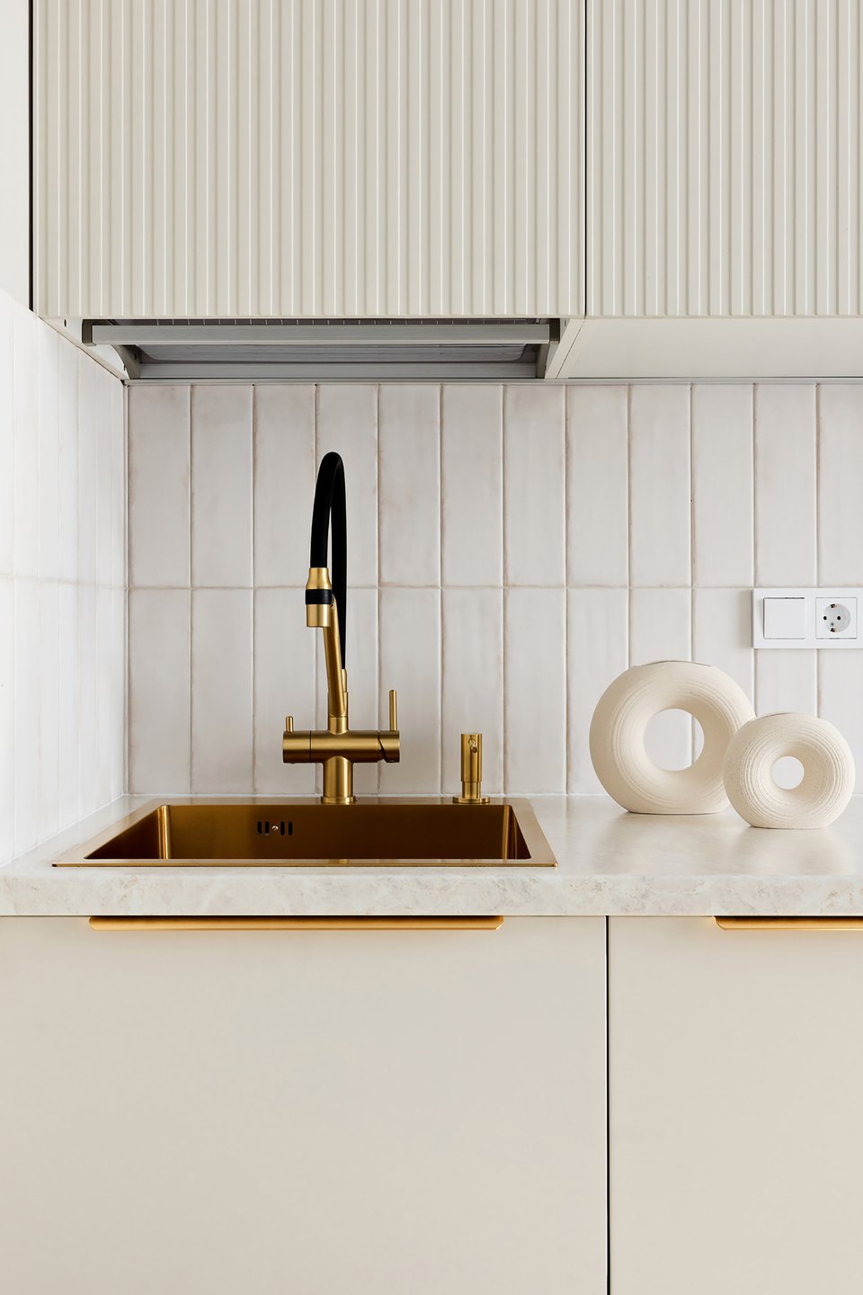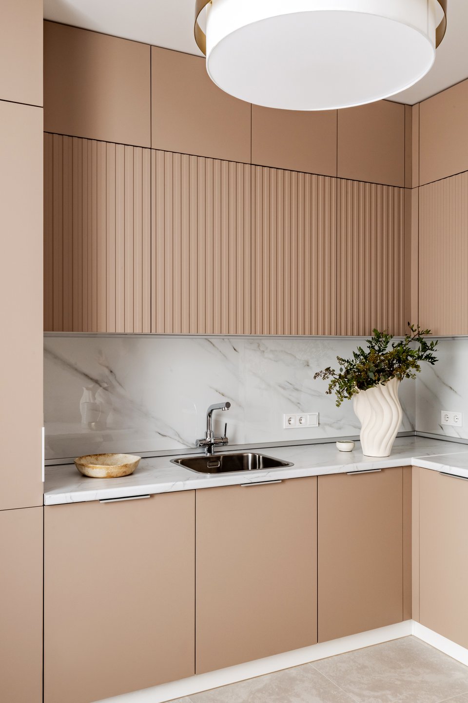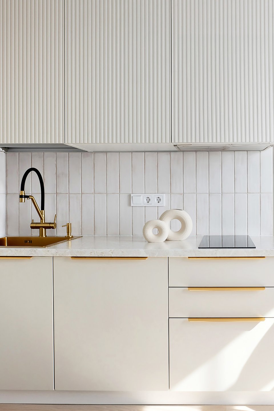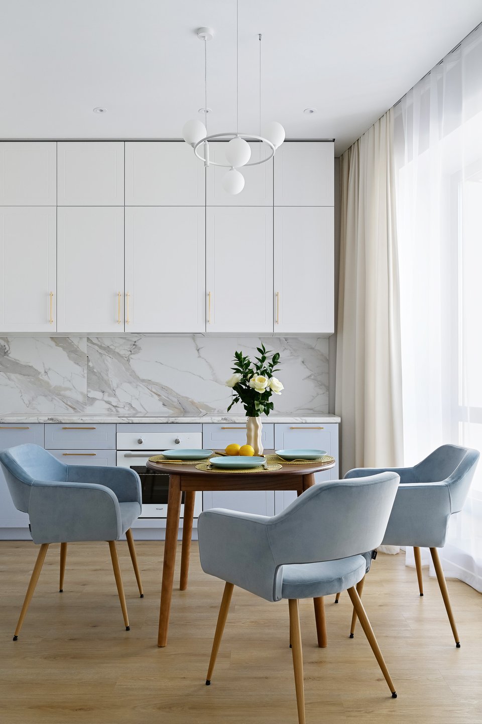 На практике это может выглядеть так: стены, окрашенные в цвет шампань, молочный матовый гарнитур с филенкой и столешницей из серого мрамора. В более современных вариантах оттенки белого комбинируют с золотом и яркими акцентами — получается стильно и необычно.
