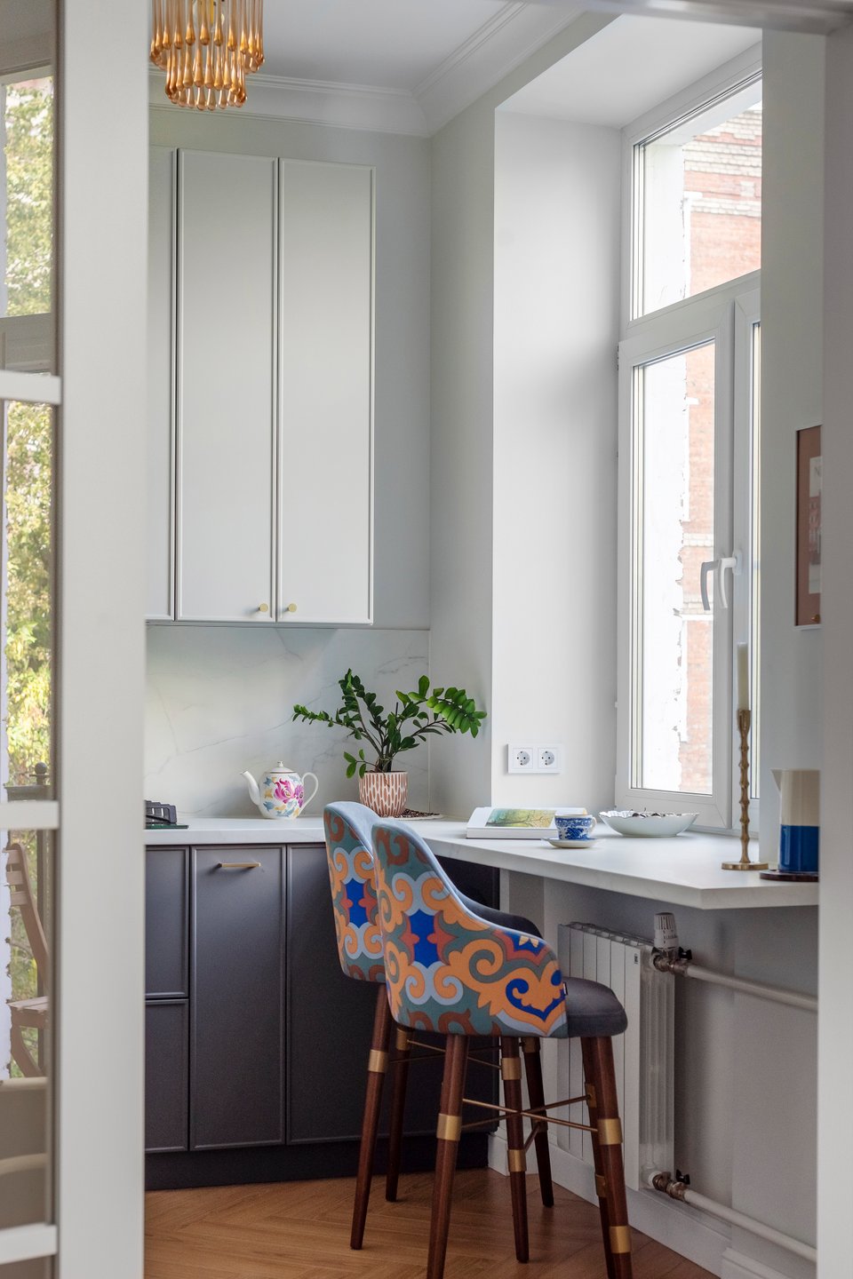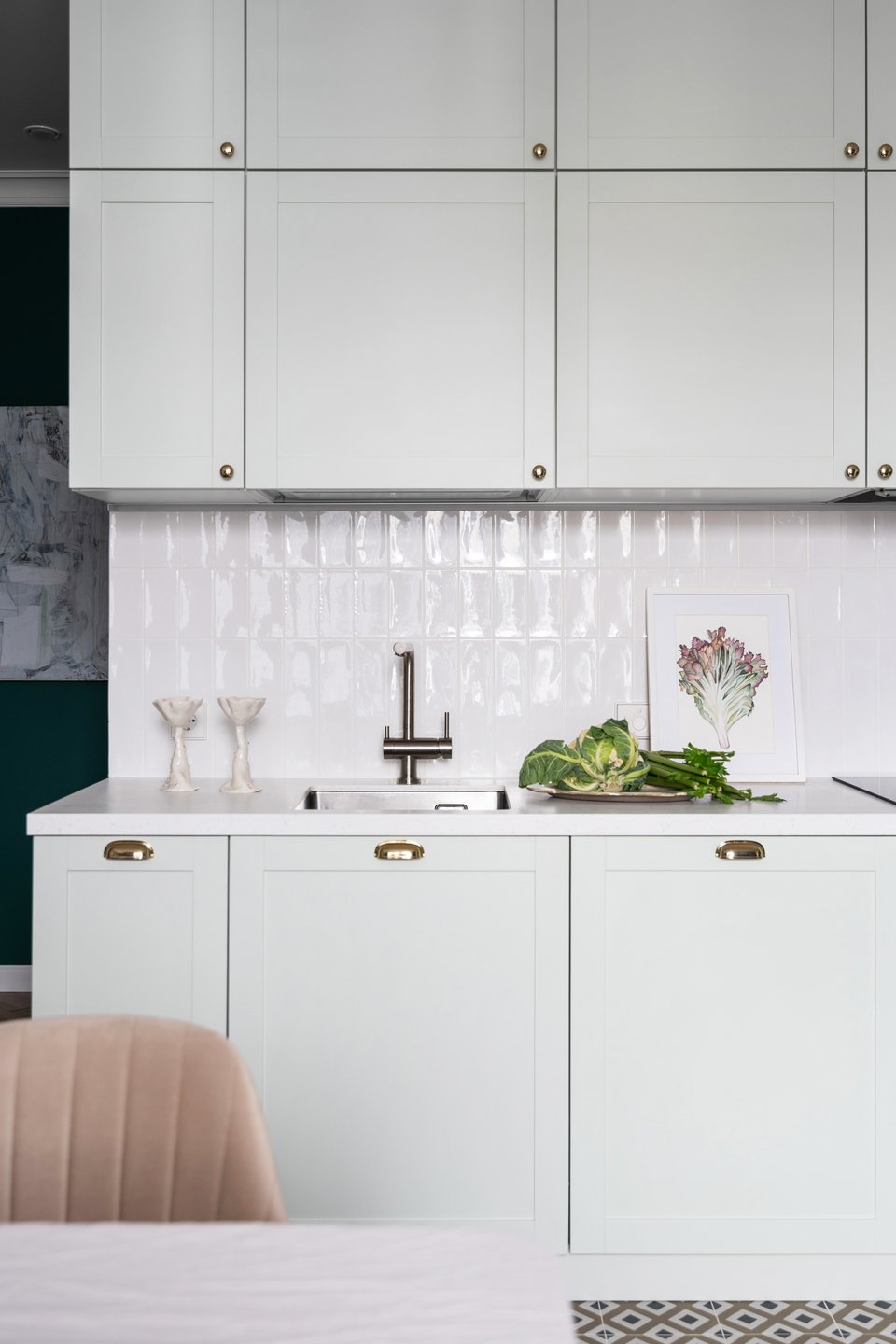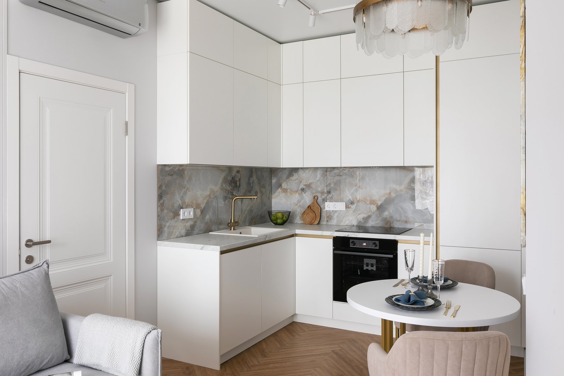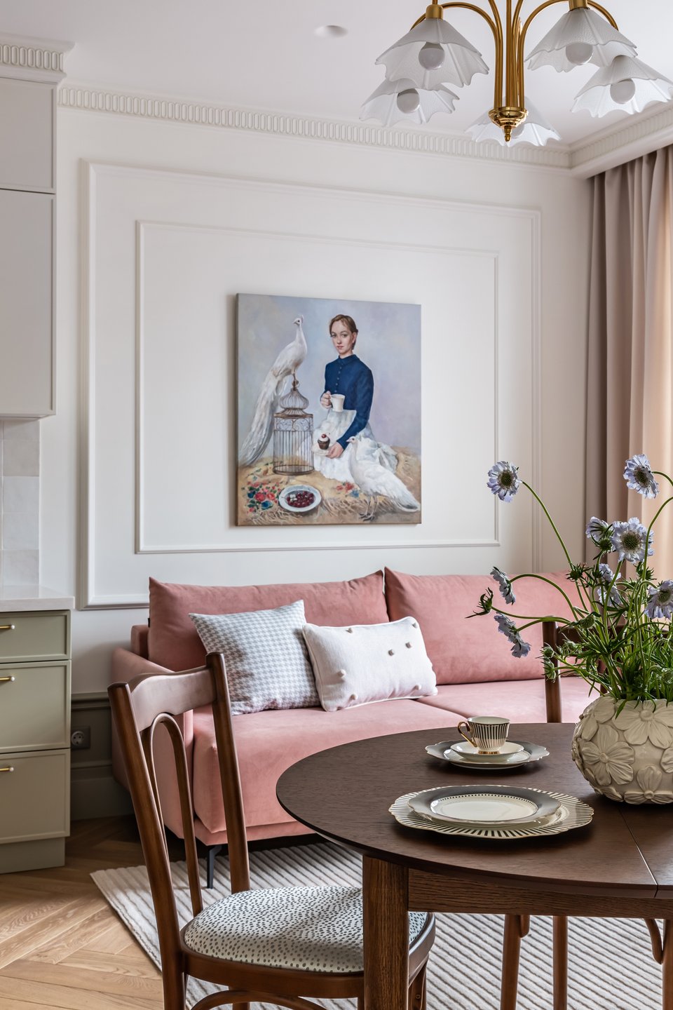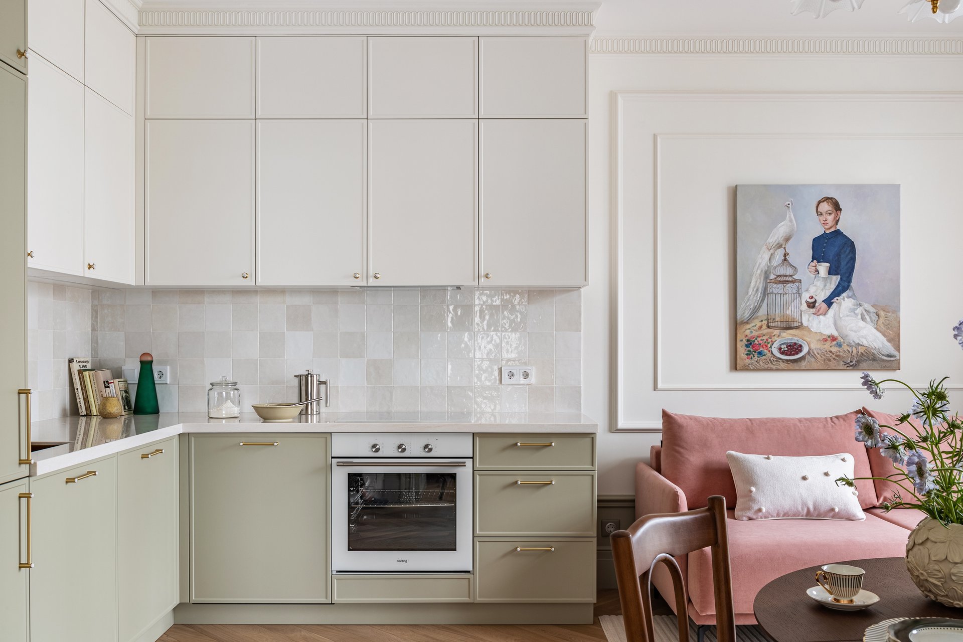 На фото: дизайн светлой классической кухни в интерьере евродвушки 40 кв.м, ЖК «Квартал Федерация». В кадре диван прямой Шилдс от divan.ru. Дизайнер и декоратор: Наталия Исакова; фотограф: Татьяна Ульянова
