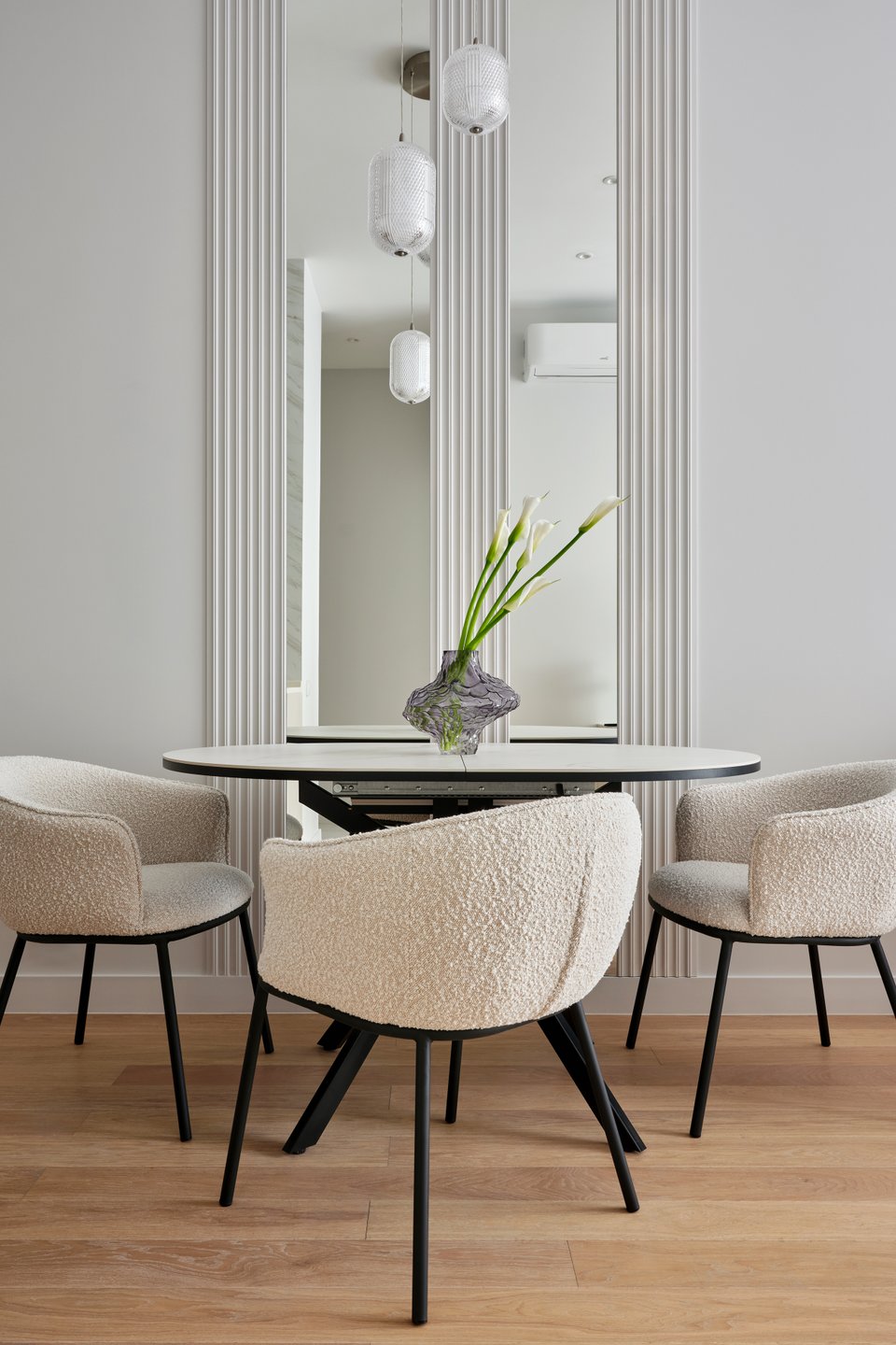 - На фотографии 1: трешка 116 кв.м, ЖК «Аллея Парк». В кадре диван угловой Спейс-1 и стулья Никсон — все от divan.ru. Дизайнер: Светлана Плетнева; фотограф: Владислав Нагин
