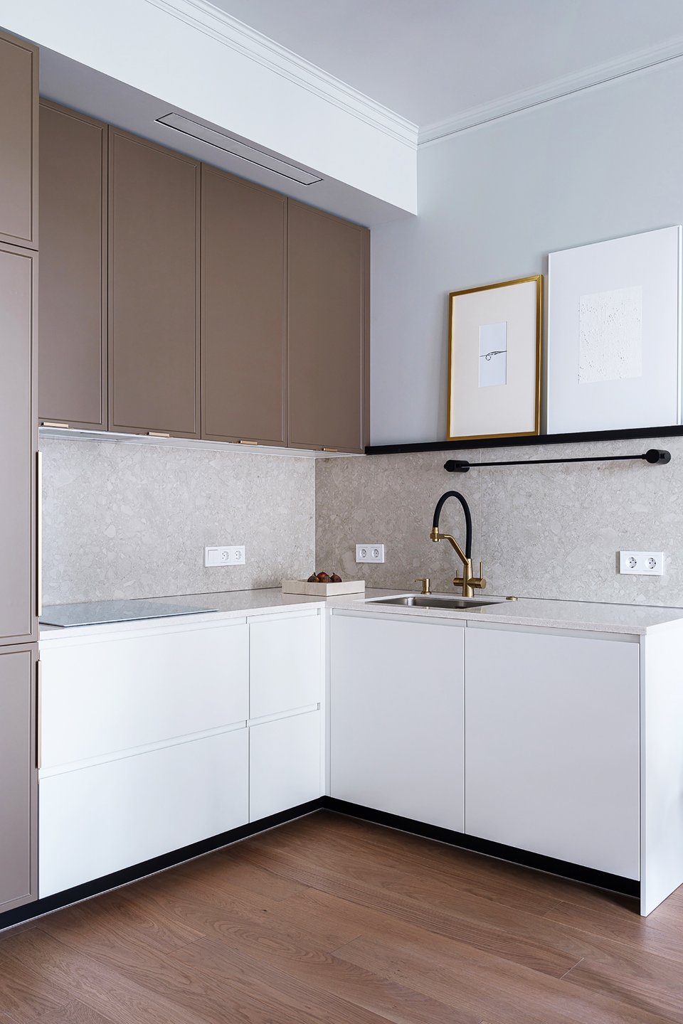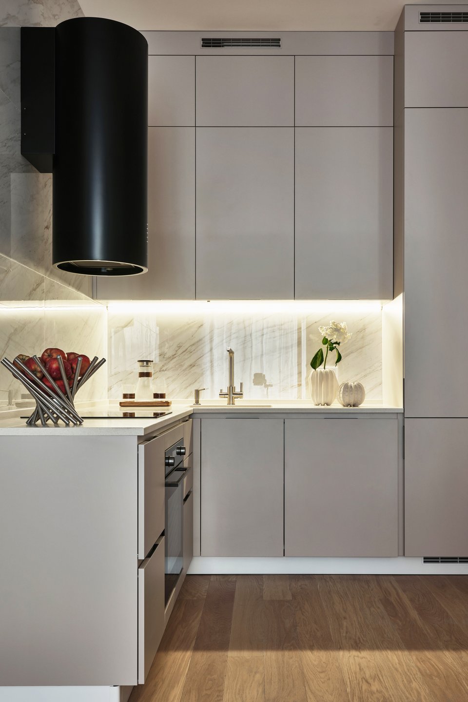 Другой вариант — максимально замаскировать место для готовки, установив гарнитур без верхних шкафов.