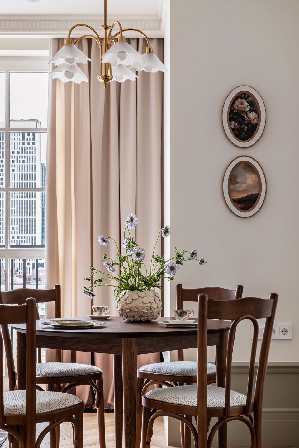 Для украшения помещения обычно используют шторы из плотного льна или хлопка с ламбрекеном, скатерть на обеденном столе, фарфоровые сервизы за стеклом фасадов, настенные картины, живые цветы в изящных вазах. Все это оживляет пространство и делает его индивидуальным.