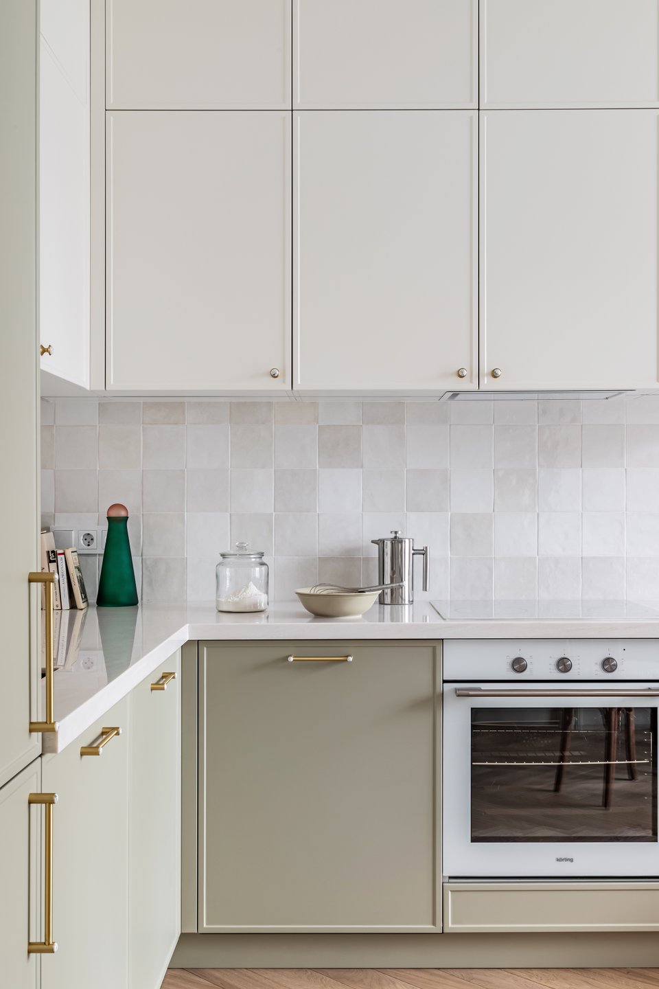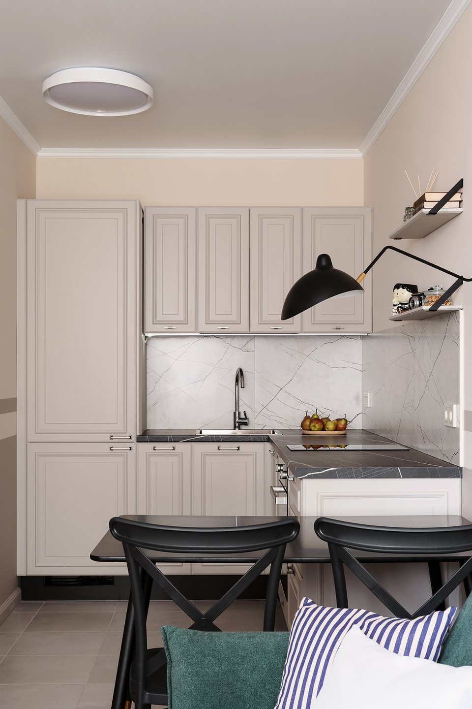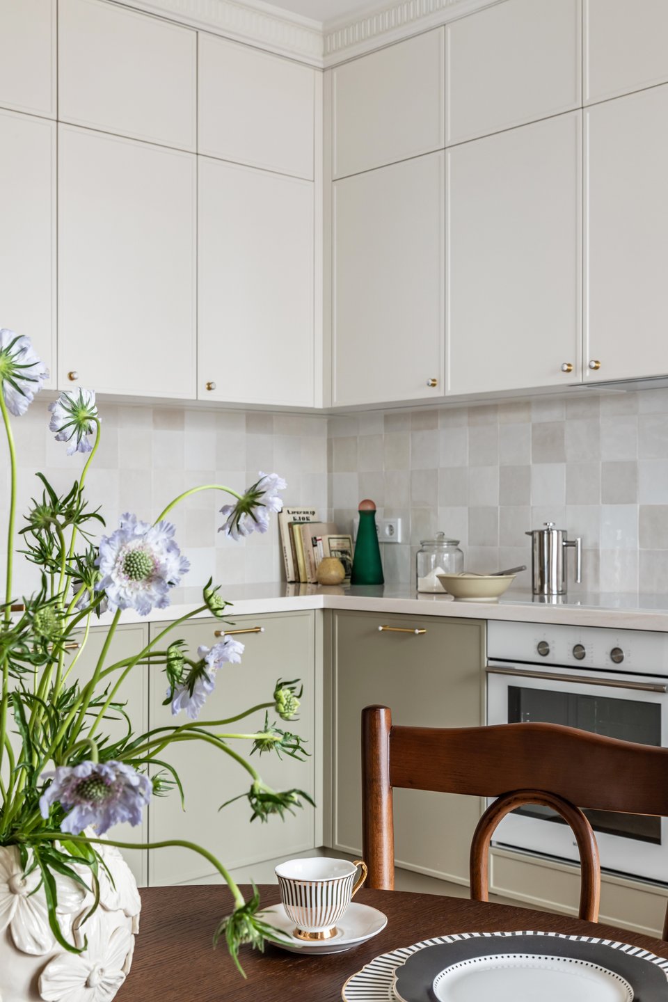 На фото: дизайн классической кухни в светлых тонах в питерской евротрешке 58 кв.м. Дизайнер: Илона Ореховская; архитектор: Екатерина Лоскутова; декоратор: Нина Симонова; фотограф: Маргарита Низамова