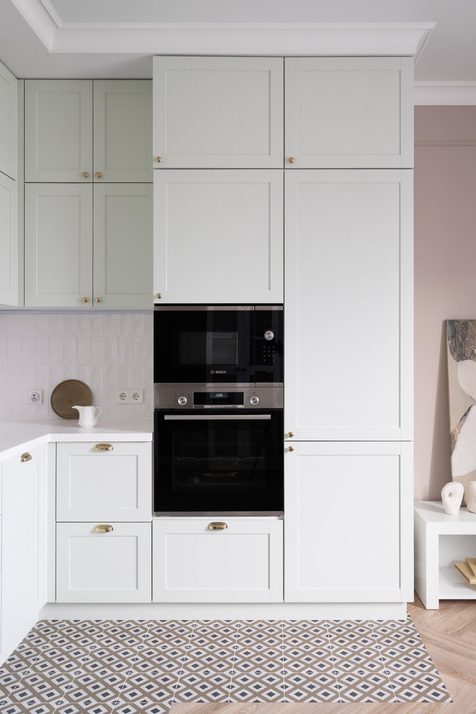 На фото: дизайн кухни в классическом стиле в светлых тонах в трешке 75 кв.м, ЖК «Западный порт». Дизайнер: Наталия Седова; декоратор: Катя Шаповалова; фотограф: Женя Муравьева