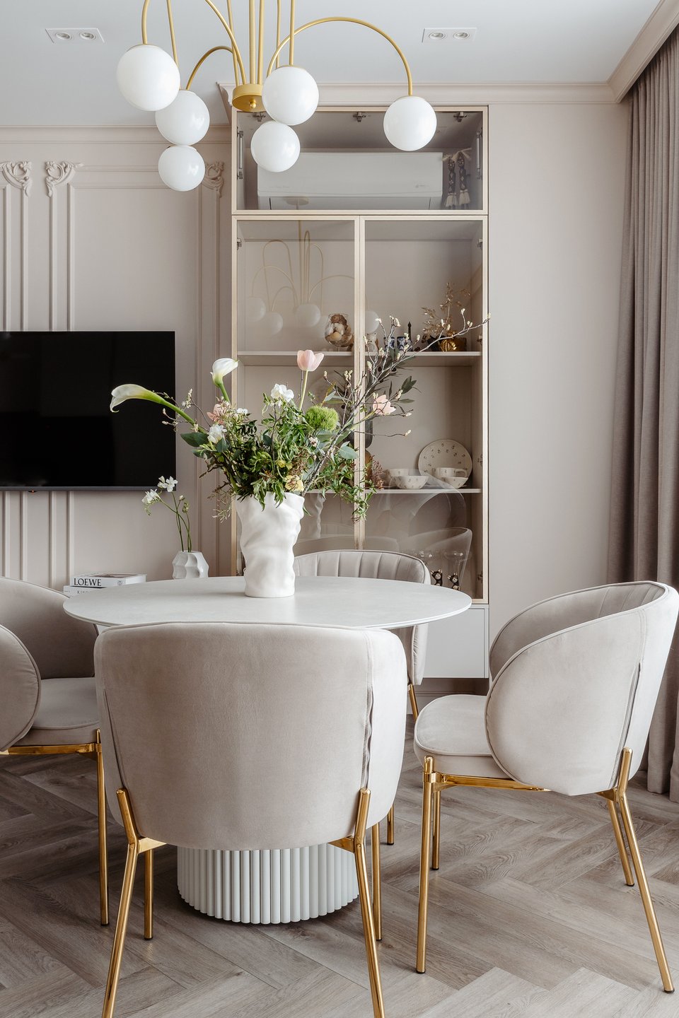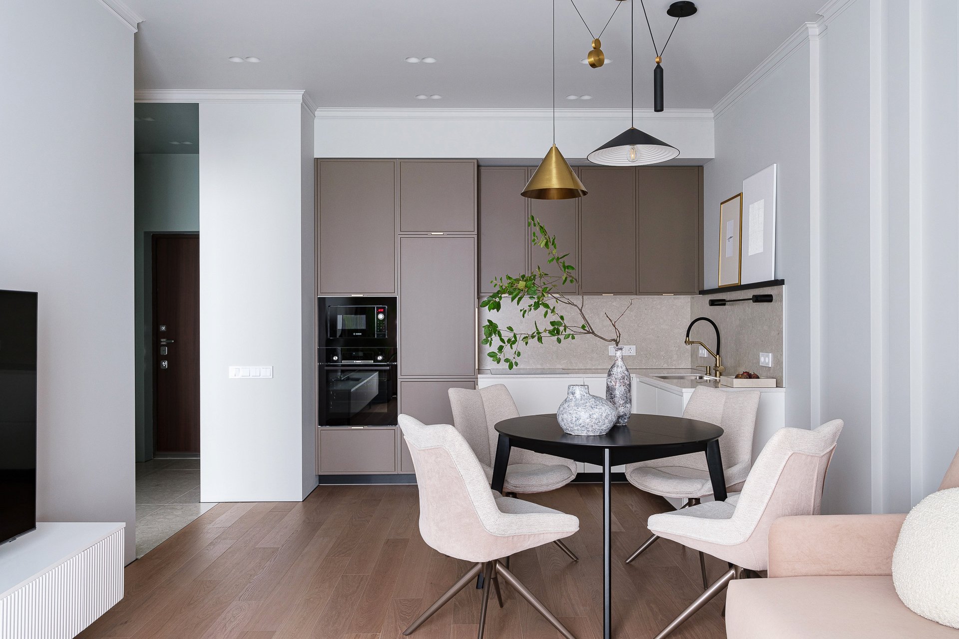 Такие решения отлично подходят для создания спокойной и утонченной атмосферы, лишенной резкости и напряженности. Неяркая база является идеальным фоном для более насыщенных, но сдержанных акцентов, которые добавляют пространству глубины и характера.