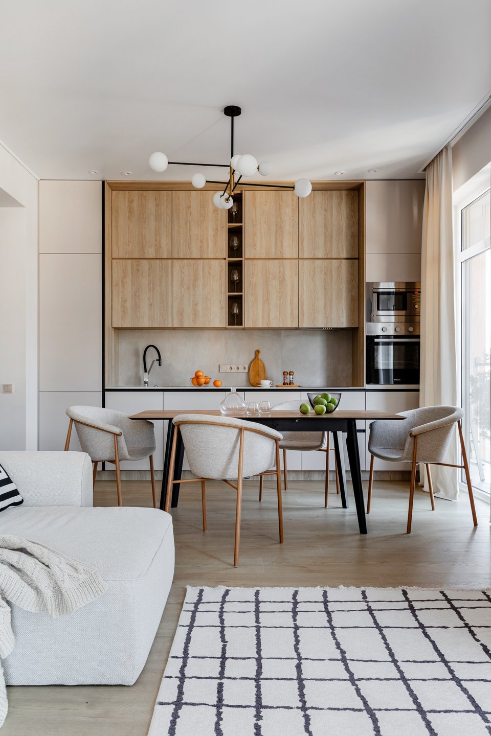 В просторном совмещенном пространстве дизайн раскрывается во всей красе. А кухонный остров или изящная барная стойка становятся естественным разделителем зон.