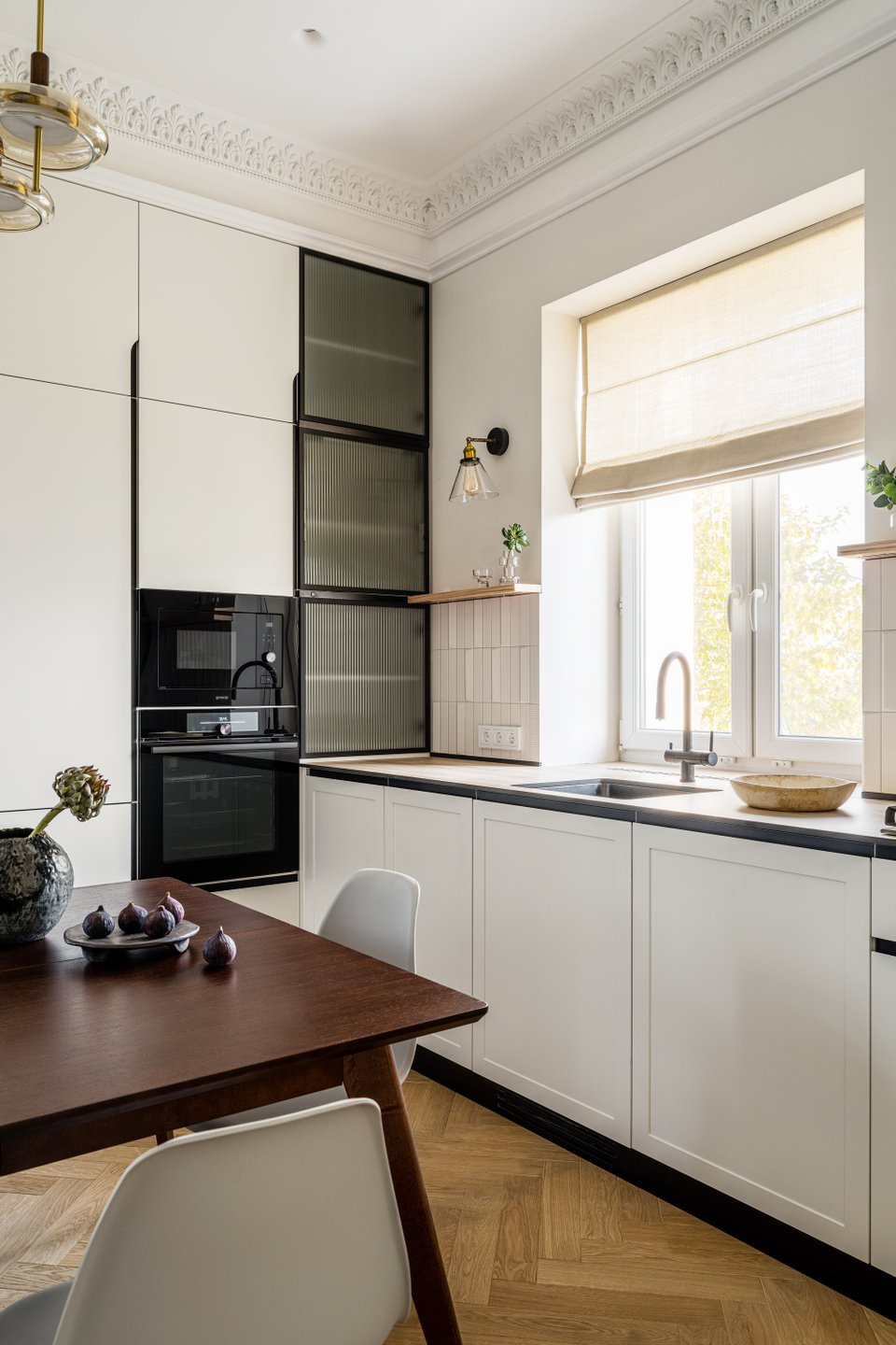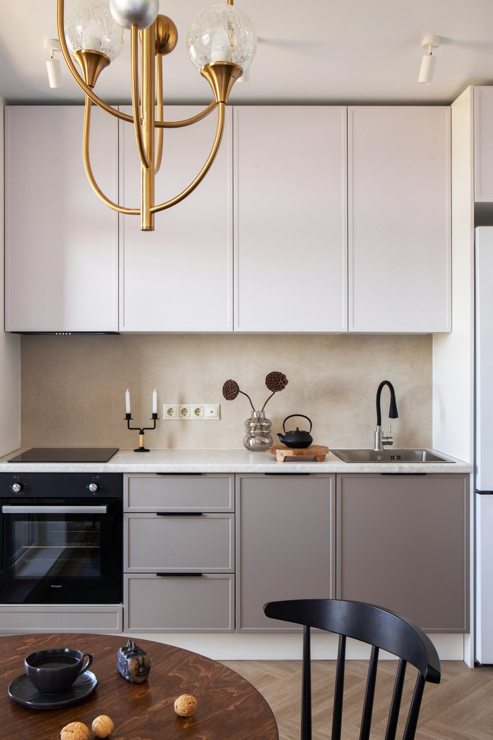 - Классический стиль универсален и подходит для пространств любого размера и конфигурации, будь то уютная кухня в хрущевке, просторная угловая или совмещенная с гостиной. Главное — адаптировать масштаб мебели и деталей под конкретные условия, не жертвуя основными принципами направления.