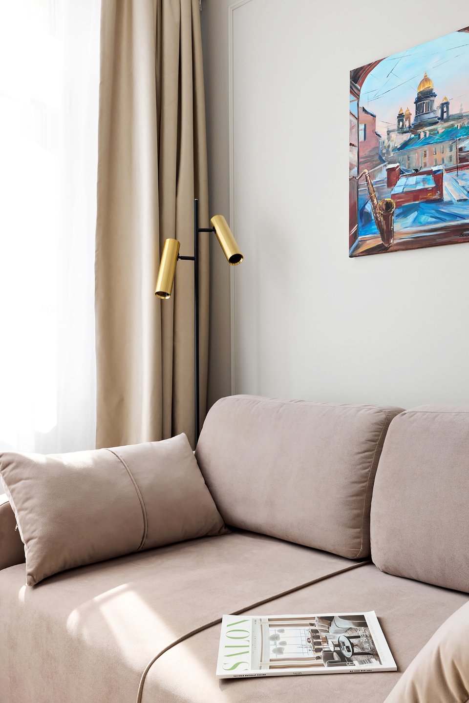 На фото: евротрешка 59 кв.м, ЖК «Белый Остров». В кадре диван прямой Слипсон от divan.ru. Дизайнеры: Ольга Трехонина и Анна Посохова; фотограф: Александр Макен