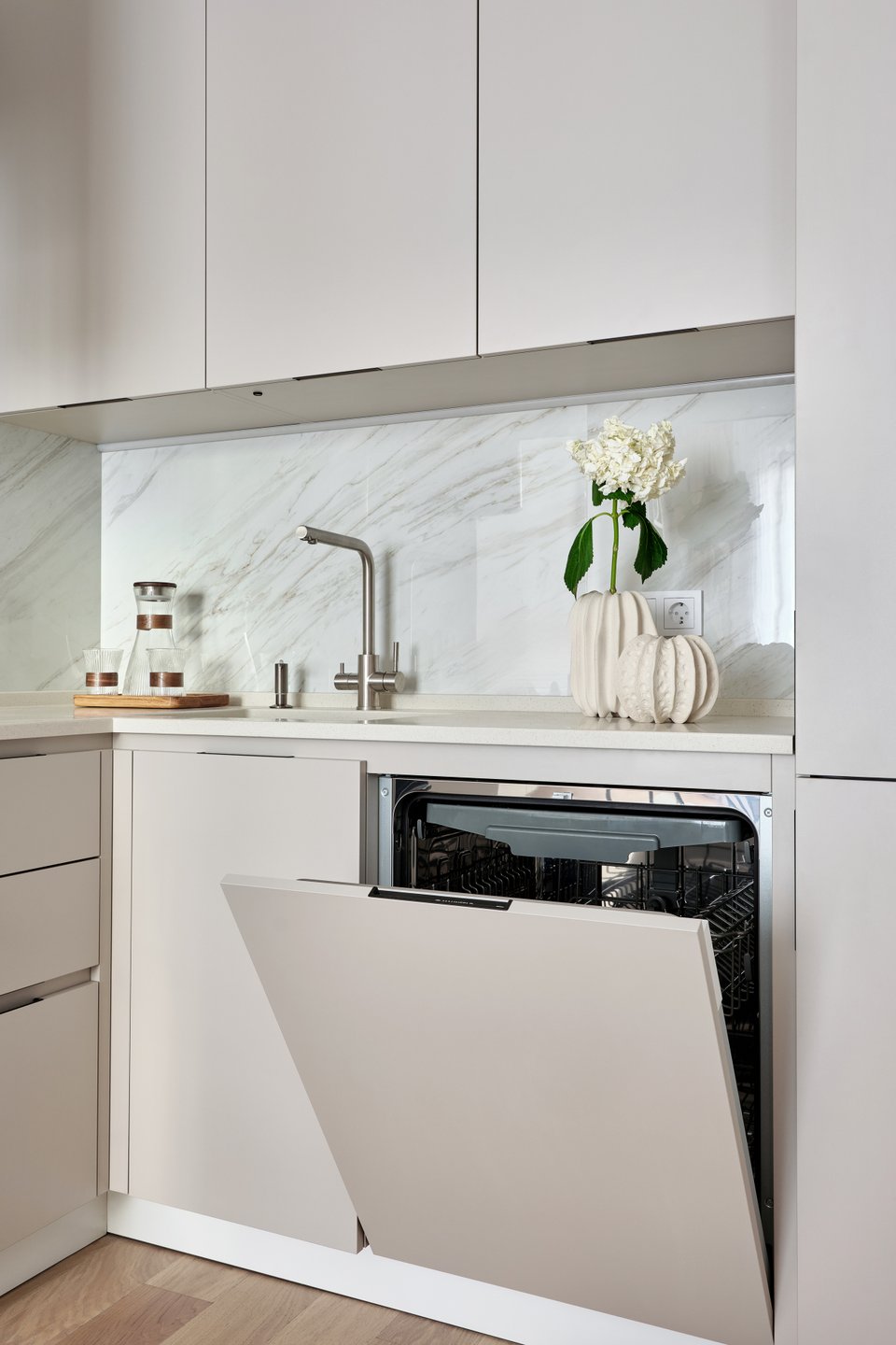 Белый, бежевый и светло-серый — основа эстетики, которая ассоциируется с чистотой, благородством и простором. В реальных условиях городской квартиры они компенсируют нехватку естественного света, визуально расширяют границы помещения и служат идеальным фоном для изящного декора и мебели.