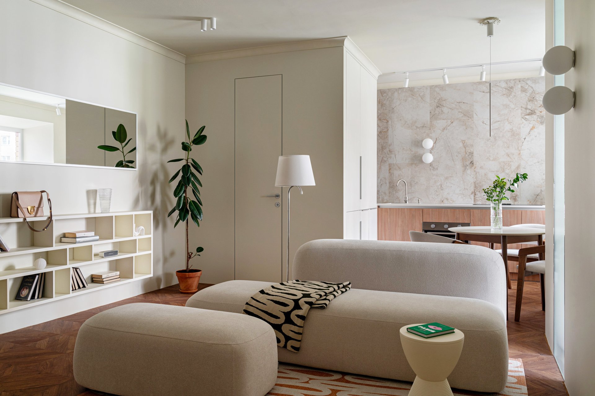 На фото: трешка 60 кв.м в г. Казани. В кадре диван прямой Риббл-9, пуф Риббл-20 и плед Lotus — все от divan.ru. Дизайнеры: Марьям и Антон Разуваевы, студия 2R BURO; фотограф: Александр Бурнатов
